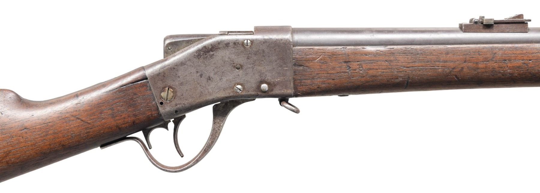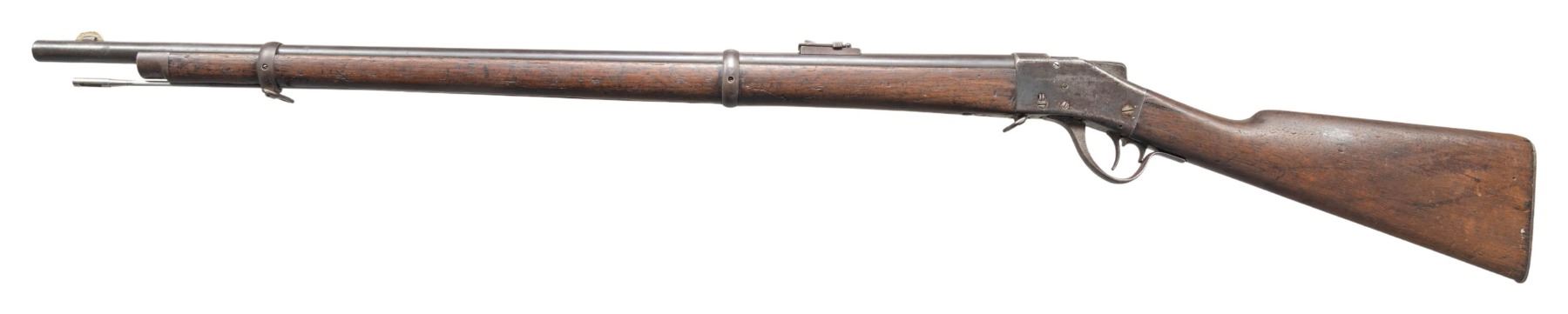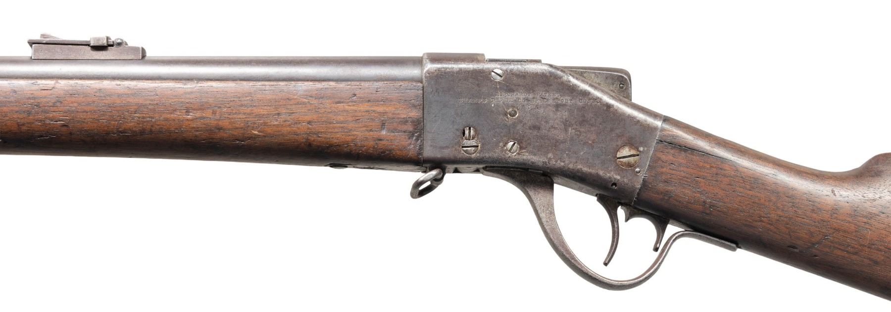 Cal. 45-70. S# 9815. Approx. 7,300 mfg. 1878-1881. Rnd. 32 1/8" barrel. German silver blade front sight & ladder rear sight. Hugo Borchardt patent hammerless falling block action. Walnut stock w/ replacement ramrod & checkered steel buttplate. CONDITION: barrel & receiver have dark brown patina appearance with peppery corrosion throughout, light marks & pinprick pitting. Wood has worn appearance with numerous dings, scattered large cracks & grain check cracks. Worn rifling with pitting. PROVENANCE: Estate of Groves Herrick. (01-28323/MD). ANTIQUE. $800-1,200.