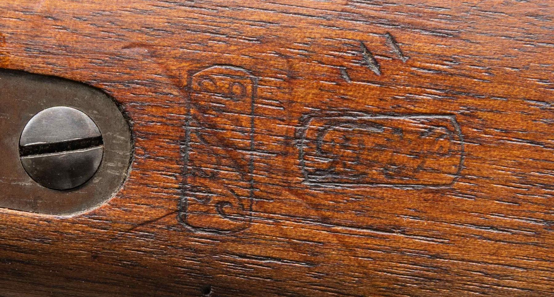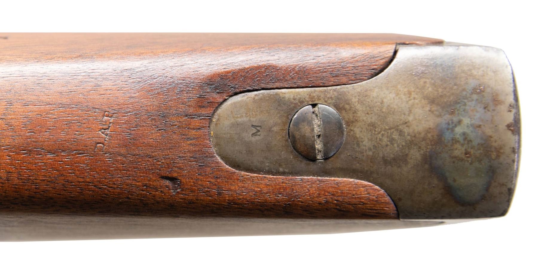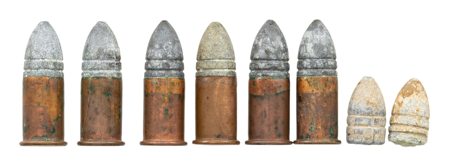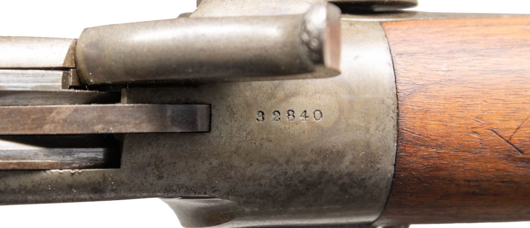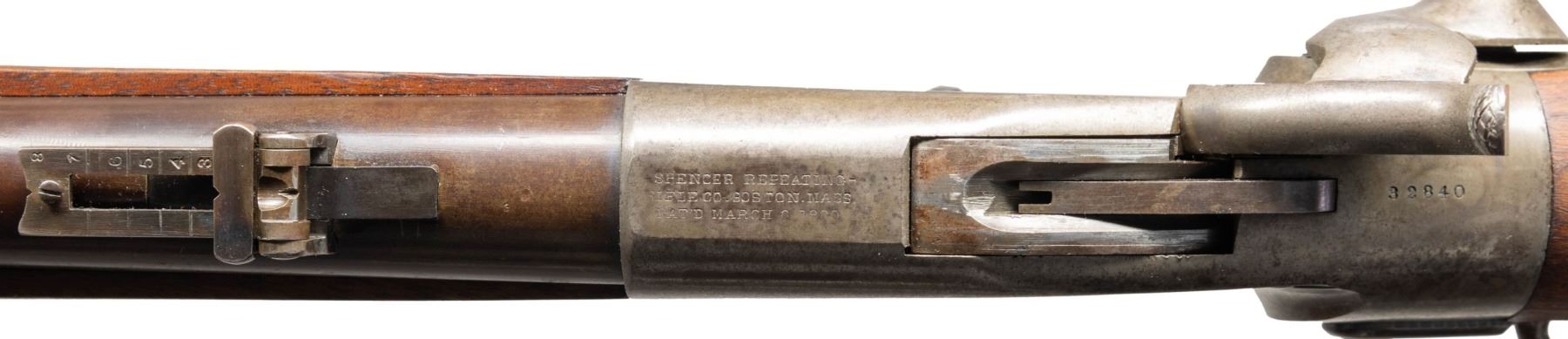Cal. 52 (56-52). S# 32840. Standard configuration, 22" barrel with 6 groove rifling, marked on receiver top flat "SPENCER REPEATING / RIFLE CO. BOSTON MASS / PAT'D MARCH 6 1860". Buttstock is arsenal upgrade with later inspection on top of comb. Over 90,000 of these popular carbines were purchased by the government. The Spencer was the first repeater rugged enough for military service. So formidable was its rapid fire that it was named the "horizontal shot tower" by the Confederates. The heavy casualties at Chickamauga inflicted by the Spencer rifles of Wilder's' brigade proved the value of the repeater in war. The many battlefield captured Spencers by Confederates could only be used till captured cartridges ran out. Copper was scarce in the South & one hundred percussion caps could be made from the metal required for one Spencer cartridge. Cavalry units from Michigan, New York, Wisconsin, Indiana, Connecticut, New Jersey, Ohio & Massachusetts were equipped with Spencer carbines. UNATTACHED ACCESSORIES: 6 original copper cased .56/.56 cartridges with two bullets (dug in 1974 at Hoover's Gap, TN by our consignor). CONDITION: very good overall, matching serial numbers on barrel and frame. Maker's mark is better than most and well struck, frame is smooth silvered patina, case color is retained in protected areas of breech mechanism. Barrel has overall plum patina with traces of blue in protected areas. (01-28143/JS). ANTIQUE. $3,000-4,000.
