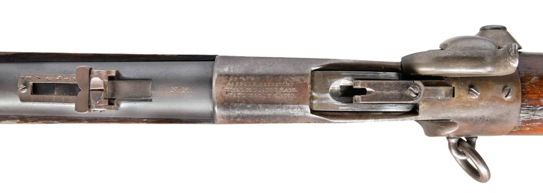 Cal. 50. S# 971. This is a scarce postwar manufacture using existing Civil War frames, and pivoting "Spencer Patent cut-off" in place of ejector on top of breechblock, which can disallow cartridges from loading tube just like Stabler devise on military contract guns. Serial numbered in its own range on the left side of the frame. 20" 3-land & groove barrel, "NM" stamped rear of adjustable rear sight. CONDITION: very good to fine, appears original, complete, & authentic, barrel retains about 80% thin blue finish, plum patina, breech components mismatched S# 837, no S# on barrel other than "1" stamped. Stocks sound with old varnish, scattered scratches, and small dings & dents. Drilled at the back of the frame for tang sight, breech has strong traces of case colors, Mechanics fine, including functional "Spencer patent cut-off". Shiny rifled bore. PROVENANCE: Estate Collection of John "Jack" Dhooghe. (01-28266/JS). ANTIQUE. $1,000-2,000.