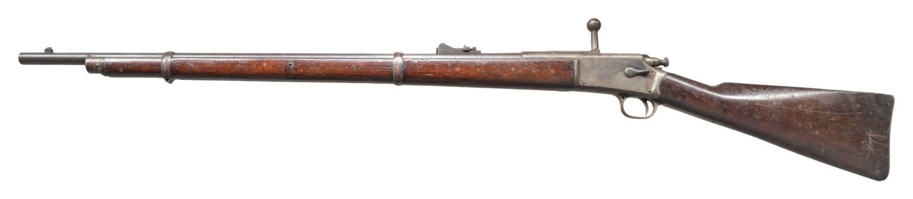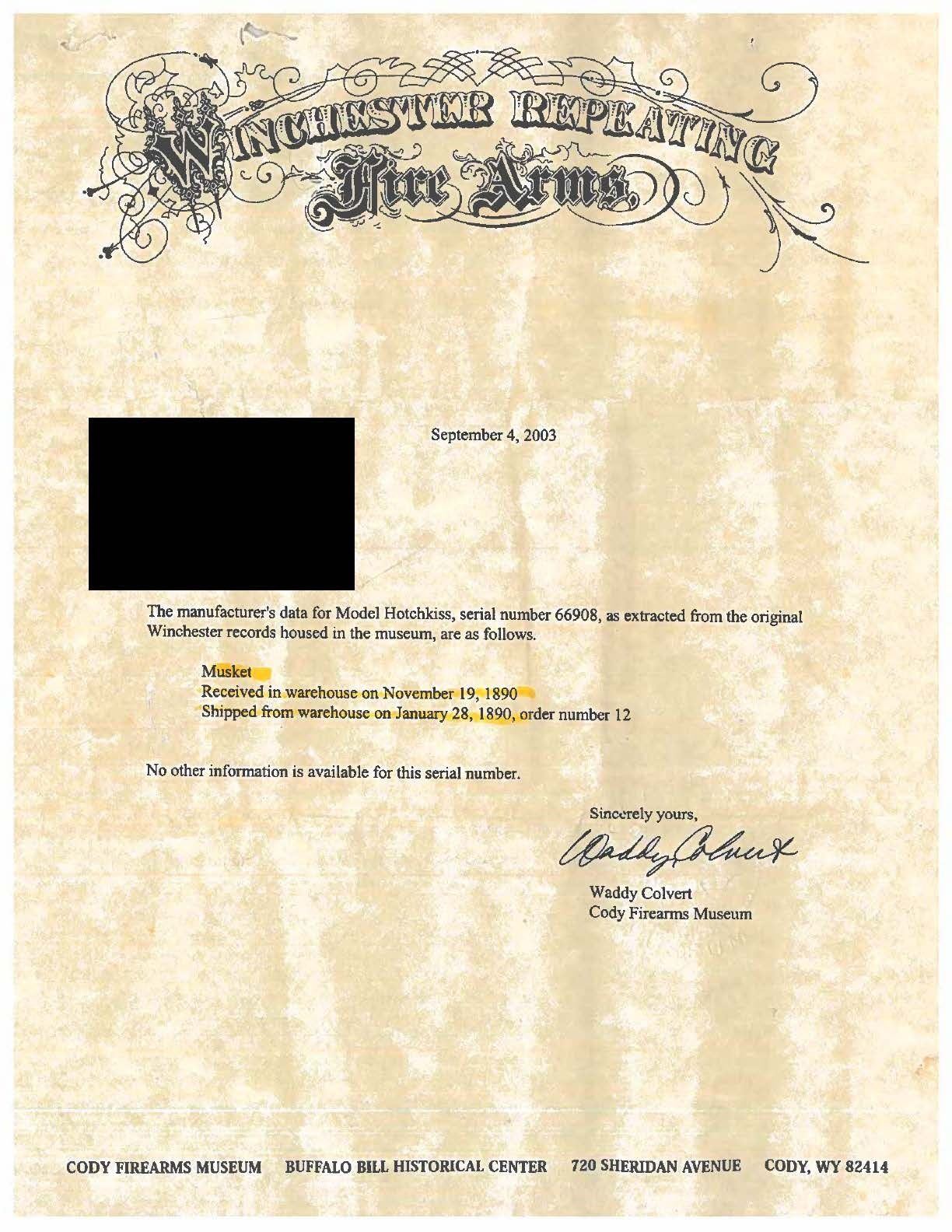 Cal. 45-70. S#. 66908. Bbl. 28* round. Pinned blade front with military style graduated leaf rear sight. Tubular magazine is located in the stock. Case colored action. Band fastened forend & walnut stock with steel buttplate. UNATTACHED ACCESORIES: Cody Firearms Museum letter dated 9-4-2003 and signed by Waddy Colvert. the letter states: "Musket / Received in warehouse on November19, 1890 / Shipped from warehouse on January, 1890, order number 12". CONDITION: dull faded bbl. blue shows scattered dark spotting. The action shows some fading case colors on its sides with scattered corrosion. The wood has added finish over wear & marks showing spots of mildew. Their is a 1 7/8" black inlayed repair behind the lower tang. The cleaning rod & trigger guard sling swivel are not present. Sound action. The lightly pitted bore retains sound rifling. (01-26768/DS). ANTIQUE. $1,000-1,500.