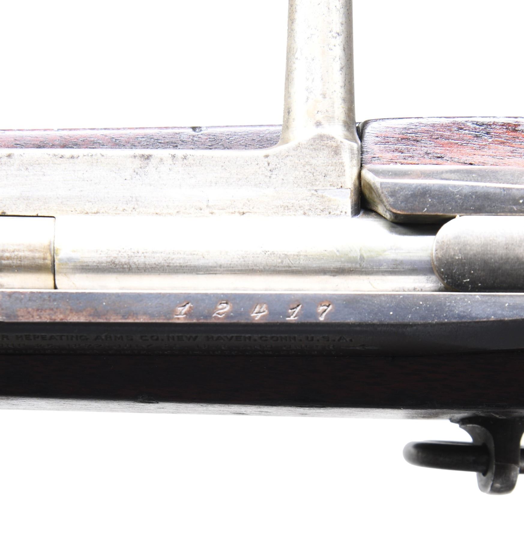 Cal. 45-70. S# 12417. Bbl. 24". Nice example of a 1st Model Winchester Hotchkiss carbine. Ladder rear sight graduated to 1,000 yards. Blade front sight. Receiver markings on left rail include "WINCHESTER REPEATING ARMS CO. / patent dates, the latest being 1877". Straight bolt handle. Unmarked walnut stock equipped w/ saddle ring on left side. Solid bbl. band retained by spring. Carbine style buttplate. Safety & mag. cutoff on right side. CONDITION: stock has moderate wear & handling marks scattered throughout w/ original finish. Notable loss of wood on both sides of forend behind bbl. band. Blued metal turning gray & patina w/ light wear & handling marks. Bbl. band is notably gray. Bright bolt turning gray & patina. Very good shiny bore w/ sharp lands. PROVENANCE: Estate of Russell Dickerman. (01-27102/RW). ANTIQUE. $600-1,000.