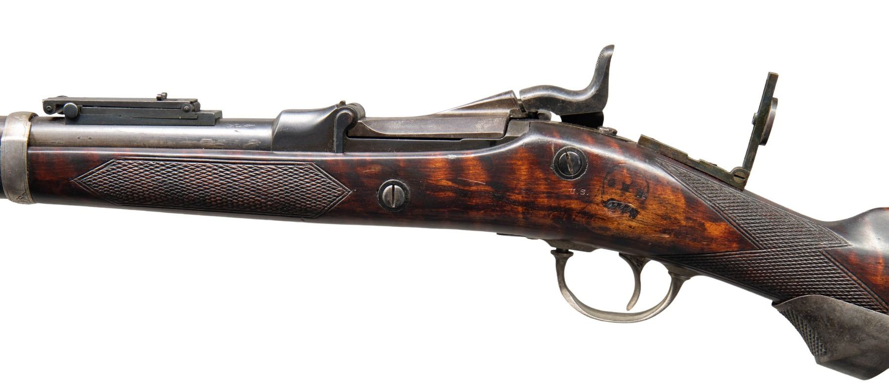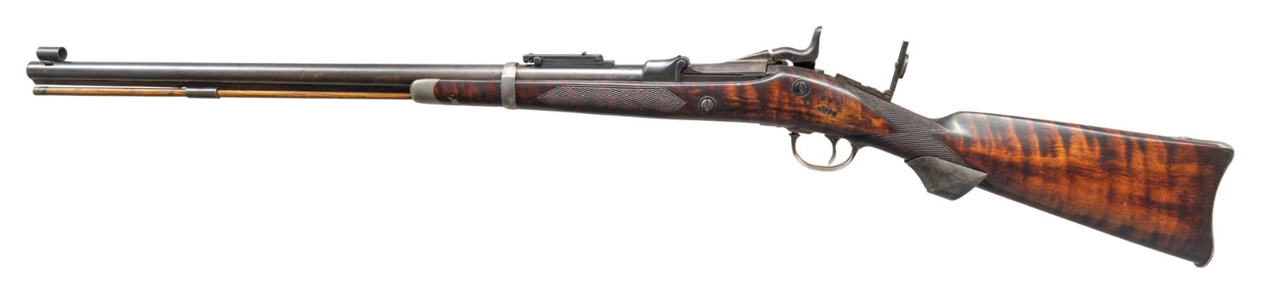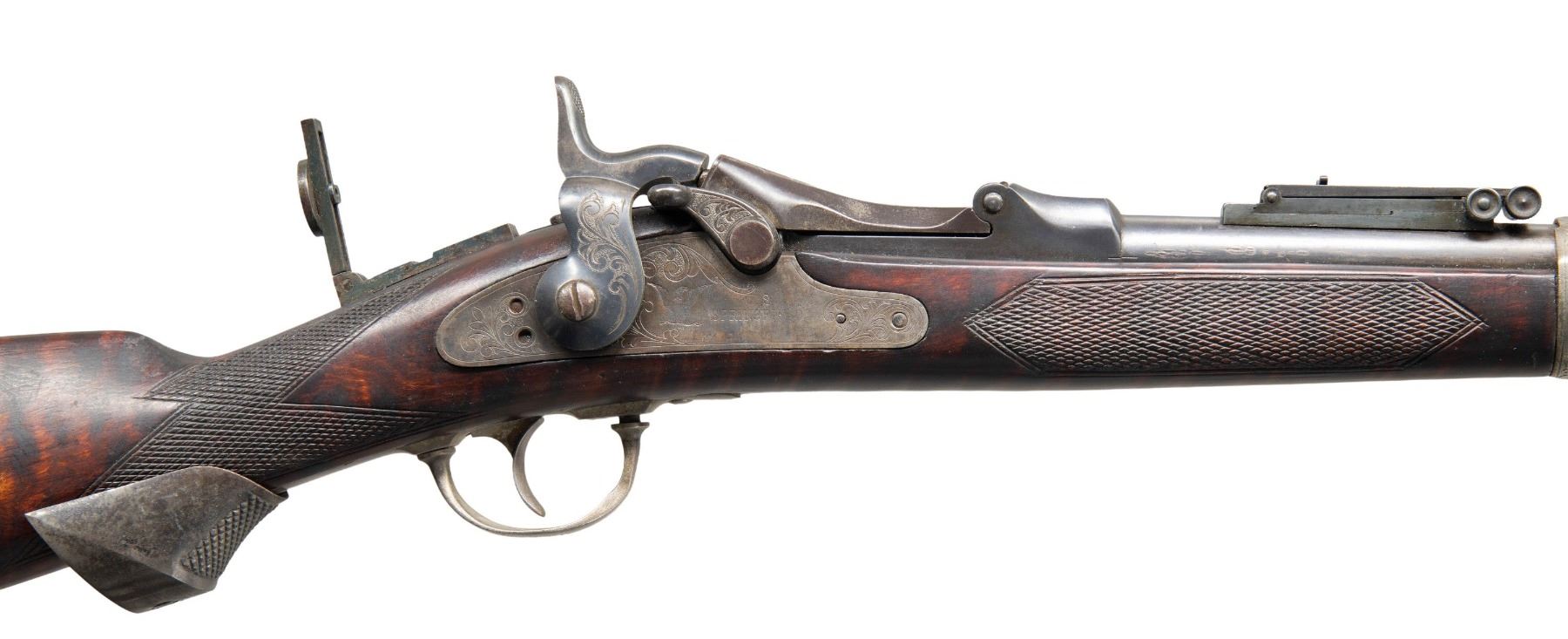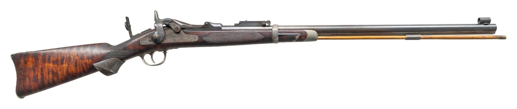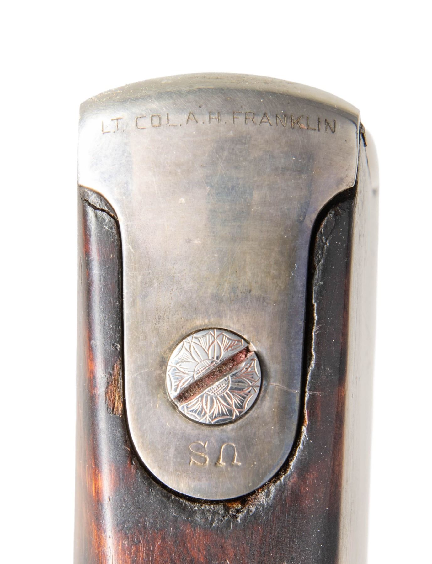 RIFLE. Cal. 45-70. NSN. Bbl. shortened to 25". Dovetail mounted globe front sight, Model 1884 Buffington rear sight, with a unidentified folding leaf tang sight with large disc aperture. Low arch "1873" dated Springfield breechblock and Springfield marked lock. Lock, hammer, breechblock, trigger guard, buttplate, and stock band have added foliate hand engraving done in the general style of the Officer's Model rifles. Band fastened sporter stock of fiddle figured hardwood with added coarse point pattern checkering. Additional features include a fancy finial pewter forearm cap and checkered steel pistol grip extension. Buttplate is nickel finish. Peak is marked "LT. COL. A.H. FRANKLIN". Left side of stock has apparent added markings "US" followed by "GMH" over a partially legible cartouche. Toeline of stock behind grip extension is stamped "P". Brass tipped hardwood ramrod is held on iron under rib by a single pipe. CONDITION: bbl. and action have touched up finish showing marks with scattered dents having wrench marks at breech end of the bbl. Top of the bbl. has 1 filled sight hole visible forward of the Buffington sight. Stock band and trigger guard have a cleaned bright finish. Bbl. band is notched at the rear. Refinished stock shows scattered scratches and marks. Functioning lock and action. Bore retains strong rifling. (01-26811/DS). ANTIQUE. $2,000-4,000.