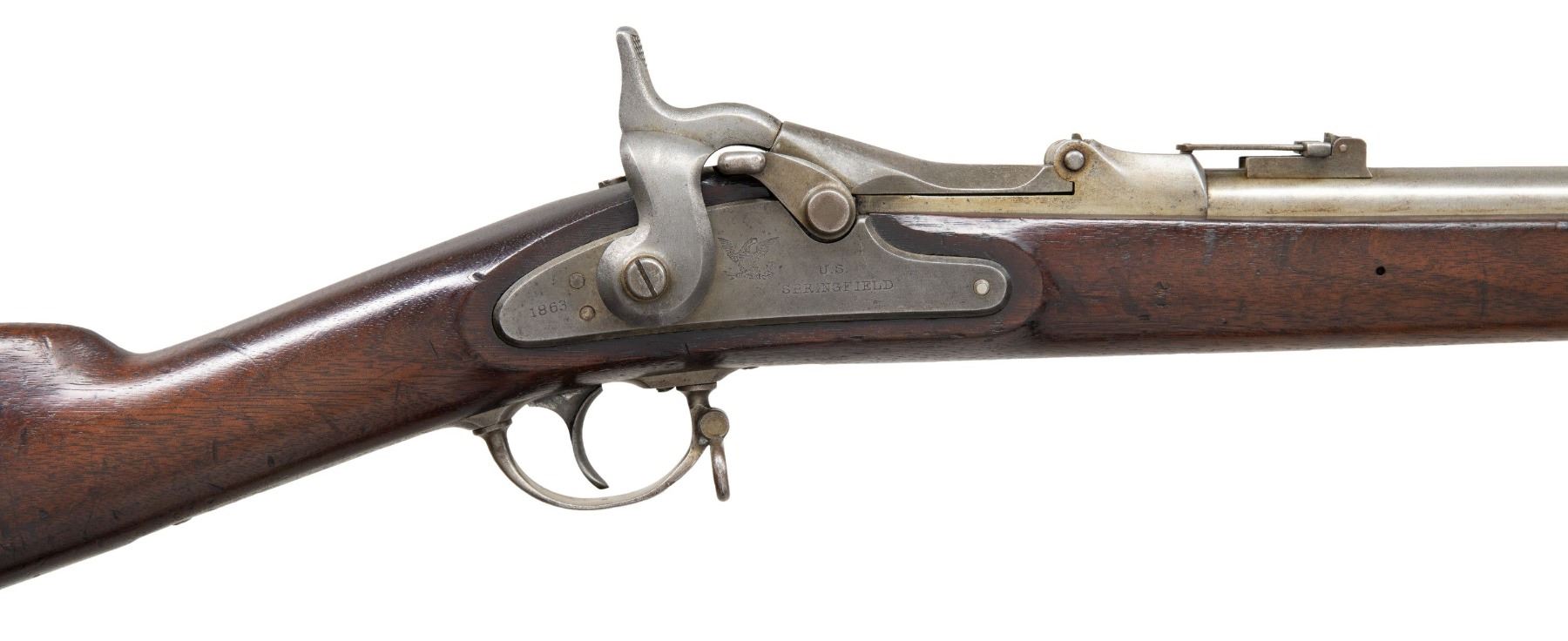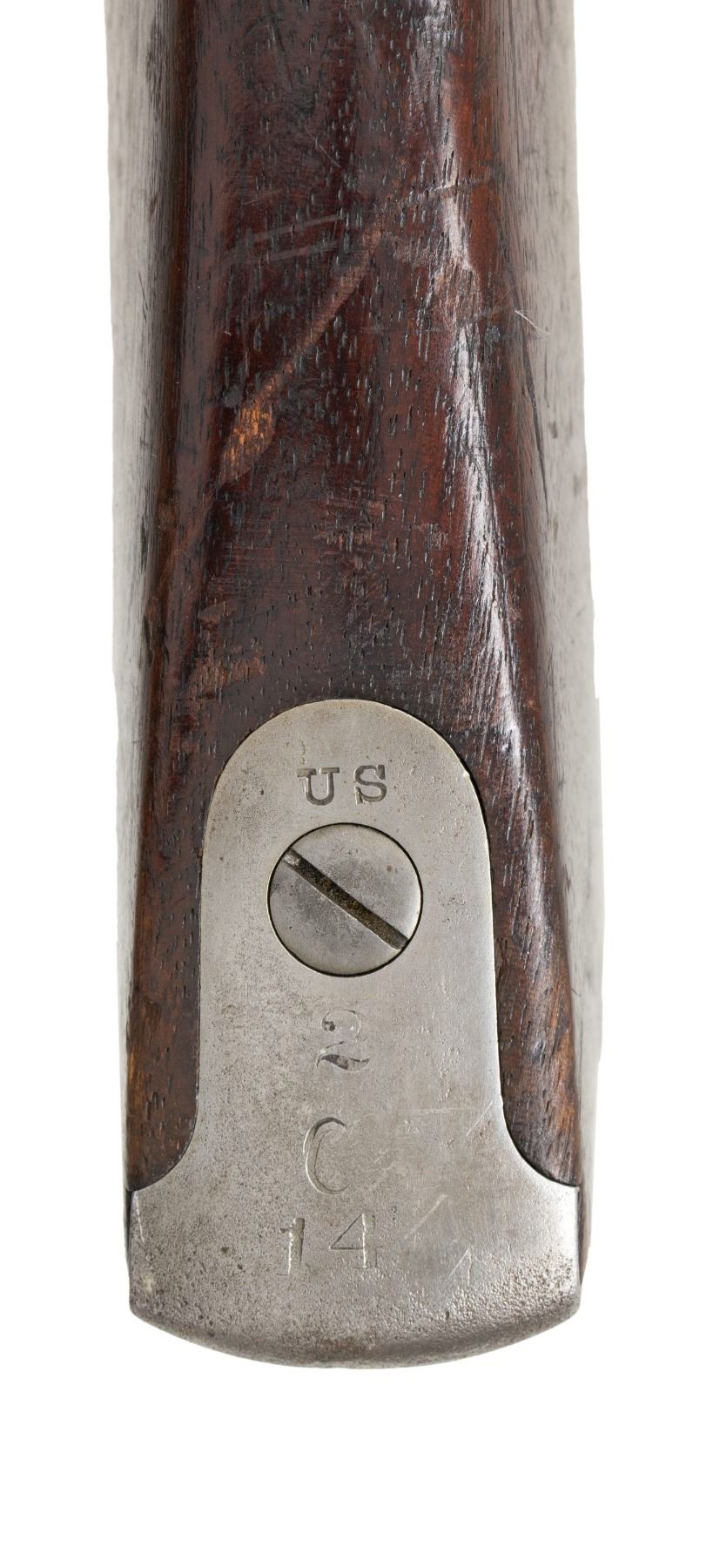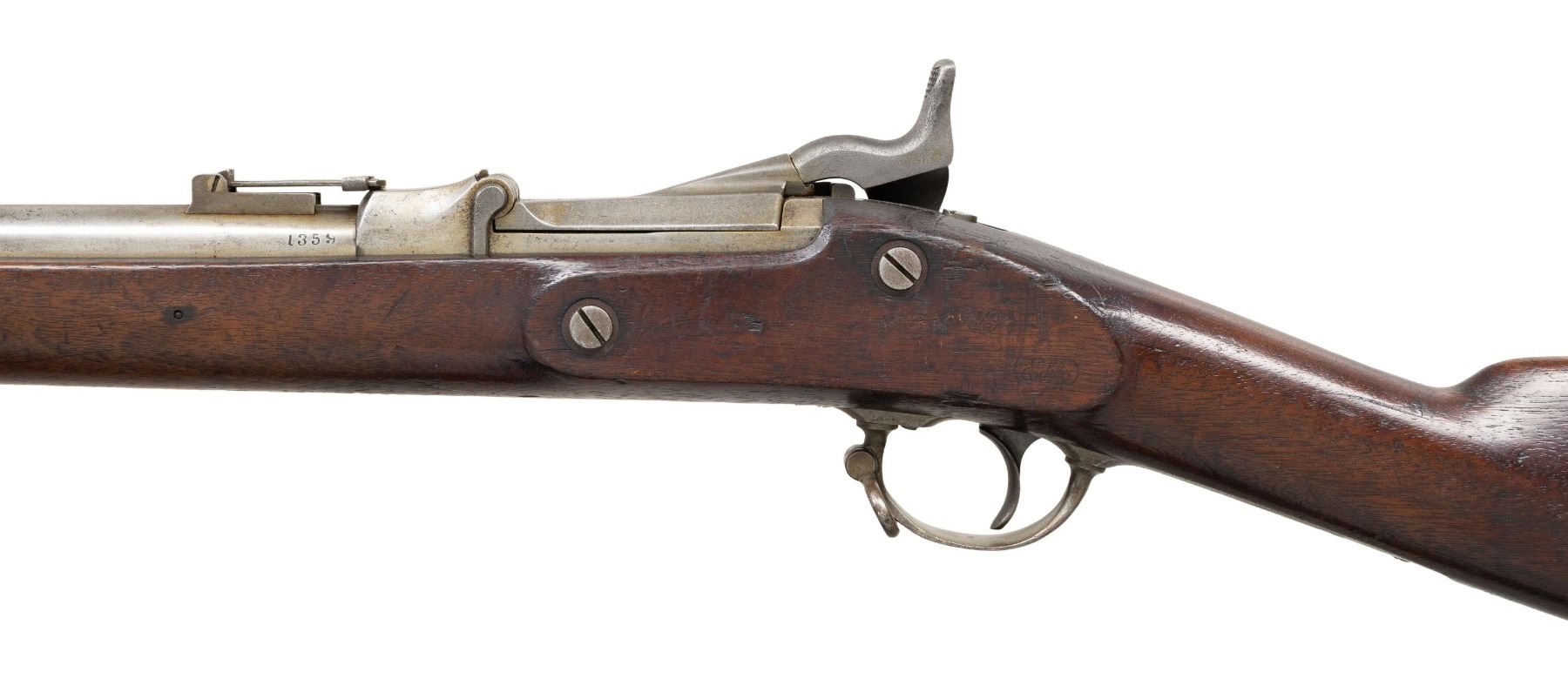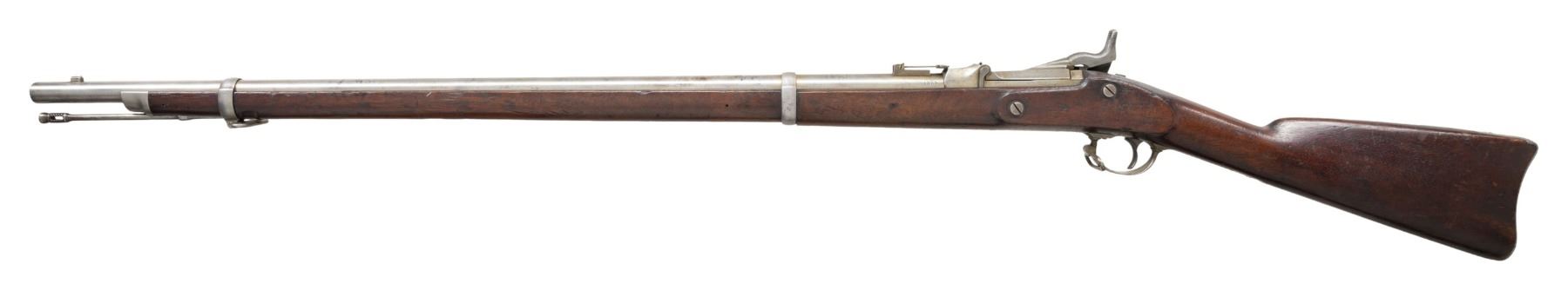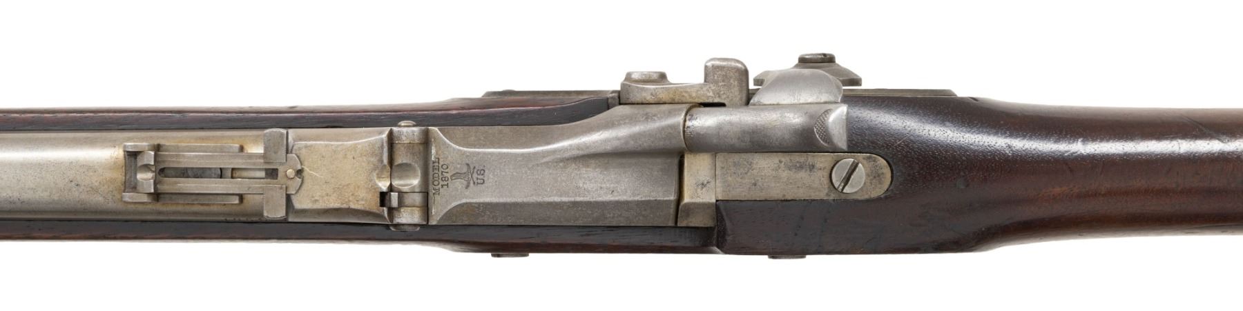 Cal. 50. S# 1359. Standard configuration, 32.5" barrel, 2 spring retained bands, adjustable rear sight, breech block marked: "MODEL / 1870 / eaglehead & crossed arrows / US", utilizing 1863 dated Civil War surplus lock. Unit markings stamped on buttplate tang "2 / C / 14". CONDITION: very good overall, complete and matching, mechanics fine, crisp rifled bore. PROVENANCE: Estate Collection of John "Jack" Dhooghe. (01-28245/JS). ANTIQUE. $800-1,200.