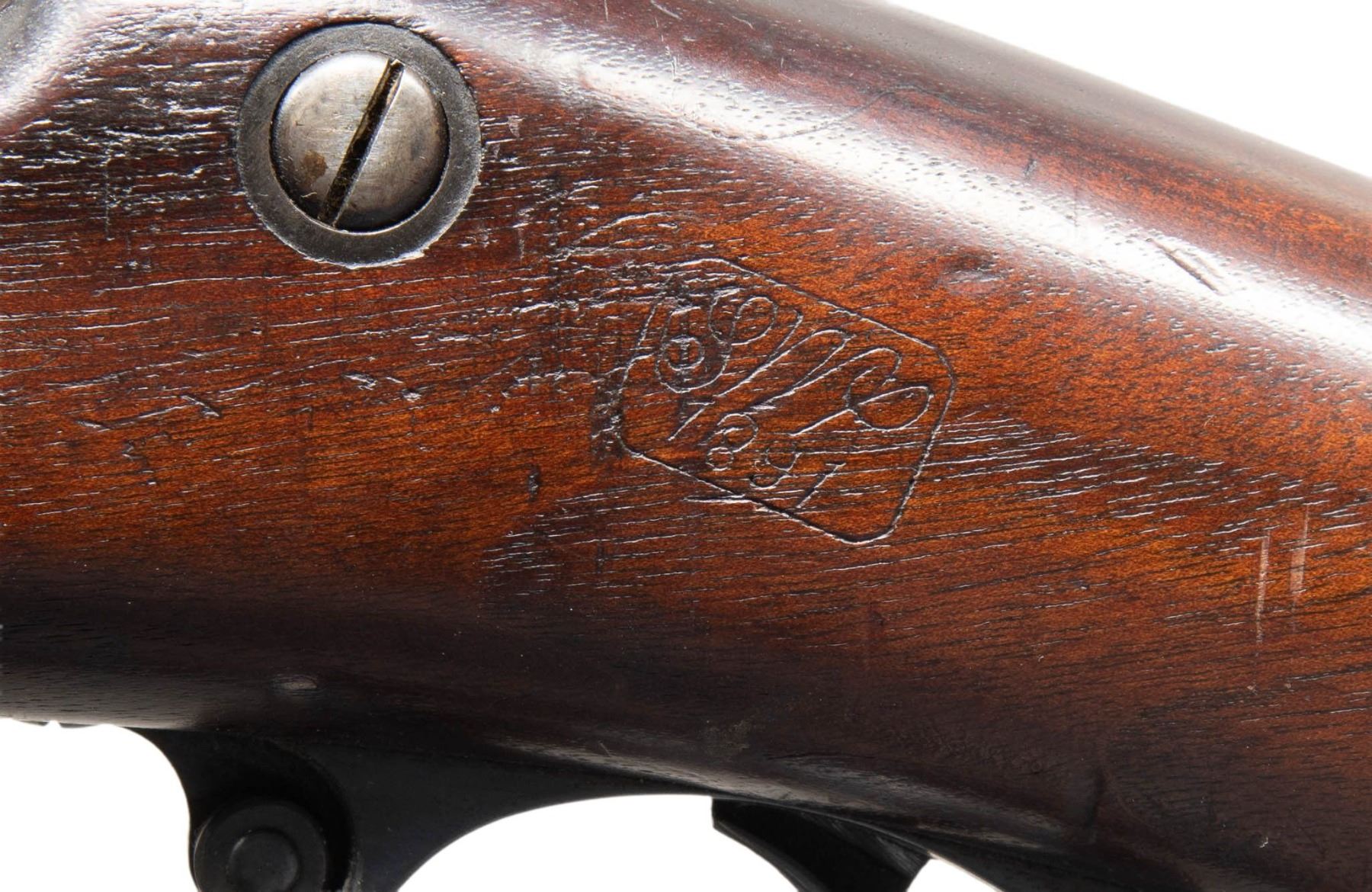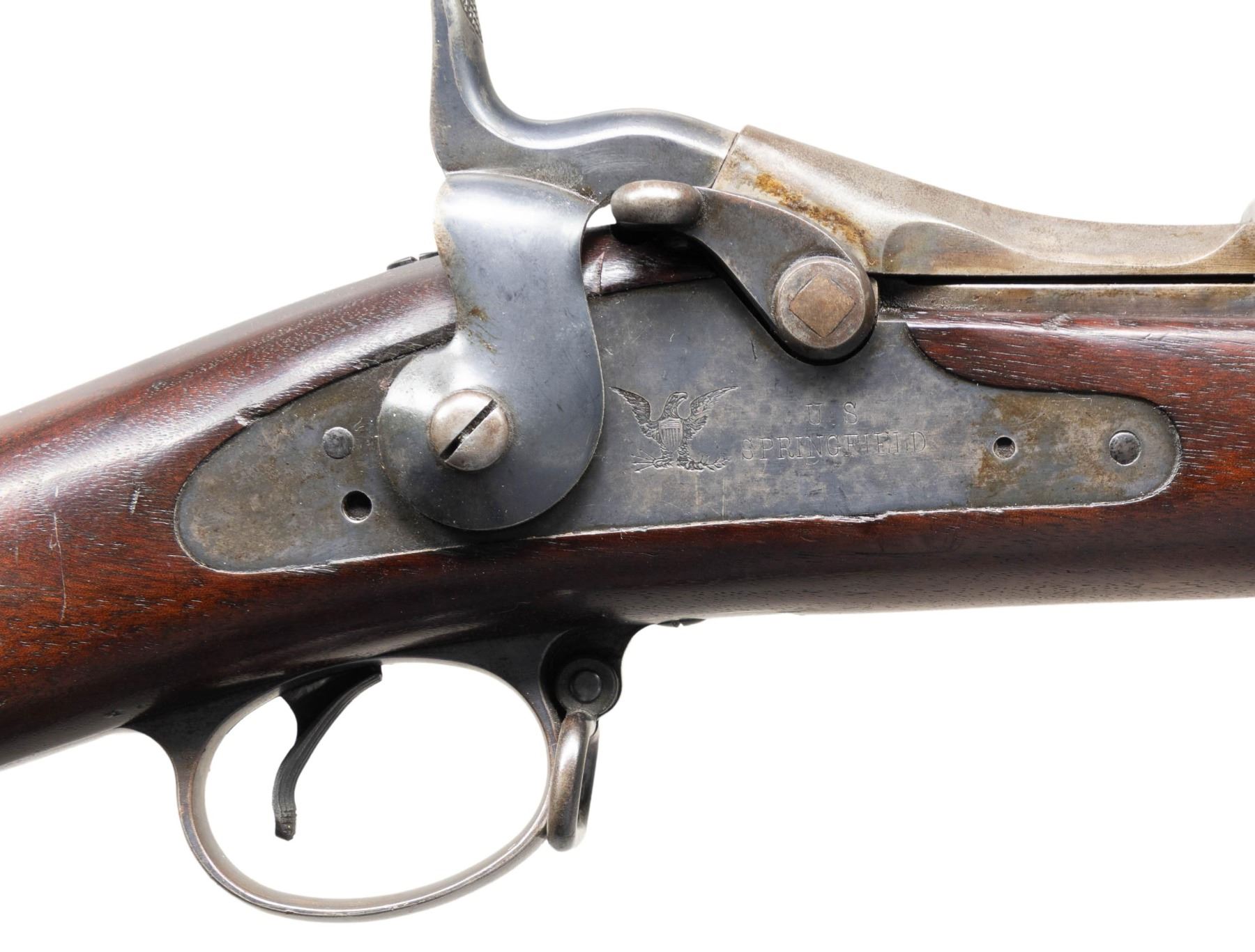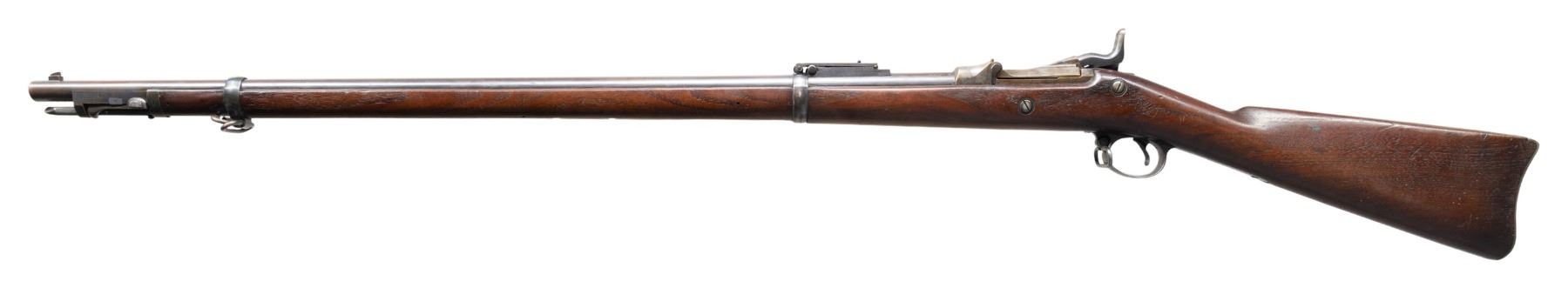 SINGLE SHOT MILITARY RIFLE. Cal. 45-70. S# 515021. Bbl. 32 1/2". Barrel marked on top left over chamber w/ eagle head "VP" proofs. Receiver manufactured in 1891. Breech block is marked on top "US / MODEL / 1884". Buffington rear sight marked "R" on top right corner of ladder. Graduated to 2,000 yards. Blade front sight. Three position tumbler. Lockplate is marked in-front of hammer with spread wing eagle & "US / SPRINGFIELD" on right side. Rod bayonet is present. One piece trigger guard. Walnut stock secured by two bands. Stock is marked on left side w/ boxed "SWP / 1891". Marked behind trigger guard tang w/ encircled script "P" proof. Buttstock is marked in white on the right side "8 / I / 47" indicating service in the 8th Infantry Regiment, Company I as rifle number 47. Correct buttplate w/ oblong trap. CONDITION: rifle is in nice original condition w/ the wear & handling marks from long careful service. The stock markings are crisp & legible. Stock has moderate handling marks throughout. Receiver, breech block & tang retain a large degree of their original case colors. Balance of metal retains 75% original blue w/ thinning & light wear. Muzzle area of barrel has beginnings of patina. Bore has strong sharp lands. Grooves have extensive shallow pitting w/ notable pit at approx. midpoint of length. (01-27357/RW). ANTIQUE. $600-900.