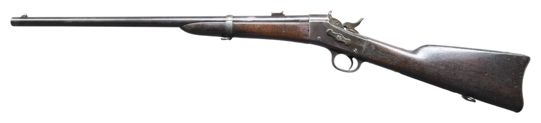 CARBINE. Cal. 50-45 CF. S# 2760. Bbl. 23 1/4" rnd. Blade front sight with folding leaf rear sight. Breech end of bbl. is marked with a naval anchor. Right side of rolling block action is stamped "P/ F.W.C." over a navy anchor. Band fastened forearm and straight grip stock with iron carbine buttplate and sling swivels. Quantity of 5,095 circa. 1868-1869. CONDITION: metal has faded brown appearance showing spots of pitting. Wood has dark worn appearance with numerous dents, scratches, and marks. Sound mechanics. Bore is generally bright with strong rifling. (01-27029/DS). ANTIQUE. $1,200-1,800.