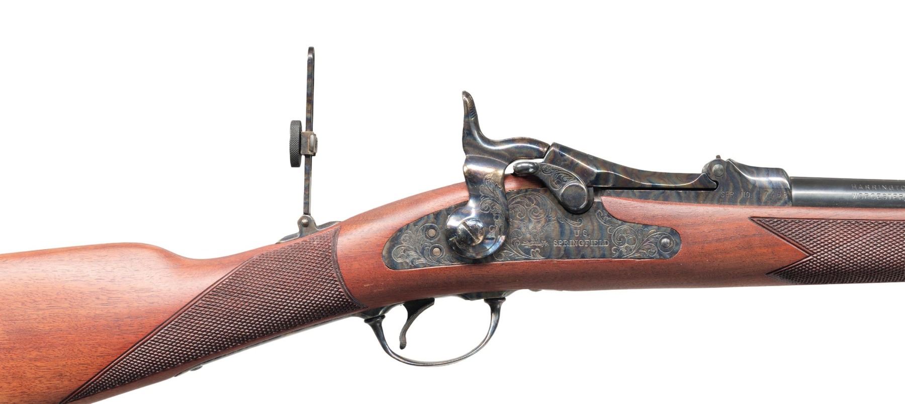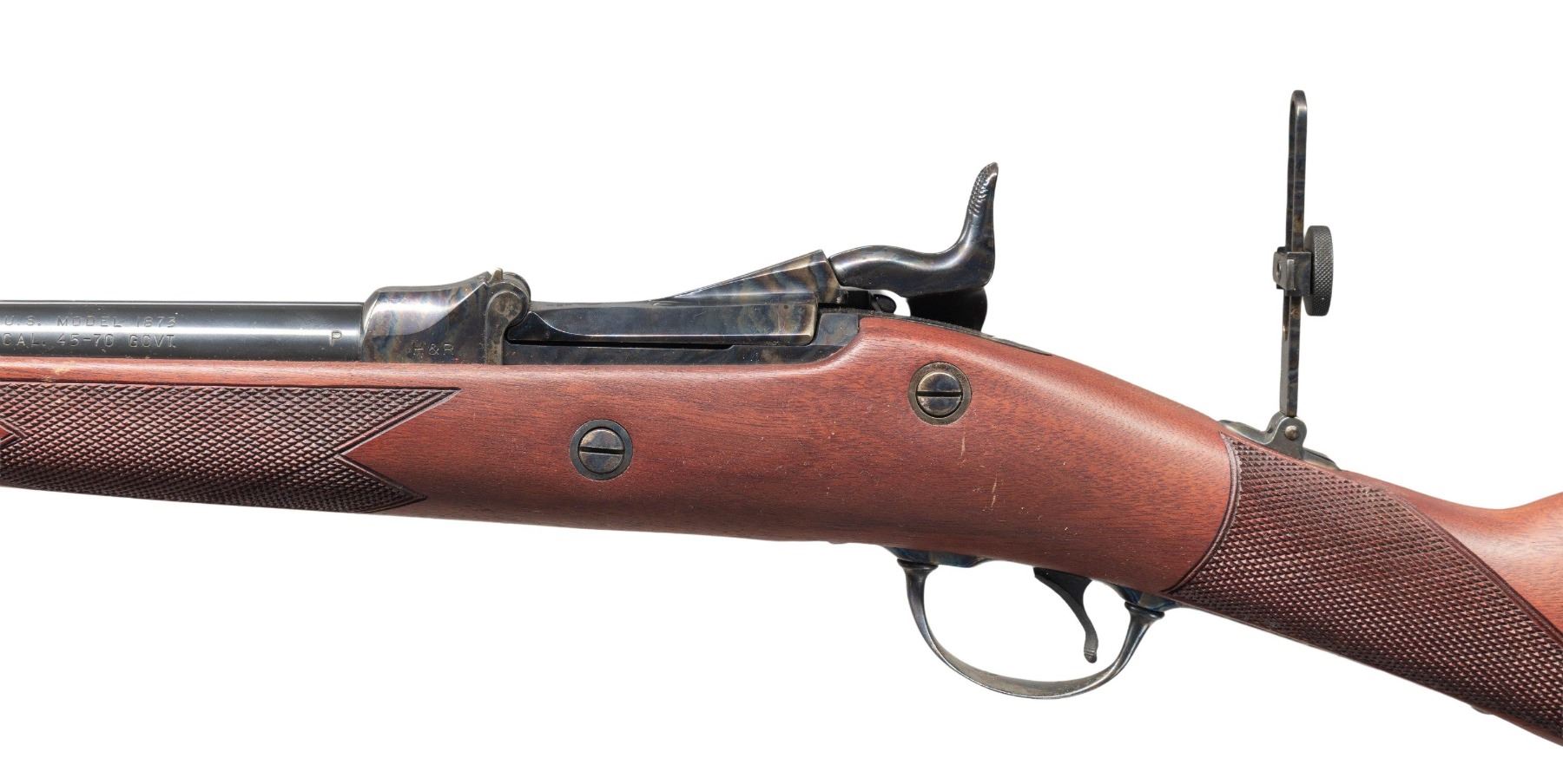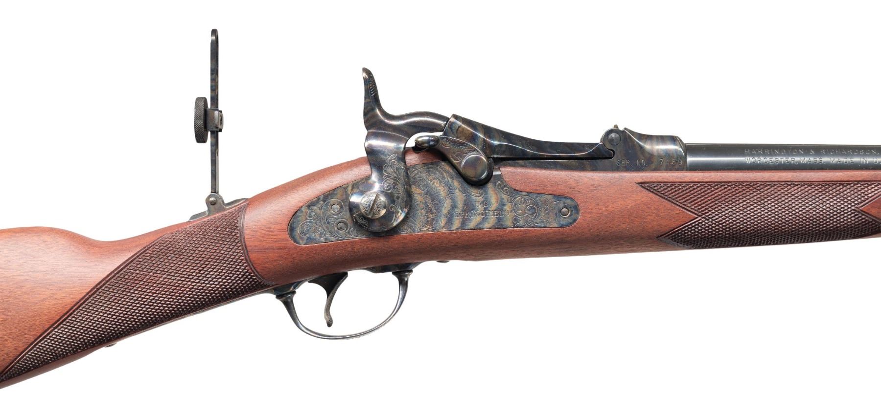 RICHARDSON MODEL 1873 OFFICER'S MODEL TRAPDOOR SINGLE SHOT RIFLES WITH FACTORY SHIPPING BOXES. Cal. 45-70. S# (1):7468. (2): 7469. Bbls. 26". Sequential pair of Model 1873 Trapdoor Officer's Model single shot rifles produced by Harrington & Richardson to commemorate H&R's centennial. Left side of the bbls. are marked "U.S. MODEL 1873/ CAL. 45-70 GOVT.", followed by "P", with H&R's mfg. information marked on the right. Left side of the breech section of the receivers are marked "H&R", with the S#s marked on the right. Top of breechblocks are marked "U.S./ MODEL/ 1873". Right side of the bbl. bands are marked "U". The lockplates are marked with a patriotic eagle followed by "U.S./ SPRINGFIELD" surmounted by foliate scroll engraving, which extends to the side of the hammers, top of the breech sections of the receiver, areas of the breechblocks, upper receiver tangs, upper buttplate tangs, trigger guard bows, as well as the top of the bbl. bands. Receivers, breechblocks, hammers, lockplates, rear sight assemblies, trigger guards, and buttplates exhibit a case colored finish, with the bbls. and bbl. bands exhibiting a blue finish. 1-piece single band fastened checkered wood straight grip buttstocks with engraved pewter tipped nose caps. Underside of stocks are stamped with an encircled "P" cartouche on the toeline. Brass beaded dovetailed blade front sights with Vernier style tang mounted aperture rear sights. Each rifle is complete with its hardwood non-ferrous metal tipped cleaning rod. UNATTACHED ACCESSORIES: original factory shipping boxes (matching via a handwritten S# on one end label) containing factory styrofoam inserts and factory manuals. 1 box retains its brass commemorative oval plaque marked "OFFICER'S MODEL/ SPRINGFIELD RIFLE/ Harrington & Richardson Centennial/ 1871-1971". CONDITION: rifles retain the vast majority of their original factory finishes, showing no signs of prior use, exhibiting some scattered spots/areas of light to mild surface oxidation that is predominately on the buttplates and bbl. bands. Case colored parts/components retain virtually all of their original vibrant factory finish. Mirror bores, retaining well defined rifling throughout. Proper manual mechanics. Stocks are excellent overall, exhibiting few minute superficial handling marks. Boxes show general overall wear, with some minor tearing at end flap edges. 1 box shows several holes, with the other missing one of its short side end flaps, but both otherwise remains sound. A very attractive pair of sequentially serialized H&R centennial Model 1873 Officer's Model Trapdoor rifles. (25-5599&25-5600/MLW). BOTH CURIO. $1,000-2,000.