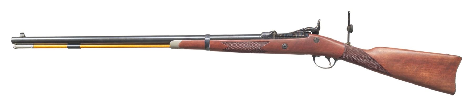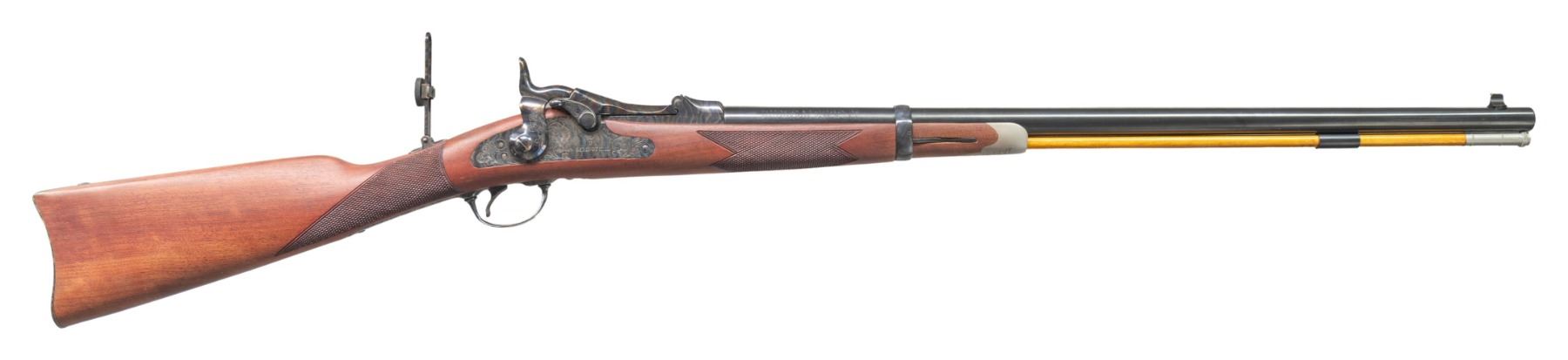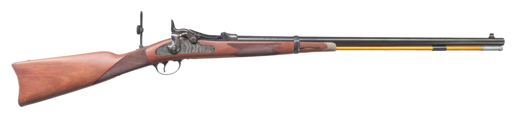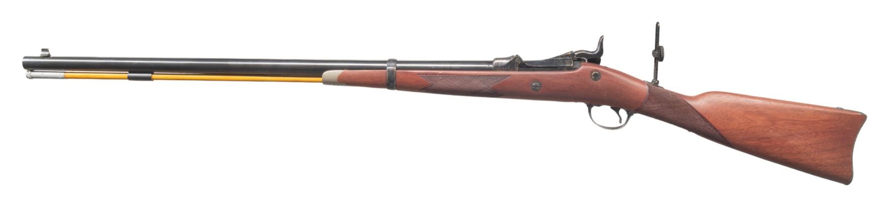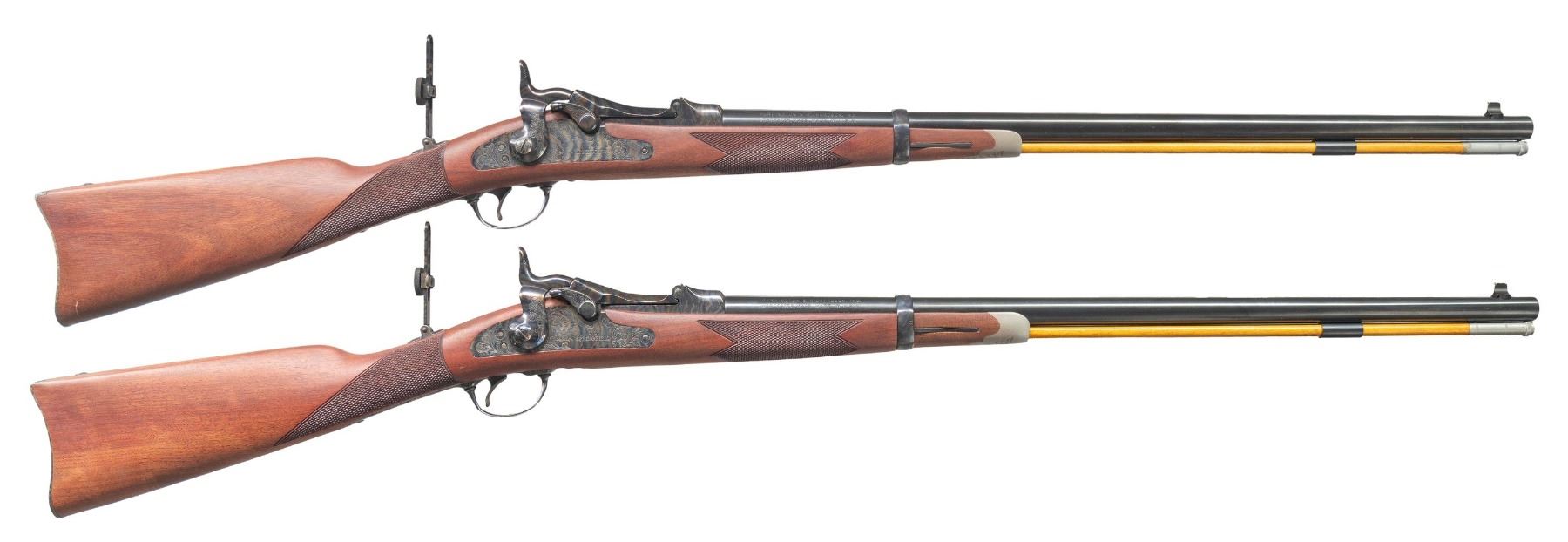 RICHARDSON MODEL 1873 OFFICER'S MODEL TRAPDOOR SINGLE SHOT RIFLES WITH FACTORY SHIPPING BOXES. Cal. 45-70. S# (1):7468. (2): 7469. Bbls. 26". Sequential pair of Model 1873 Trapdoor Officer's Model single shot rifles produced by Harrington & Richardson to commemorate H&R's centennial. Left side of the bbls. are marked "U.S. MODEL 1873/ CAL. 45-70 GOVT.", followed by "P", with H&R's mfg. information marked on the right. Left side of the breech section of the receivers are marked "H&R", with the S#s marked on the right. Top of breechblocks are marked "U.S./ MODEL/ 1873". Right side of the bbl. bands are marked "U". The lockplates are marked with a patriotic eagle followed by "U.S./ SPRINGFIELD" surmounted by foliate scroll engraving, which extends to the side of the hammers, top of the breech sections of the receiver, areas of the breechblocks, upper receiver tangs, upper buttplate tangs, trigger guard bows, as well as the top of the bbl. bands. Receivers, breechblocks, hammers, lockplates, rear sight assemblies, trigger guards, and buttplates exhibit a case colored finish, with the bbls. and bbl. bands exhibiting a blue finish. 1-piece single band fastened checkered wood straight grip buttstocks with engraved pewter tipped nose caps. Underside of stocks are stamped with an encircled "P" cartouche on the toeline. Brass beaded dovetailed blade front sights with Vernier style tang mounted aperture rear sights. Each rifle is complete with its hardwood non-ferrous metal tipped cleaning rod. UNATTACHED ACCESSORIES: original factory shipping boxes (matching via a handwritten S# on one end label) containing factory styrofoam inserts and factory manuals. 1 box retains its brass commemorative oval plaque marked "OFFICER'S MODEL/ SPRINGFIELD RIFLE/ Harrington & Richardson Centennial/ 1871-1971". CONDITION: rifles retain the vast majority of their original factory finishes, showing no signs of prior use, exhibiting some scattered spots/areas of light to mild surface oxidation that is predominately on the buttplates and bbl. bands. Case colored parts/components retain virtually all of their original vibrant factory finish. Mirror bores, retaining well defined rifling throughout. Proper manual mechanics. Stocks are excellent overall, exhibiting few minute superficial handling marks. Boxes show general overall wear, with some minor tearing at end flap edges. 1 box shows several holes, with the other missing one of its short side end flaps, but both otherwise remains sound. A very attractive pair of sequentially serialized H&R centennial Model 1873 Officer's Model Trapdoor rifles. (25-5599&25-5600/MLW). BOTH CURIO. $1,000-2,000.