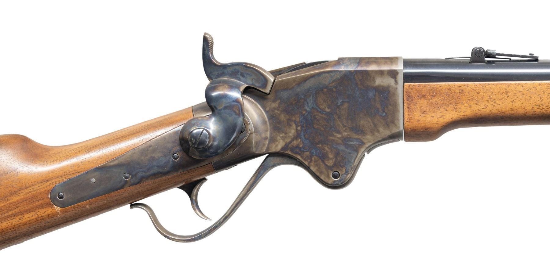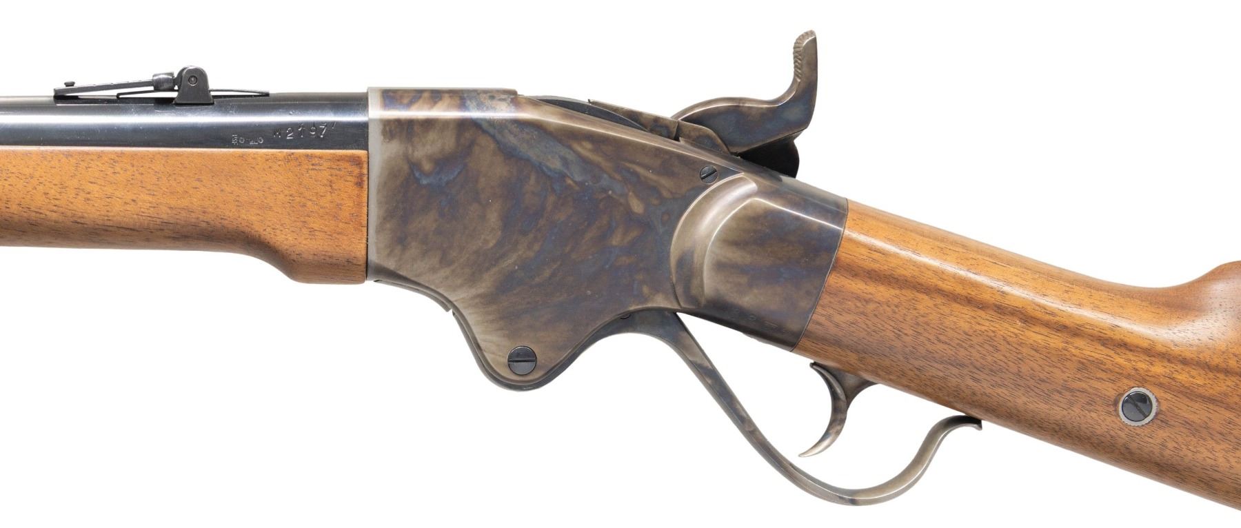 Cal. 56-50. S# M2197. Bbl. 30". Blade front sight. Ladder rear sight graduated to 900yds. Armi Sport made Spencer rifle imported by Cimarron. Case colored action, bands & buttplate. Blued bbl. Walnut stock set with bottom mounted sling swivels. MAGS: 1-7 rd. tubular in buttplate. CONDITION: stock set shows a few light handling marks. Metal retains 98% original finishes with some light handling wear & light freckling on action. Action functions properly when hand cycled. Bright near excellent bore. PROVENANCE: From the Buckstix Collection. (25-6387/MJC). MODERN. $1,000-1,500.