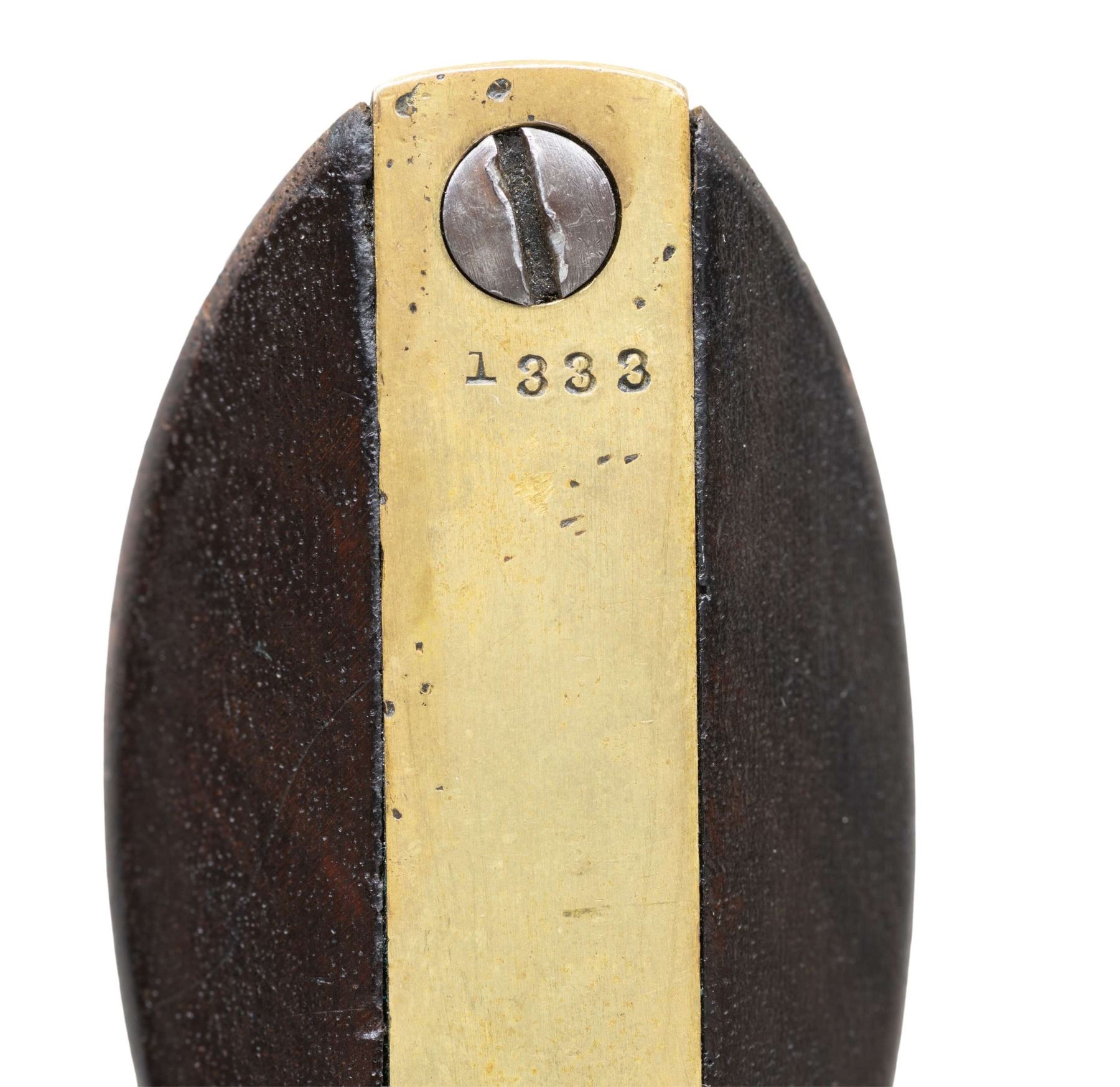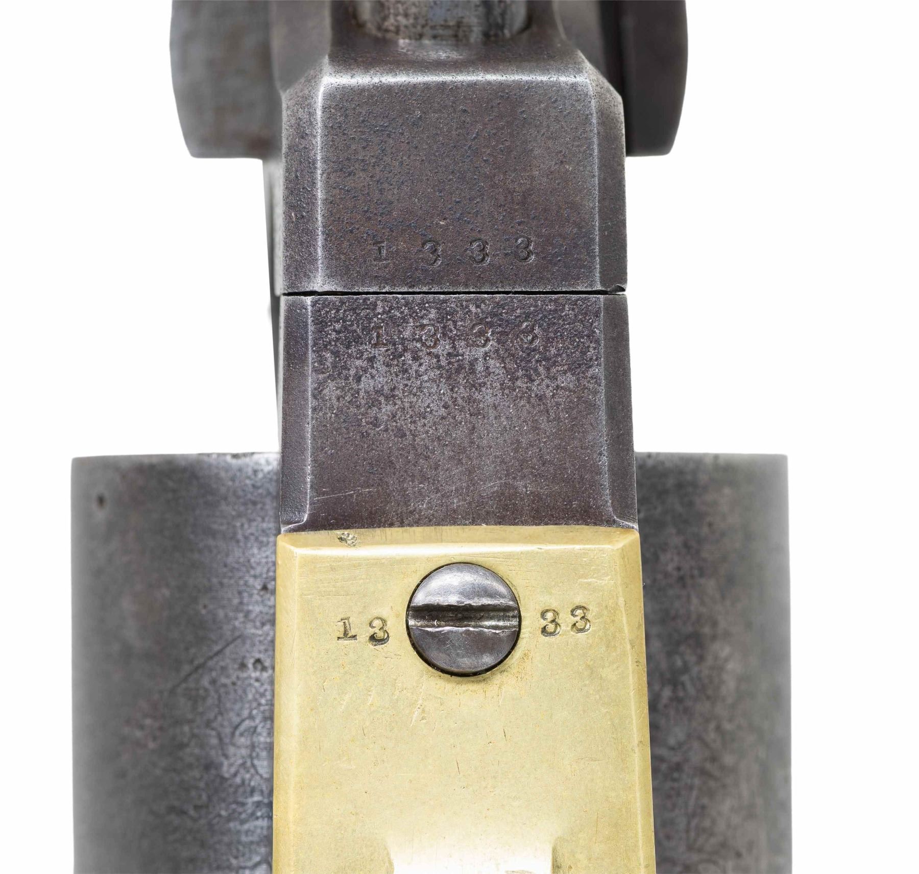 "TRANSISITIONAL WALKER" REVOLVER. Cal. 44. S# 1333. This revolver very closely emulates the very rare transitional Walkers found serial numbered between 1100-1340. The trigger guard slants back into the grip like a Walker, and has steep beveled grip like a Walker. This revolver has been through several prominent dealers hands in the 1970s and sold as original. It is a very good reproduction that could be a filler for that extremely hard to find Whitneyville-Hartford Dragoon revolver. CONDITION: very good overall, pitting scattered. (01-27606/JS). ANTIQUE. $2,500-4,500.