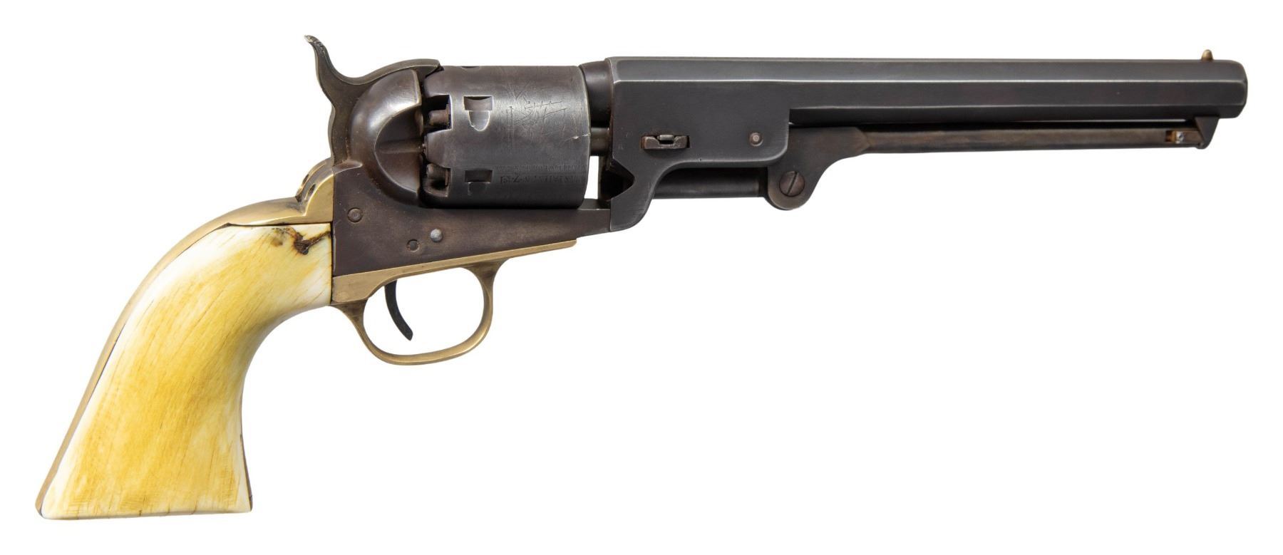 Cal. 36. S# 17431. Bbl. 7 1/2" with bead front sight. Top flat has added Sam Colt New York City address. 6-shot rnd. cyl. with naval scene roll engraving. Large brass trigger guard and back strap. 1-piece artificially aged natural white replacement grip. CONDITION: 70% lightly faded added browned finish showing edge and carry wear. Cyl. has lightly worn scene. Grips have poor fit to frame. Functioning action. Bore and cyl. chambers show some pitting. (01-27897/DS). ANTIQUE. $250-400.