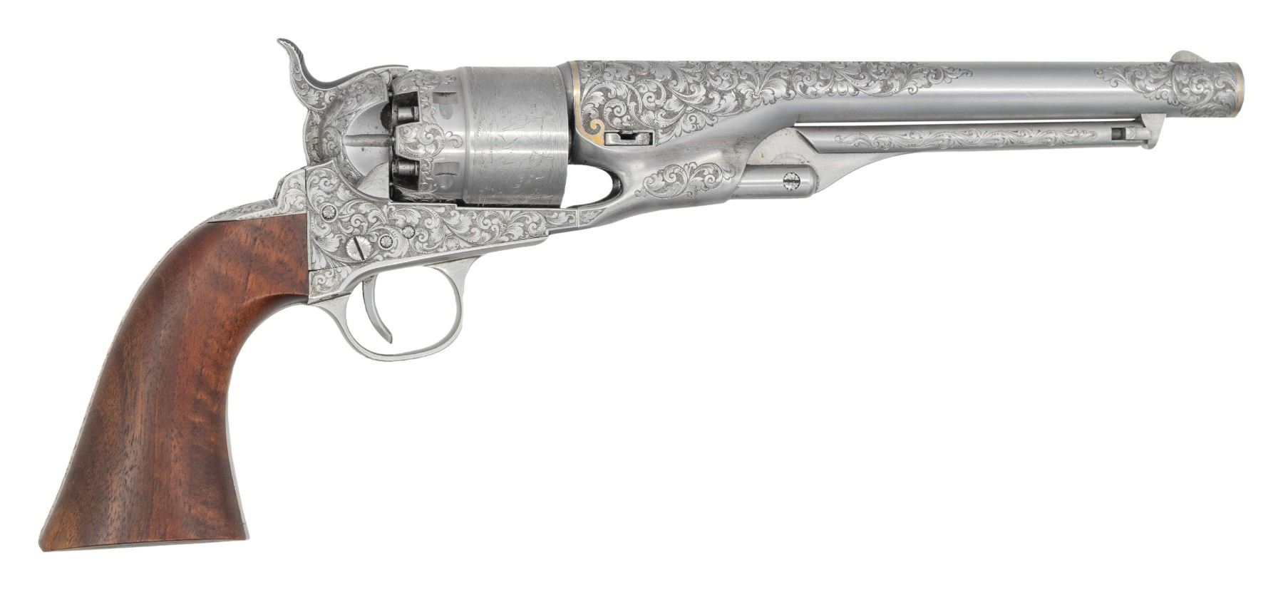 GENERATION 1860 ARMY REVOLVER. Cal. 44. S# 211365 S. Standard configuration of the early 4-screw Colt army revolver made for shoulder stock, 8" barrel with one line New York address. Finely scroll engraved with gold bands at muzzle & breech. Stainless steel 1860s only made by Colt 1979-1982 and few factory engraved. Script "TD" engraved on bottom of lug. CONDITION: excellent, mechanically fine with bright shiny rifled bore. PROVENANCE: Martin Lane Lifetime Collection. (01-28164/JS). ANTIQUE. $2,000-3,000.