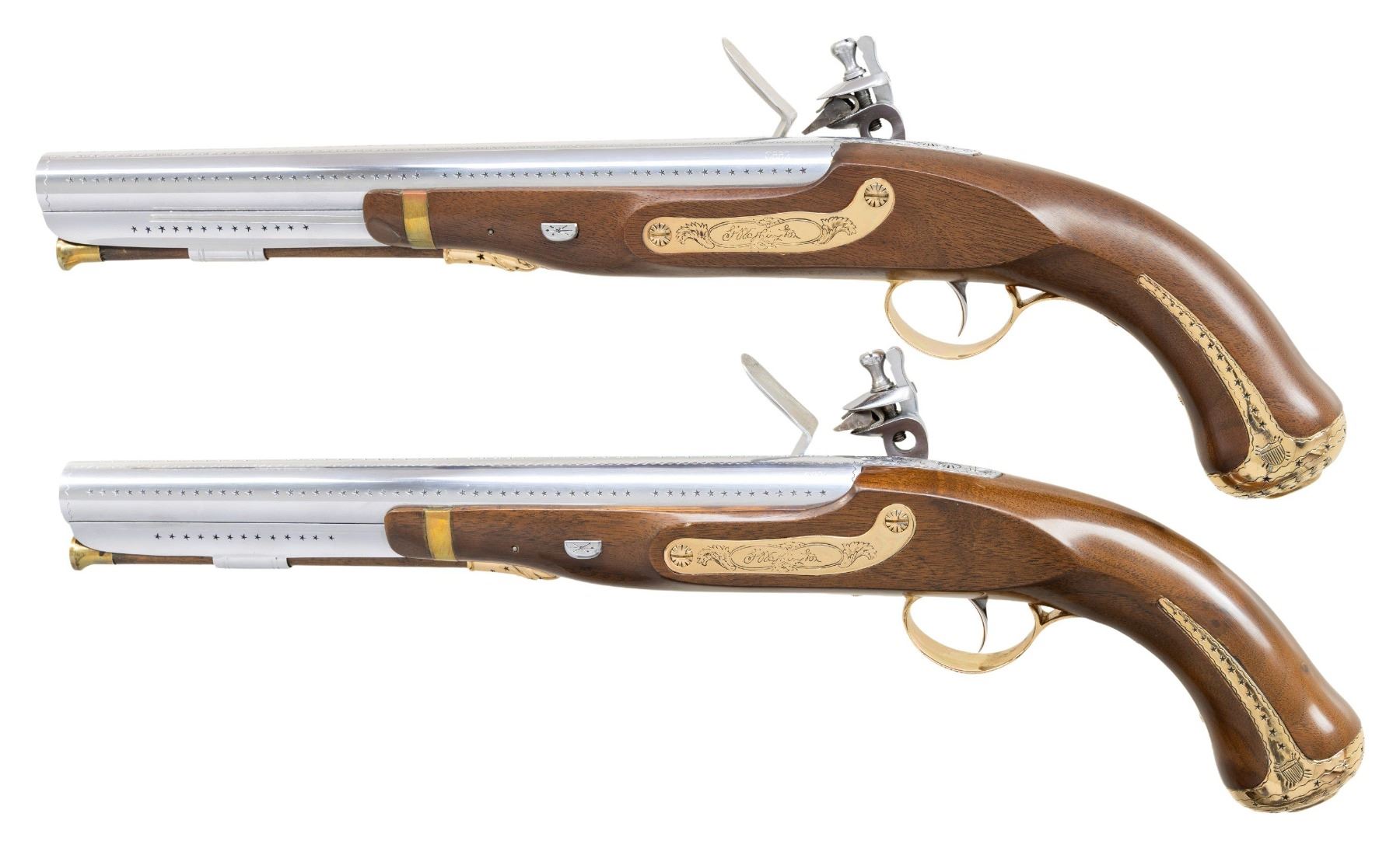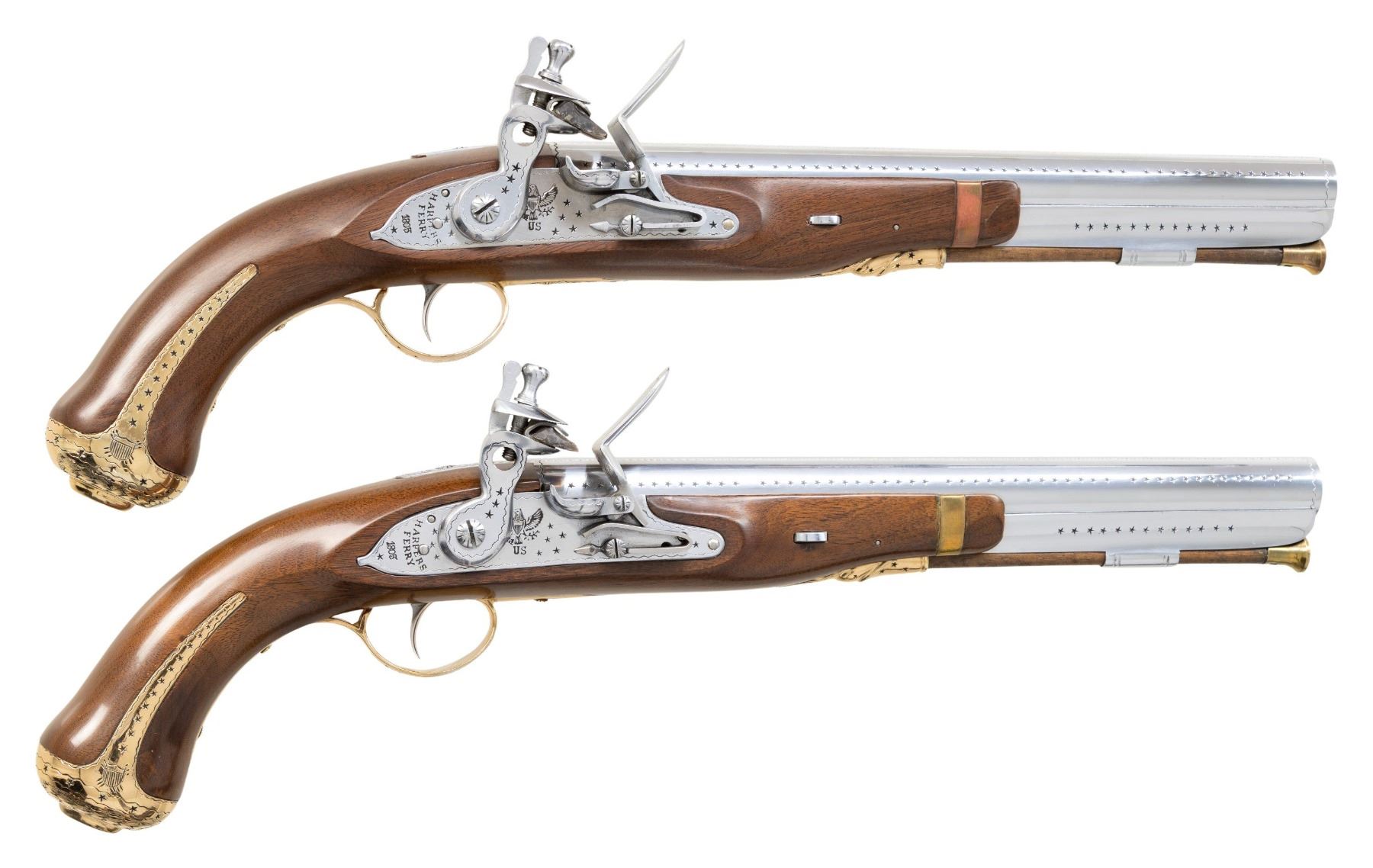 FERRY FLINTLOCK COMMEMORATIVE PISTOLS.Both Cal. 58. S#'s: 0881 & 0882. Bbls. 9 1/2" rnd. Commemorative Harper's Ferry 1805 style pistols. Lock has US eagle & Harpers Ferry markings .Brightly finished metal with engraving & stars. Walnut stocks with brass furniture & further engraving. Brass tipped hardwood ramrods present. UNATTACHED ACCESSORIES: hardwood display case with key. CONDITION: all aspects of both pistols near excellent. (01-28662/MJC). ANTIQUE. $800-1,200 for pair.