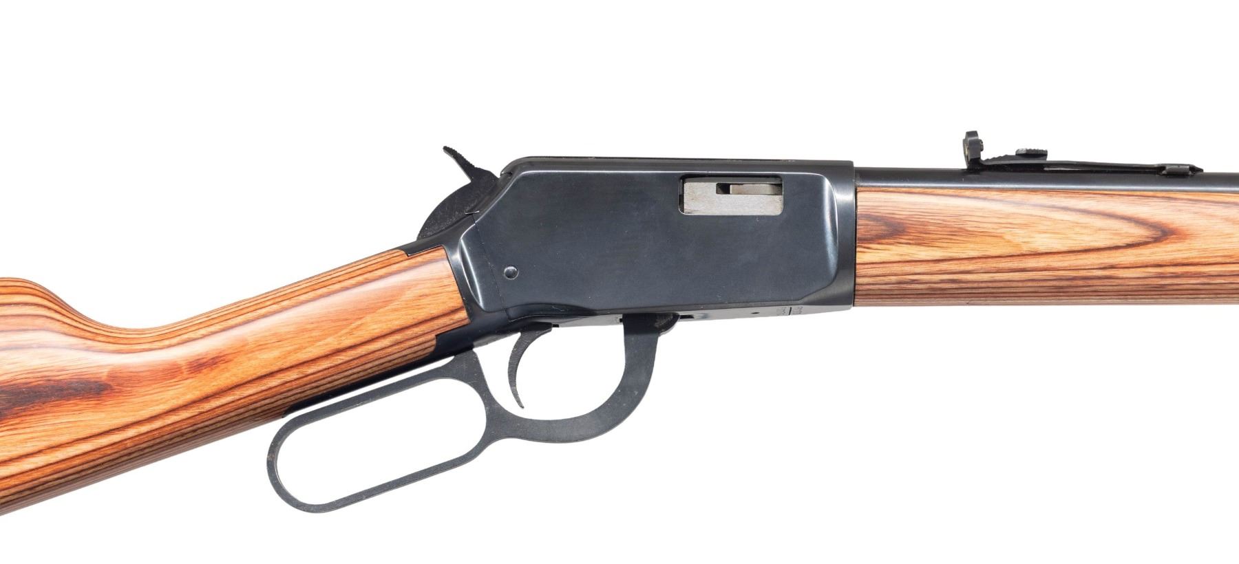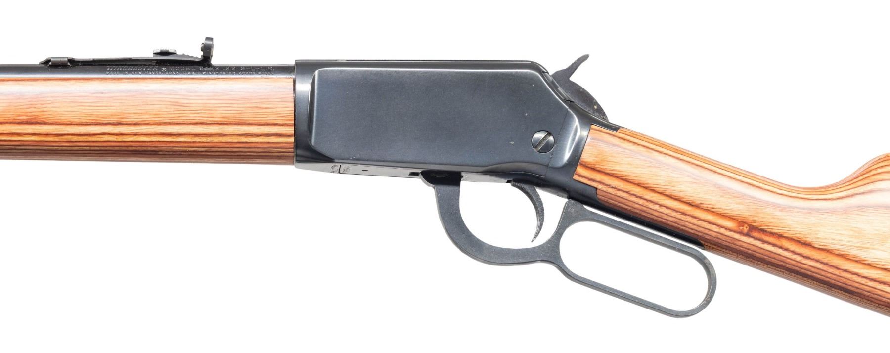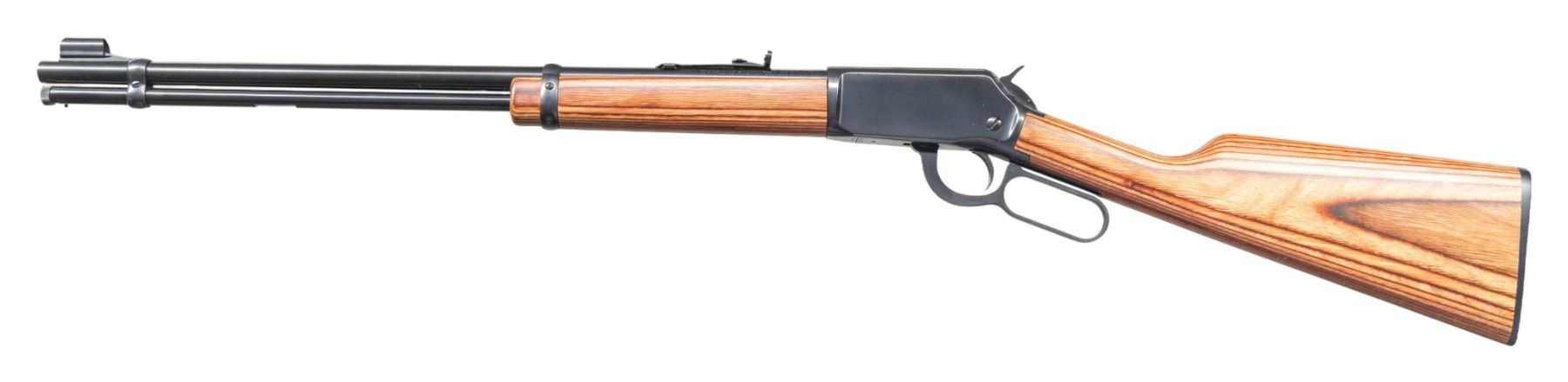 Cal. 22 S, L, LR. S# F622734. Bbl. 20 5/16". Model 9422 lever action rifle mfg. by Winchester. Left side of the bbl. exhibits standard factory markings denoting the model and cal. designations, as well as Winchester's mfg. information. Metal components exhibit a blue finish overall, save for on the bolt, which is polished in-the-white. Plain laminated wood forearm and straight grip stock with Winchester checkered black synthetic buttplate. Ramped, hooded, and aluminum beaded blade front sight with dovetailed U-notch rear sight. Top of receiver is grooved for a scope mount attachment. CONDITION: fine, with metal components retaining virtually all of their original factory blue finish, exhibiting a few light superficial handling marks. Lever exhibits a couple small scattered spots of light surface oxidation. Mirror bore, retaining well defined rifling throughout. Proper manual mechanics. Wood furniture shows a few superficial handling marks, but otherwise remains very good to excellent overall. PROVENANCE: From the Buckstix Collection. (25-6499/MLW). MODERN. $500-800.