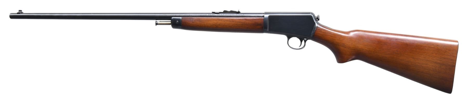 SEMI-AUTOMATIC RIFLE. Cal. 22 LR. S# 74068. Bbl. 23". Model 63 semi-automatic rifle mfg. by Winchester in 1948. Left side of the bbl. is marked with Winchester's mfg. information, followed by the Winchester trademark logo, as well as the model and cal. designations. Metal components exhibit a blue finish overall, save for on the bolt and plunger bar, which are in-the-white. 1-piece plain wood pistol grip buttstock, with flat inverse checkered steel buttplate, and plain wood forend. Dovetailed aluminum beaded blade front sight, with dovetailed U-notch rear sight. Matching numbers are present on the upper and lower assemblies. CONDITION: metal components retain bountiful amounts of their original factory blue finish, exhibiting a few superficial handling marks, some scattered spots of light surface oxidation, as well as a small spot of cleaned pitting that is present on the right side of the receiver. Mirror bore, retaining well defined rifling throughout. Wood furniture shows some superficial marks from handling and storage, but otherwise remains sturdy and serviceable. PROVENANCE: Estate of Russell Dickerman. (25-1785/MLW). CURIO. $400-600.