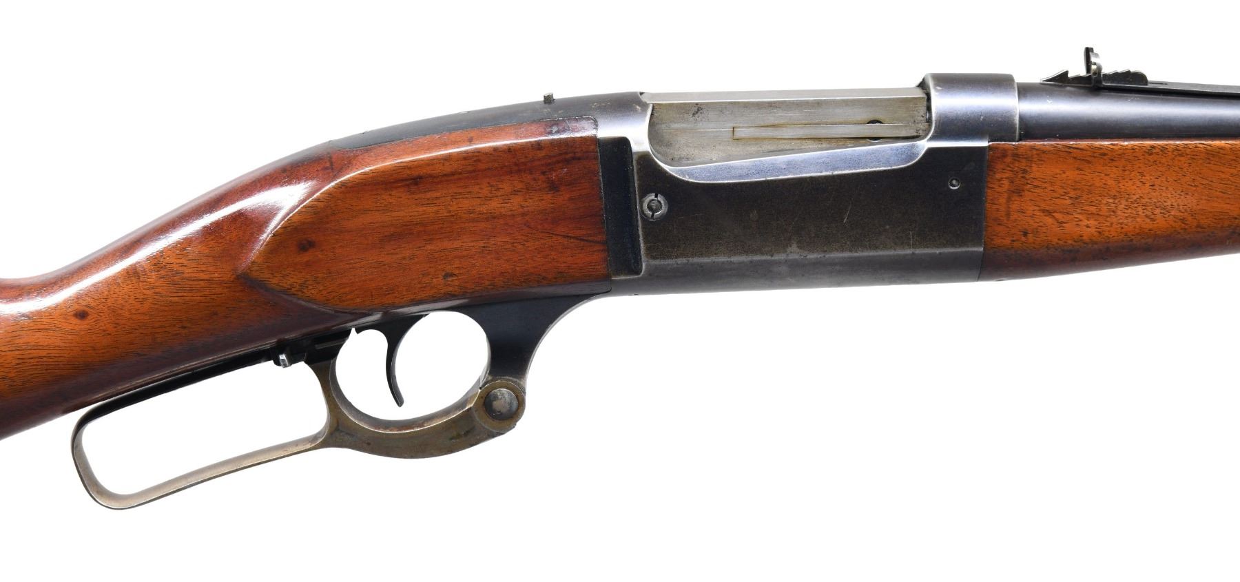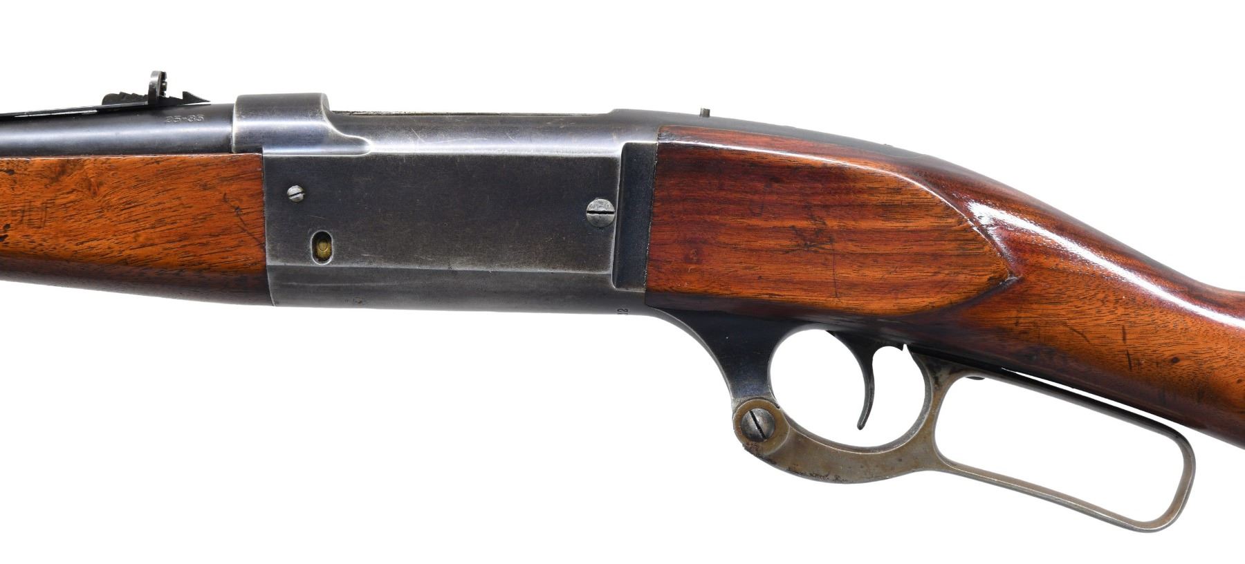 Cal. 25-35. S# 124812. Bbl. 20" round rapid taper. Replacement blade front sight & missing bead on integral base w/ elevator adjustable sporting rear sight. Action features brass rotary mag., left side shell counter, cocking indicator & bent tab safety. Blue finished w/ case colored lever. Schnable tipped forearm & straight grip walnut stock w/ curved lower line & checkered hard rubber buttplate. Mfg. 1912. CONDITION: 60% dull fading blue showing carry & edge wear w/ spots of corrosion & scratches. Wood has added finish over wear w/ scattered scratches, dents & marks. Buttplate has a small chip at toe. Bore has a slightly darkened appearance w/ worn rifling. PROVENANCE: Estate of Russell Dickerman. (25-1983/DS). CURIO. $1,000-1,500.