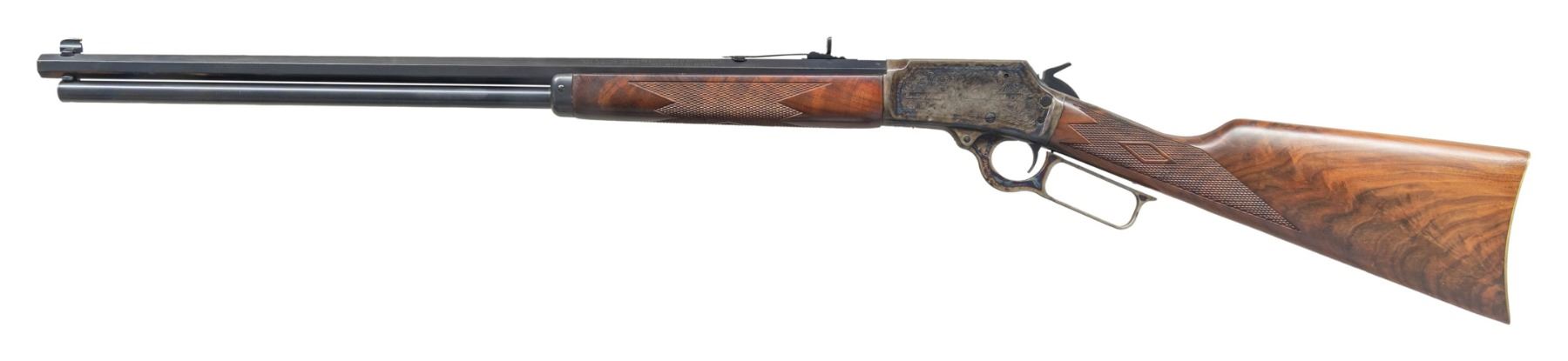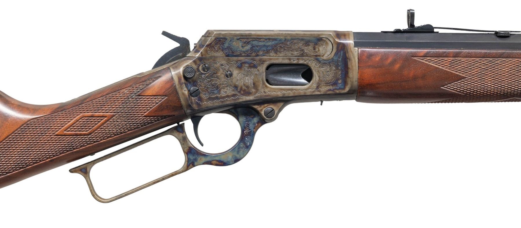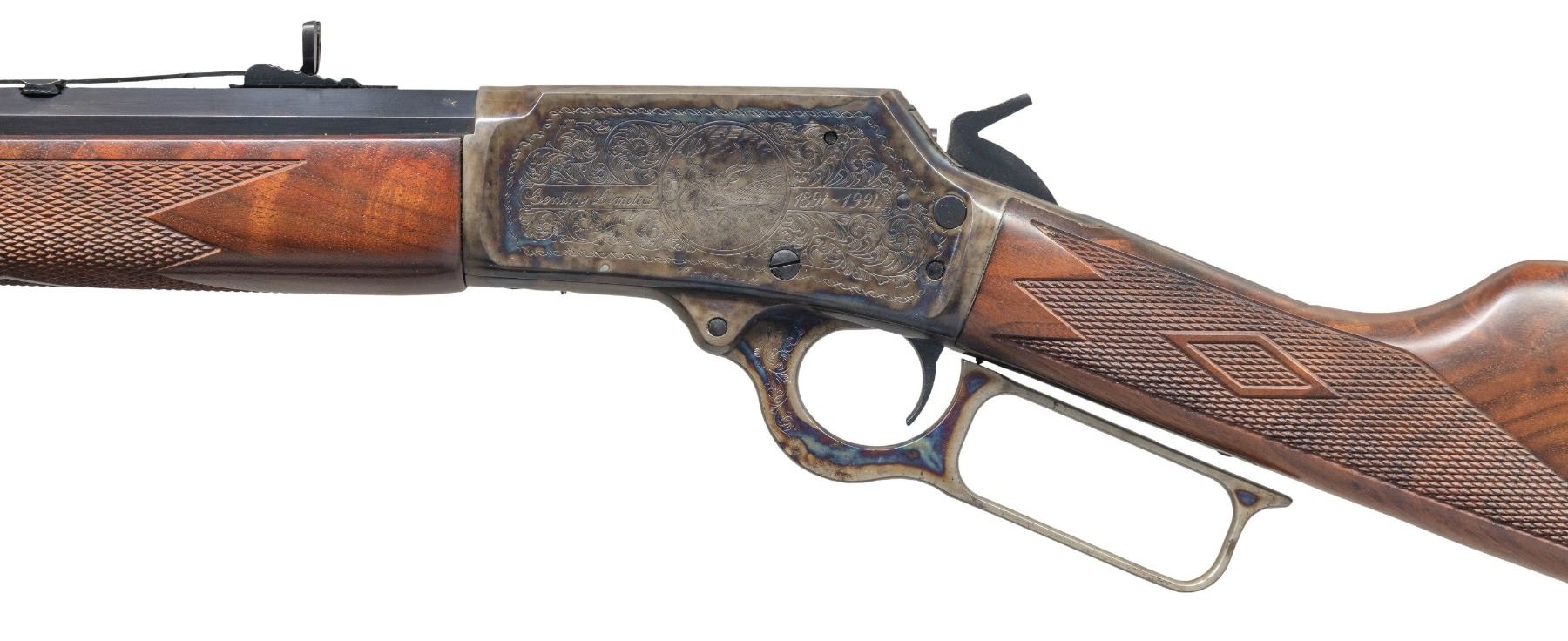 ACTION RIFLE. CAL. 44-40 WIN. S# 94CL0781. One of 2,500 mfg. 1994 as Limited Edition Commemorative to celebrate the Model 1894's 100th Anniversary. Tapered oct. 24" barrel. 12 Shot Tubular mag. Gold bead front sight & elevator rear sight. Traditionally finished case hardened receiver & lever featuring Bottega C. Giovanelli engraving of floral scroll, Marlin rider on right side, elk & Limited edition banner. Engraving extends to bolt & lever. Checkered walnut stock w/ crescent brass buttplate. CONDITION: near excellent blue & case colored finish. Very good to near excellent wood finish with scattered light dings. Brass starting to acquire patina, but very good overall shine. Very good rifling with light frosting. (25-5618/MD). MODERN. $800-1,200.