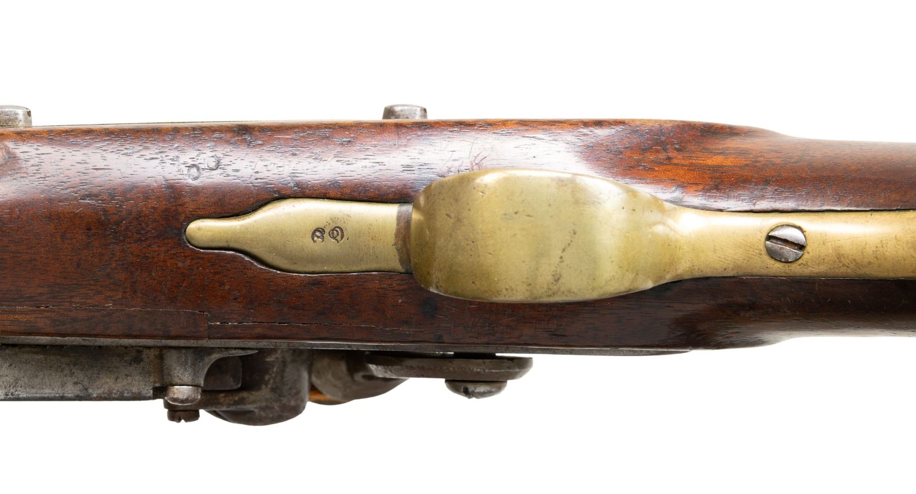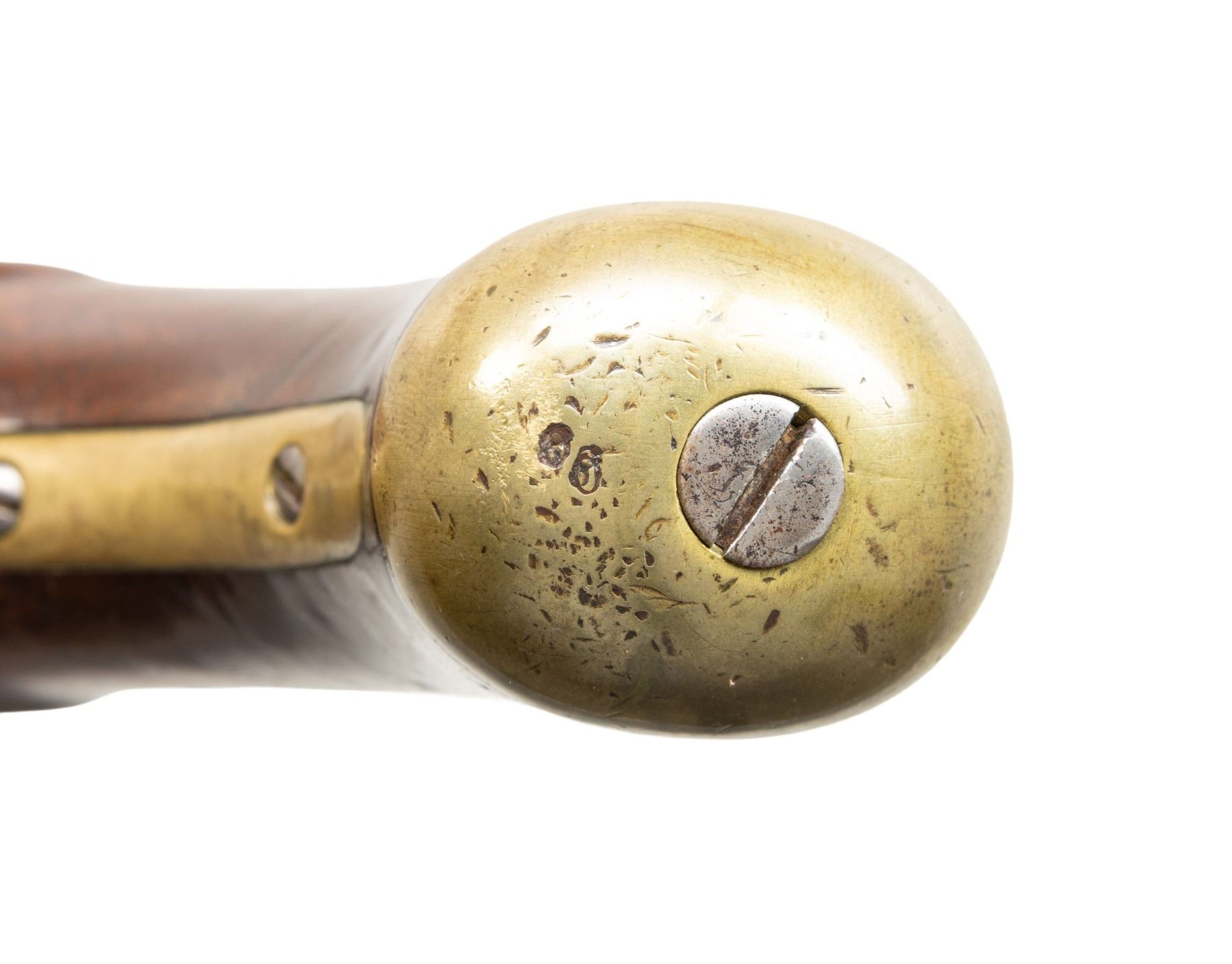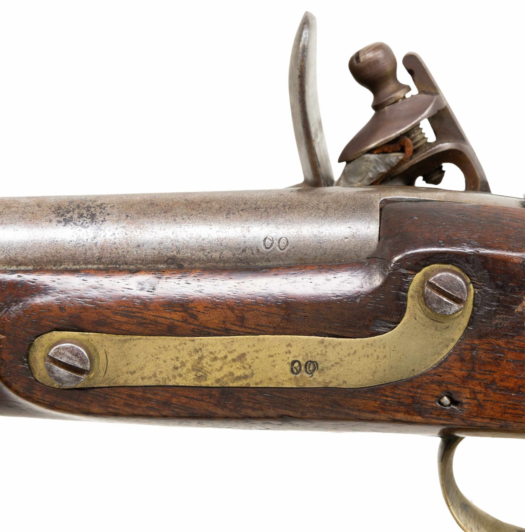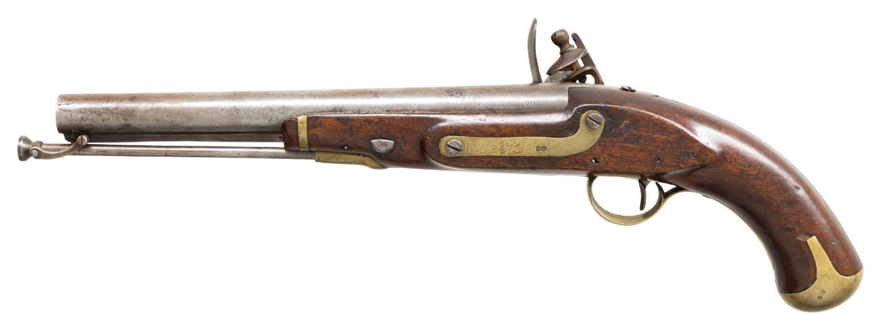 Cal. 58. NSN. Standard configuration of scarce Richmond Virginia copy of Harpers Ferry model 1805 martial pistol, 10-1/8" barrel stamped with assembly "00" on breech and matching assembly marks externally on butt cap, side plate, trigger guard and on stock. Lock is marked 1815 vertically rear of cock, "RICHMOND" forward of cock which is worn and only partially discerned. Brass furniture & captured ramrod. CONDITION: good to very good overall, appears all original though cock is replaced, probable reconversion to flint, good well discerned matching "00" assembly marks, RICHMOND stamp is weak as noted. Stock is sound with inset wood around lock. Mechanics fine, good clear smooth bore. (01-28700/JS). ANTIQUE. $6,000-8,000.
