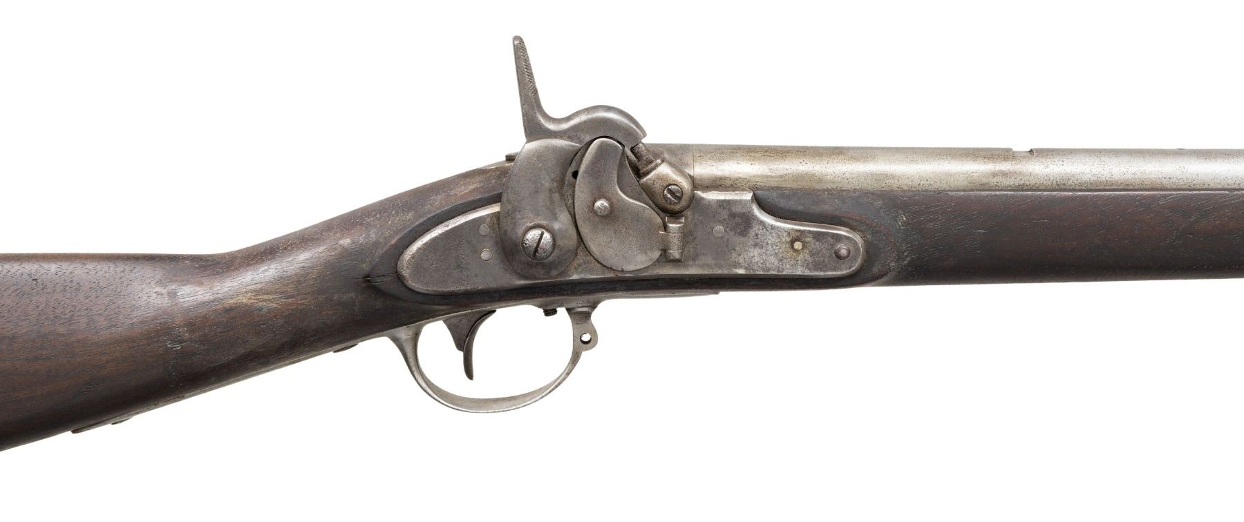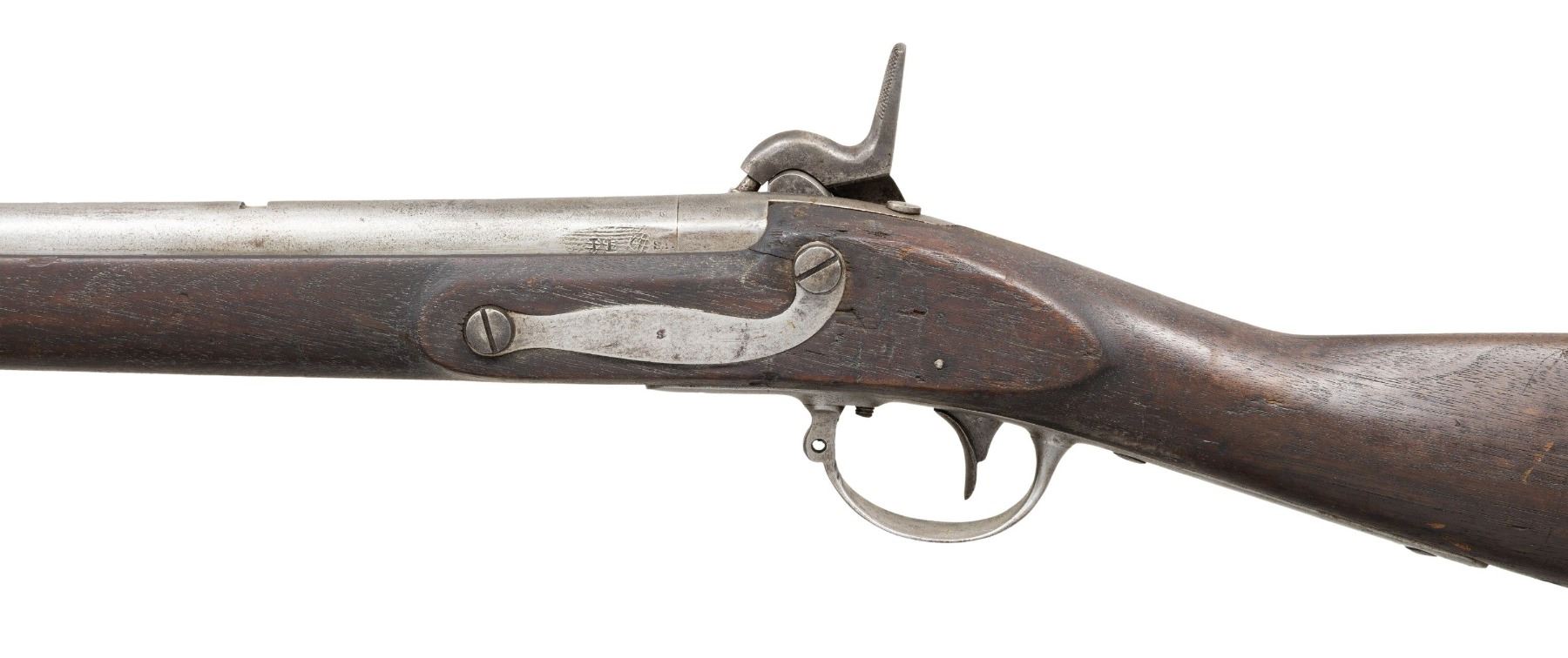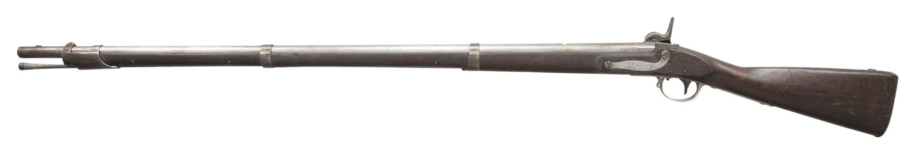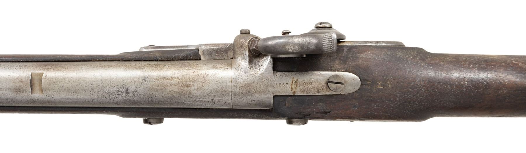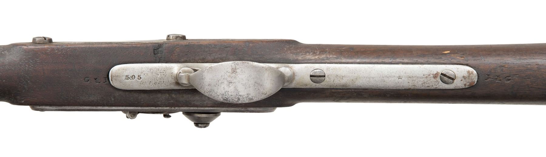MUSKET. Cal. 69. NSN. The Frankfort Arsenal made these Remington/Maynard alterations between 1856 to 1859. This example is dated 1857 on lock and patent breech. Alteration included rifling barrel and replacing flint lock with Remington made percussion lock with Maynard tape primer which is functional. Lock marked "REMINGTON'S / ILION N.Y. / 1857 / U.S.". 57.5" overall, 42" barrel. The patent breech replaces the last inch of the original barrel and is dated 1857 with indiscernible unit markings. CONDITION: good overall, appears complete and matching, cleaned gray metal with pitting, missing rear fixed sight. Unknown unit initials and rack number stamped on bottom of stock and triggerguard. (01-26922/JS). ANTIQUE. $800-1,200.