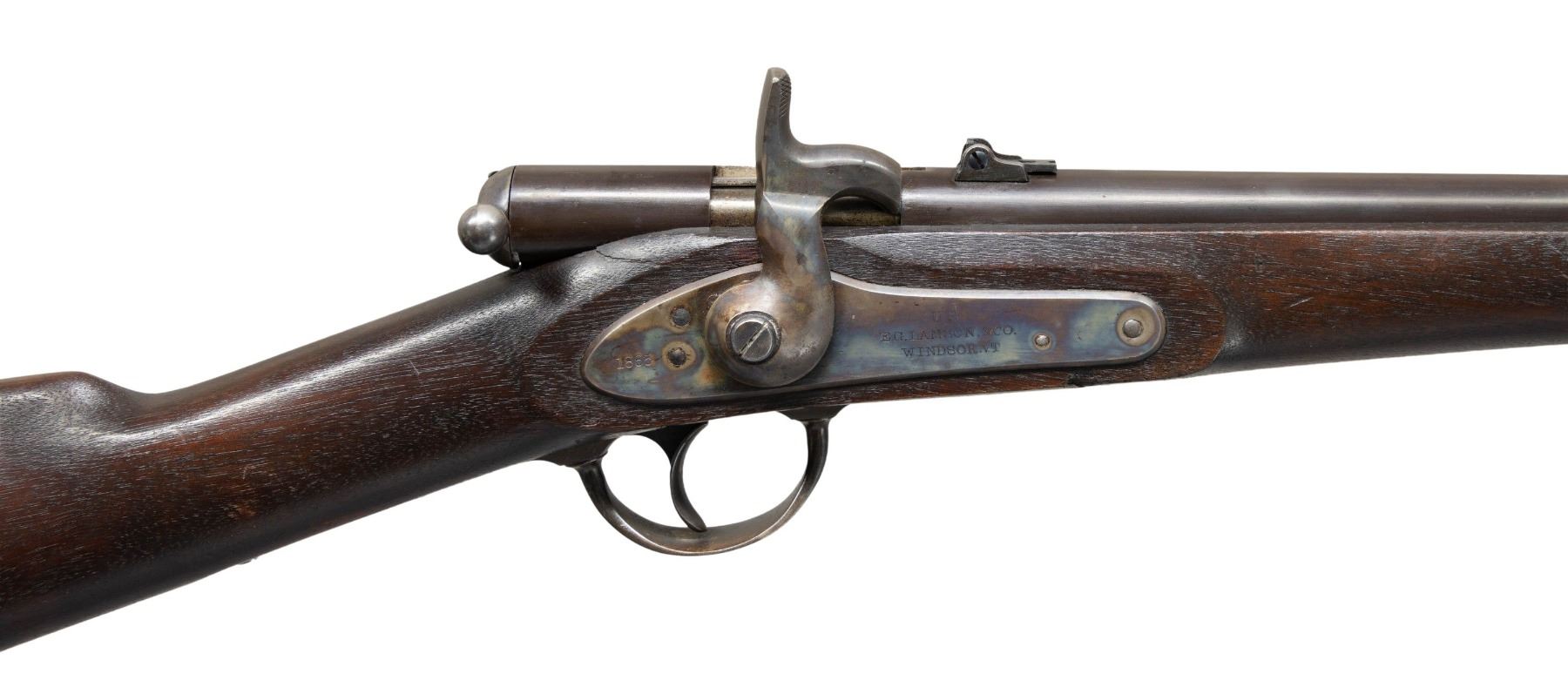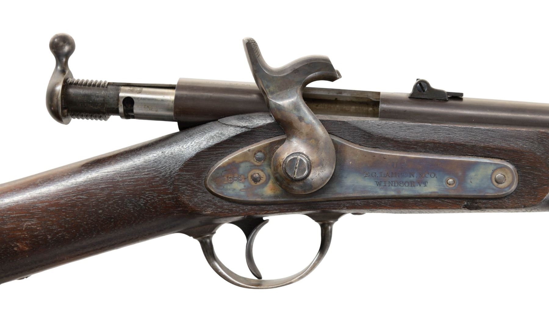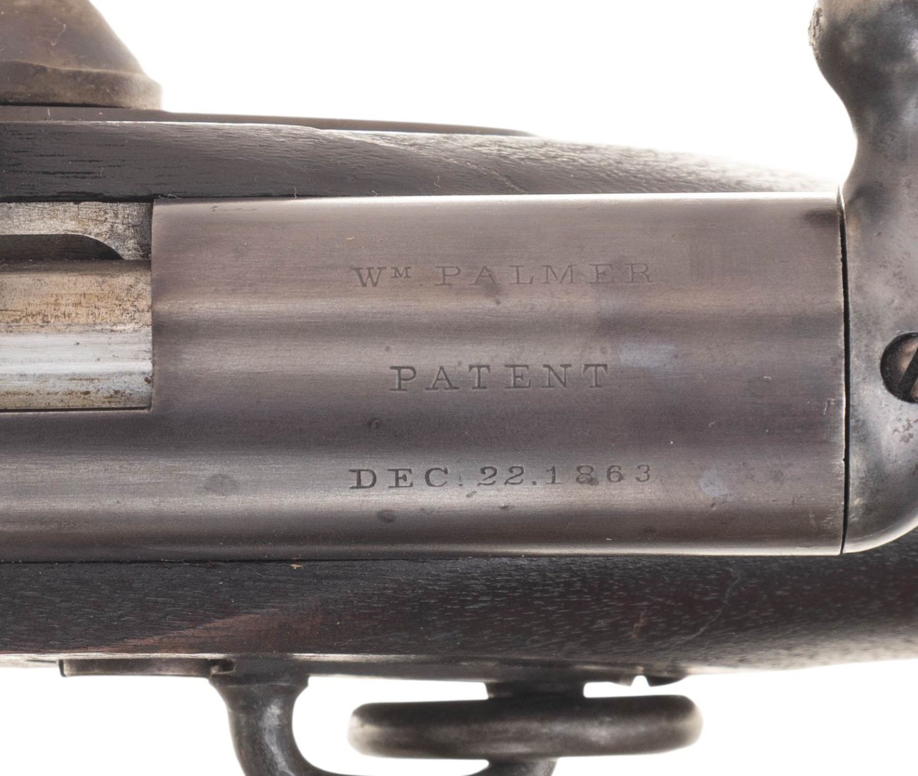 Cal. 50. NSN. This is an extremely fine example of the first bolt action metallic cartridge arm accepted by the U.S Government. Only about 1,000 of these guns were made by Lamson & Company in Windsor, Vermont & delivered in April 1865. The Palmer is operated by turning up & pulling back on the bolt. The Spencer .56-50 rimfire cartridge is rammed by the bolt into the chamber, rotated & locked in place by locking lugs. The cartridge is fired when the pointed hammer strikes the rim of the cartridge directly. This gun is in standard configuration, 20" round barrel marked in 3 lines on back of breech "WM PALMER / PATENT / DEC.22.1863", lock marked "US / E.G. LAMSON & CO / WINDSOR VT" & "1865" on tail. This is as fine an example you will find, appearing little or no use. CONDITION: extremely fine. Gun retains thin original finish on barrel & strong case colors on lock, trigger guard & buttplate. Stock is sound, crack above lock, solid w/ crisp edges w/ "MM" cartouche & other small set of inspector's initials. Mechanics fine w/bright shiny rifled bore. PROVENANCE: Estate Collection of John "Jack" Dhooghe. (01-28274/JS). ANTIQUE. $2,000-3,000.
