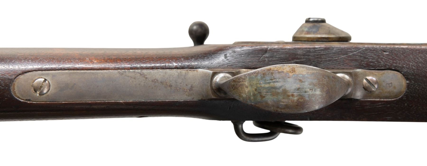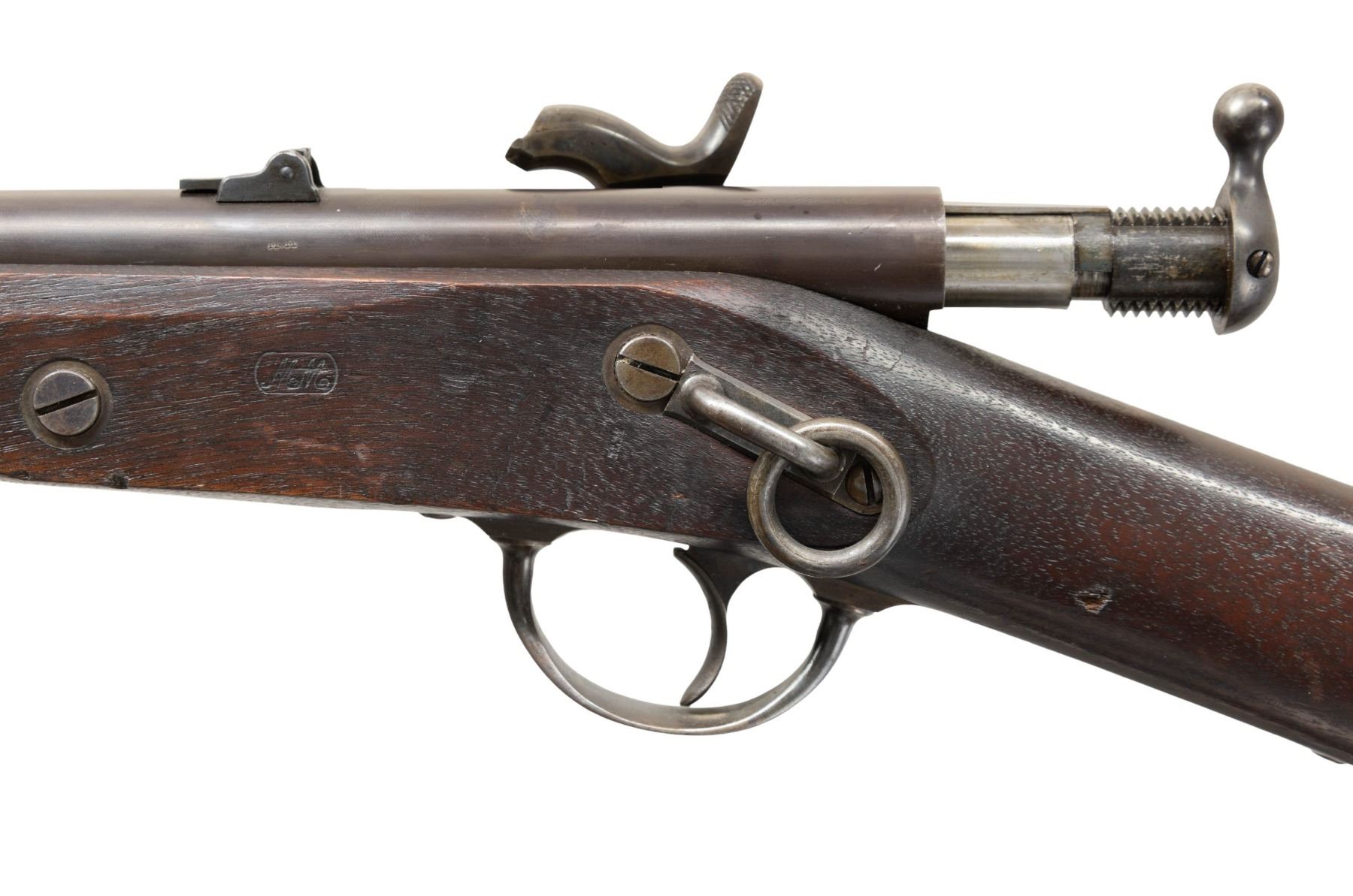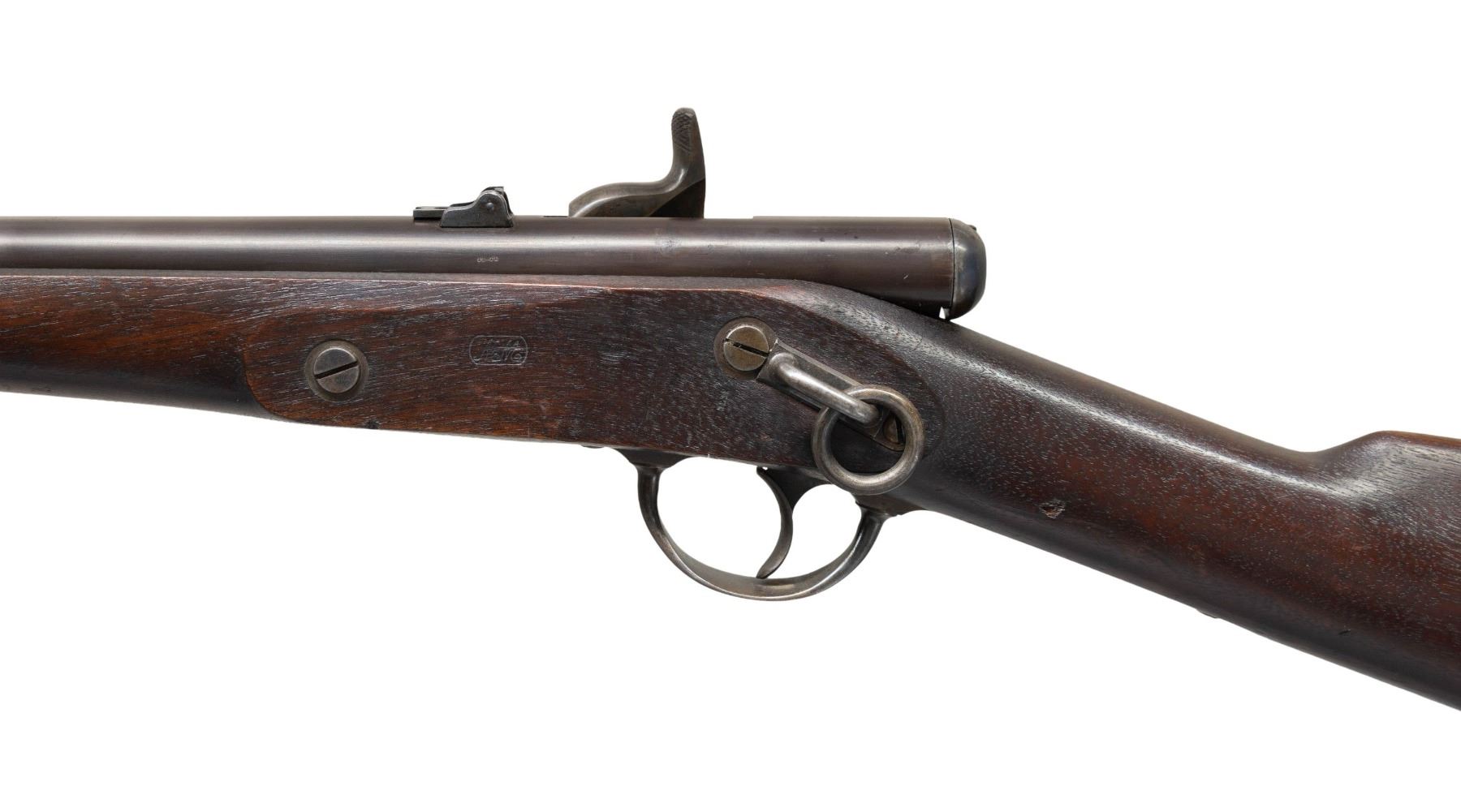 Cal. 50. NSN. This is an extremely fine example of the first bolt action metallic cartridge arm accepted by the U.S Government. Only about 1,000 of these guns were made by Lamson & Company in Windsor, Vermont & delivered in April 1865. The Palmer is operated by turning up & pulling back on the bolt. The Spencer .56-50 rimfire cartridge is rammed by the bolt into the chamber, rotated & locked in place by locking lugs. The cartridge is fired when the pointed hammer strikes the rim of the cartridge directly. This gun is in standard configuration, 20" round barrel marked in 3 lines on back of breech "WM PALMER / PATENT / DEC.22.1863", lock marked "US / E.G. LAMSON & CO / WINDSOR VT" & "1865" on tail. This is as fine an example you will find, appearing little or no use. CONDITION: extremely fine. Gun retains thin original finish on barrel & strong case colors on lock, trigger guard & buttplate. Stock is sound, crack above lock, solid w/ crisp edges w/ "MM" cartouche & other small set of inspector's initials. Mechanics fine w/bright shiny rifled bore. PROVENANCE: Estate Collection of John "Jack" Dhooghe. (01-28274/JS). ANTIQUE. $2,000-3,000.