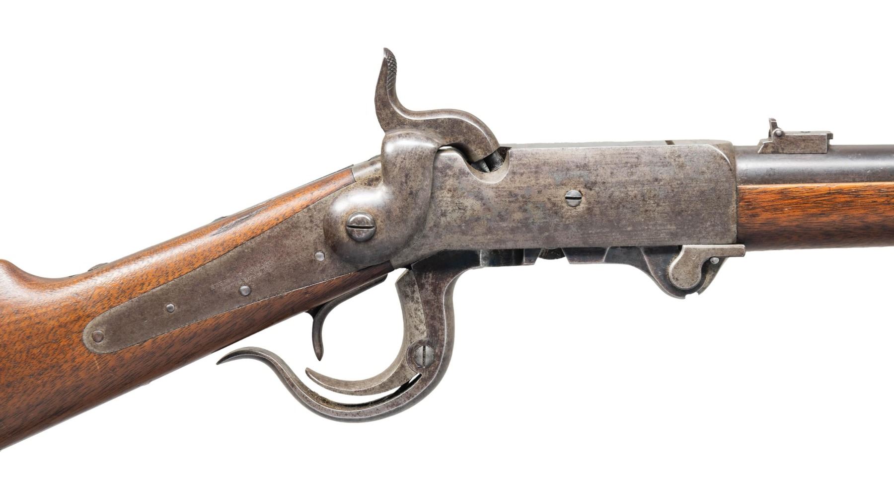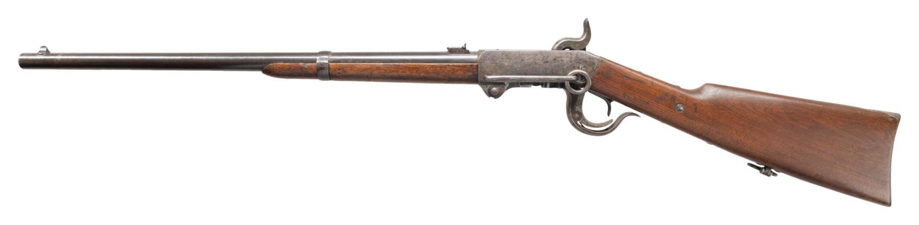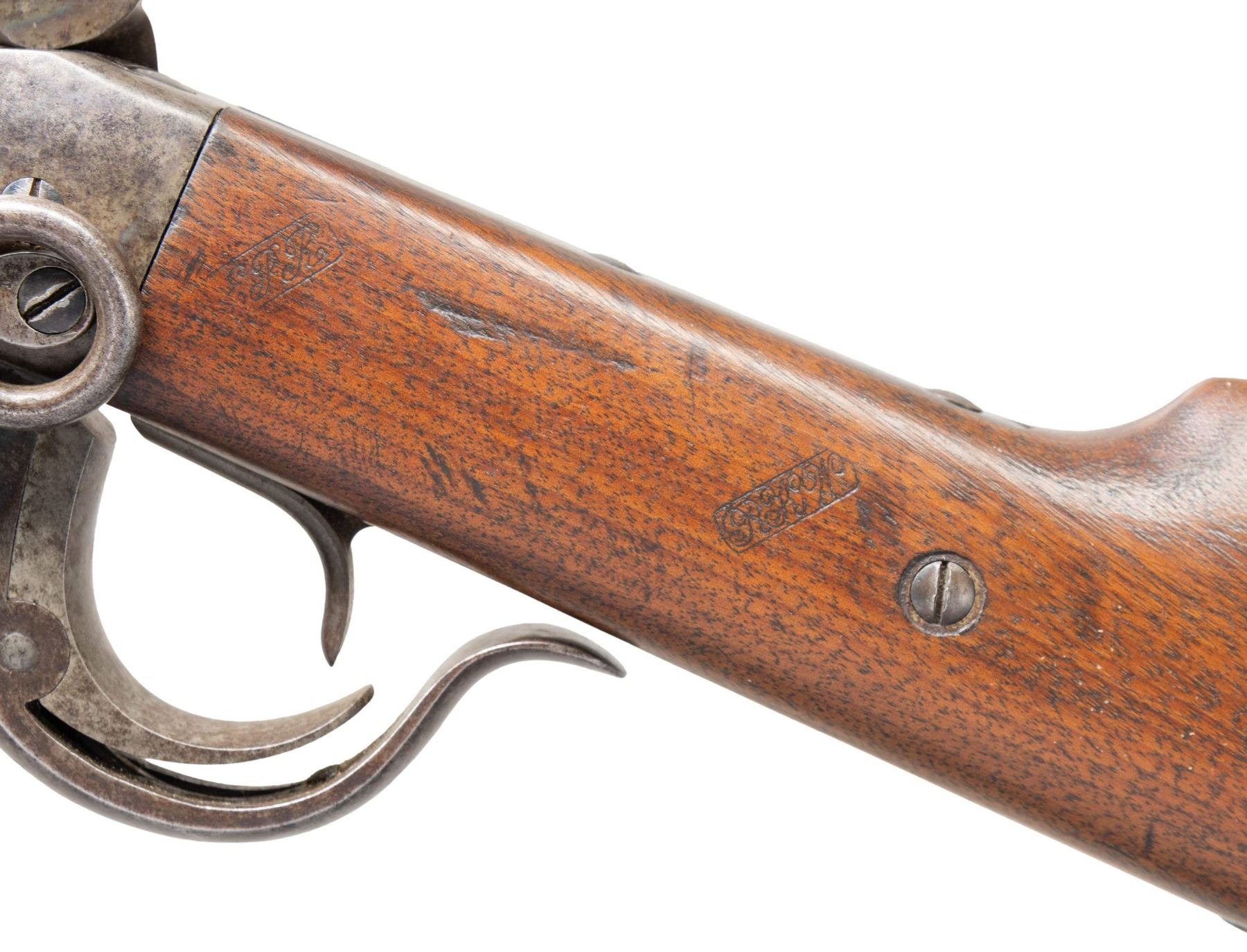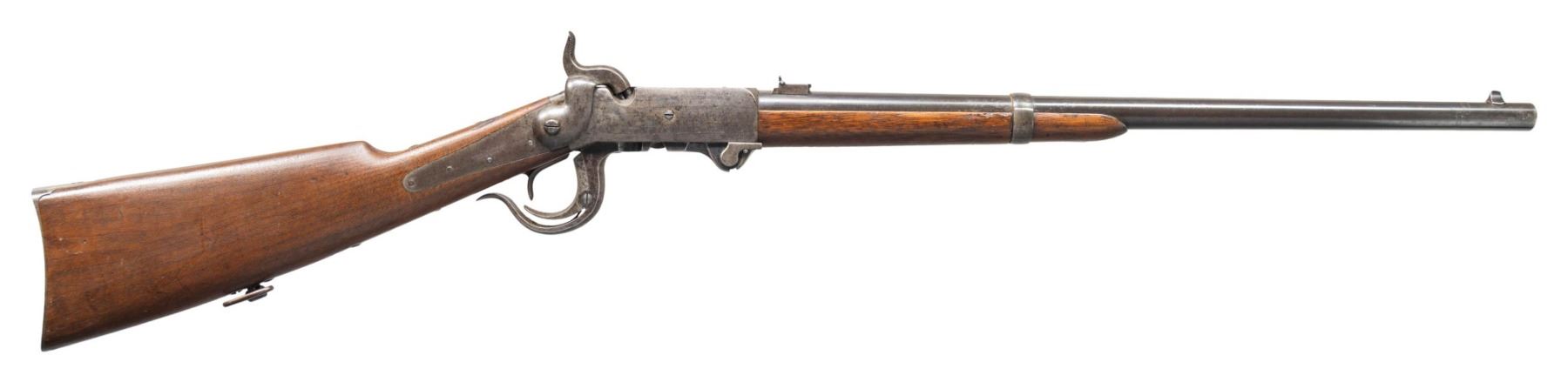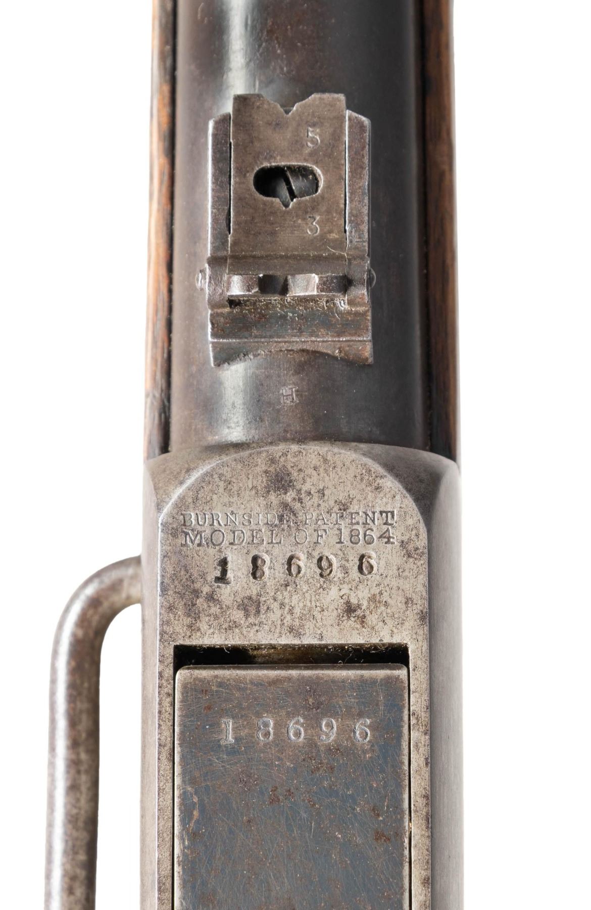 Cal. 54. S# 18696. Standard configuration of popular well received Civil War with several improvements to this last model, 39" overall, 21" barrel stamped "CAST STEEL", two position rear leaf sight, tall pinched blade front sight. This carbine utilized the unique Ambrose Burnside design "ice cream cone" shaped brass percussion cartridge. Marked "BURNSIDE PATENT / MODEL OF 1864" on breech & "BURNSIDE RIFLE CO / PROVIDENCE RI" on back action lock. CONDITION: fine overall & all matching. Barrel this overall plum patina with strong traces of blue finish, stained near muzzle. Stocks very good, sound and well fit, 2 crisp inspector cartouches. Mechanically fine w/ crisp bright bore. PROVENANCE: Estate Collection of John "Jack" Dhooghe. (01-28270/JS). ANTIQUE. $1,500-2,500.