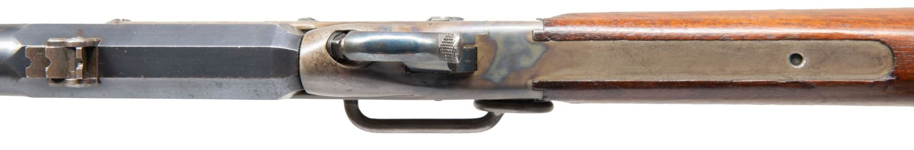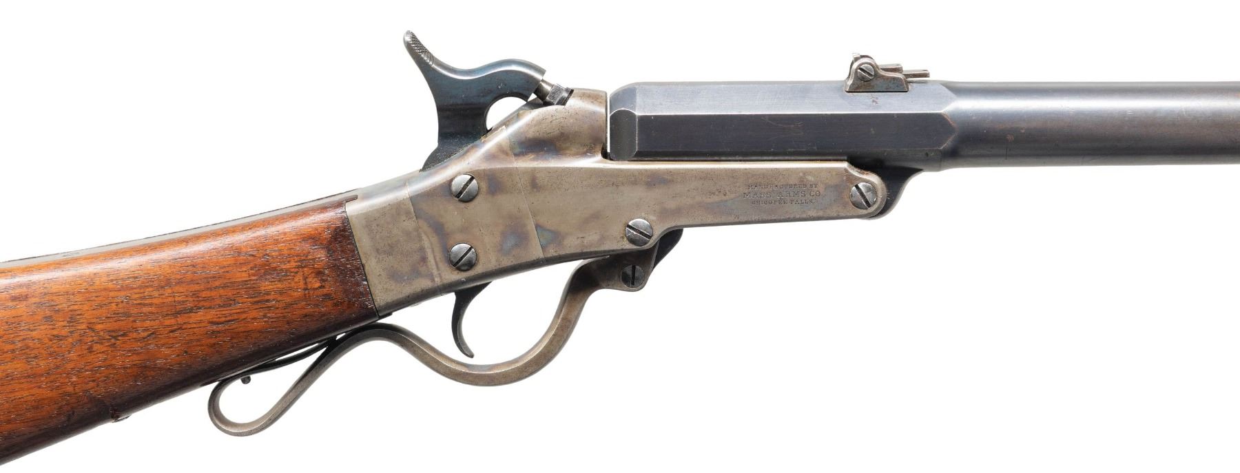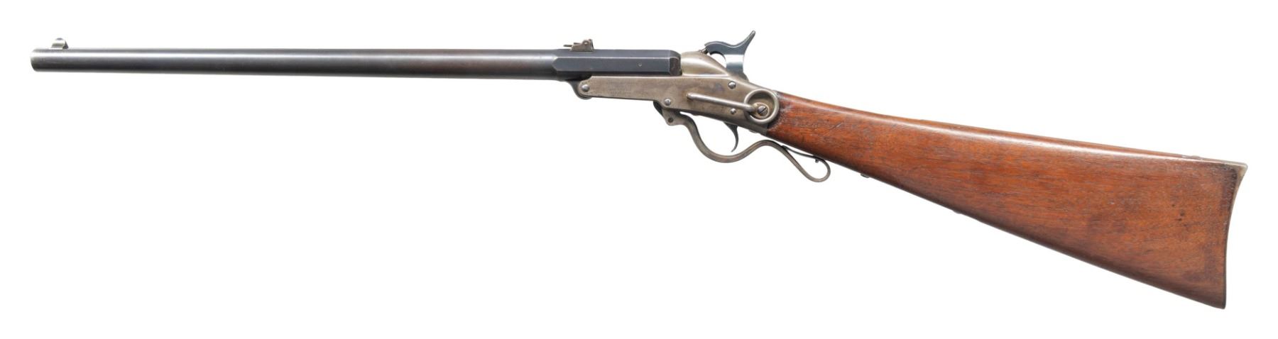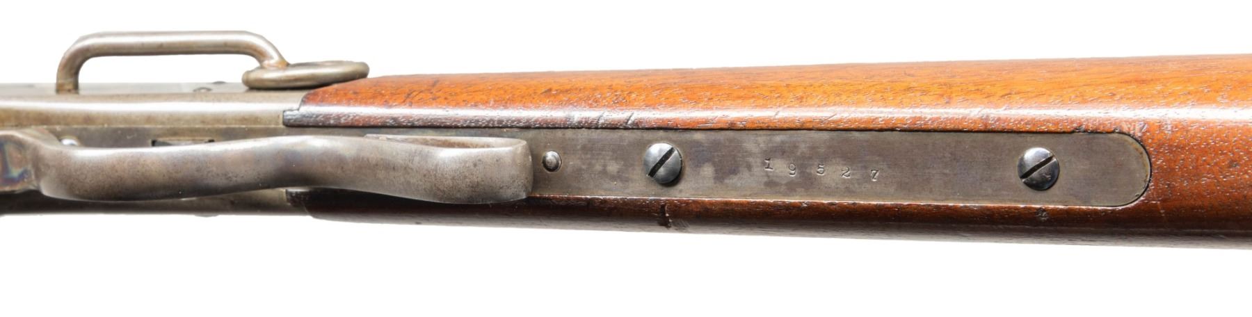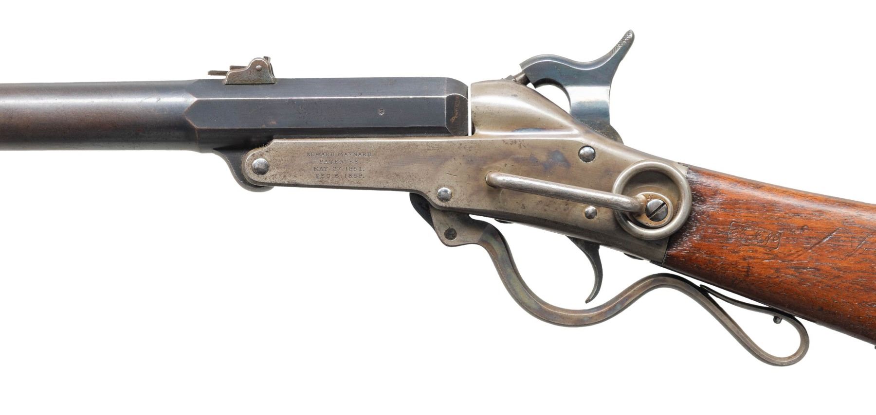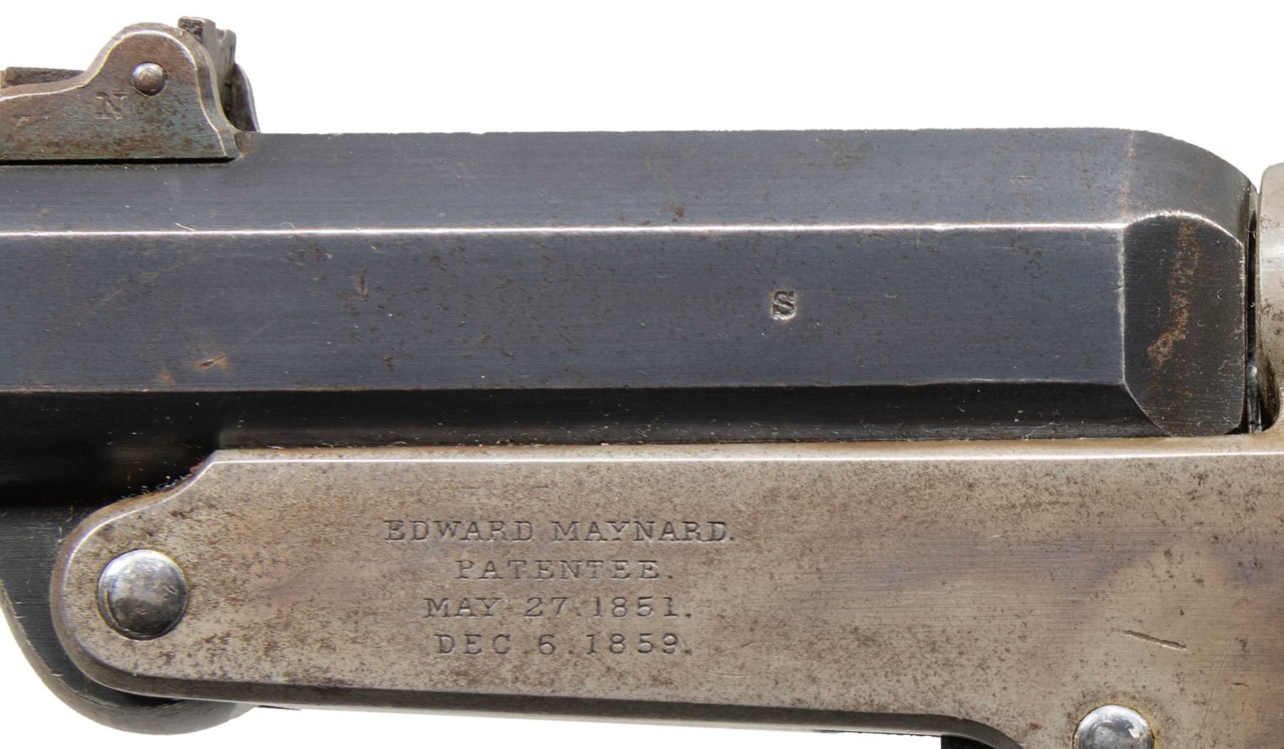 LOADING CARBINE. Cal. 50. S# 19527. Standard configuration, 20" blued octagonal to round barrel, adjustable 2-leaf rear sight, case hardened frame with 4-line Edward Maynard patent and 3-line Mass Arms manufacturer's address on either side. Carbine shows little use if any, retaining most of its original finish. CONDITION: excellent overall, complete & matching, barrel retaining 90%+ original blue, strong areas of case colors, stock is sound with 2 crisp inspector cartouches, mechanics are excellent, bright shiny rifled bore. PROVENANCE: Estate Collection of John "Jack" Dhooghe. (01-28271/JS). ANTIQUE. $1,500-2,500.