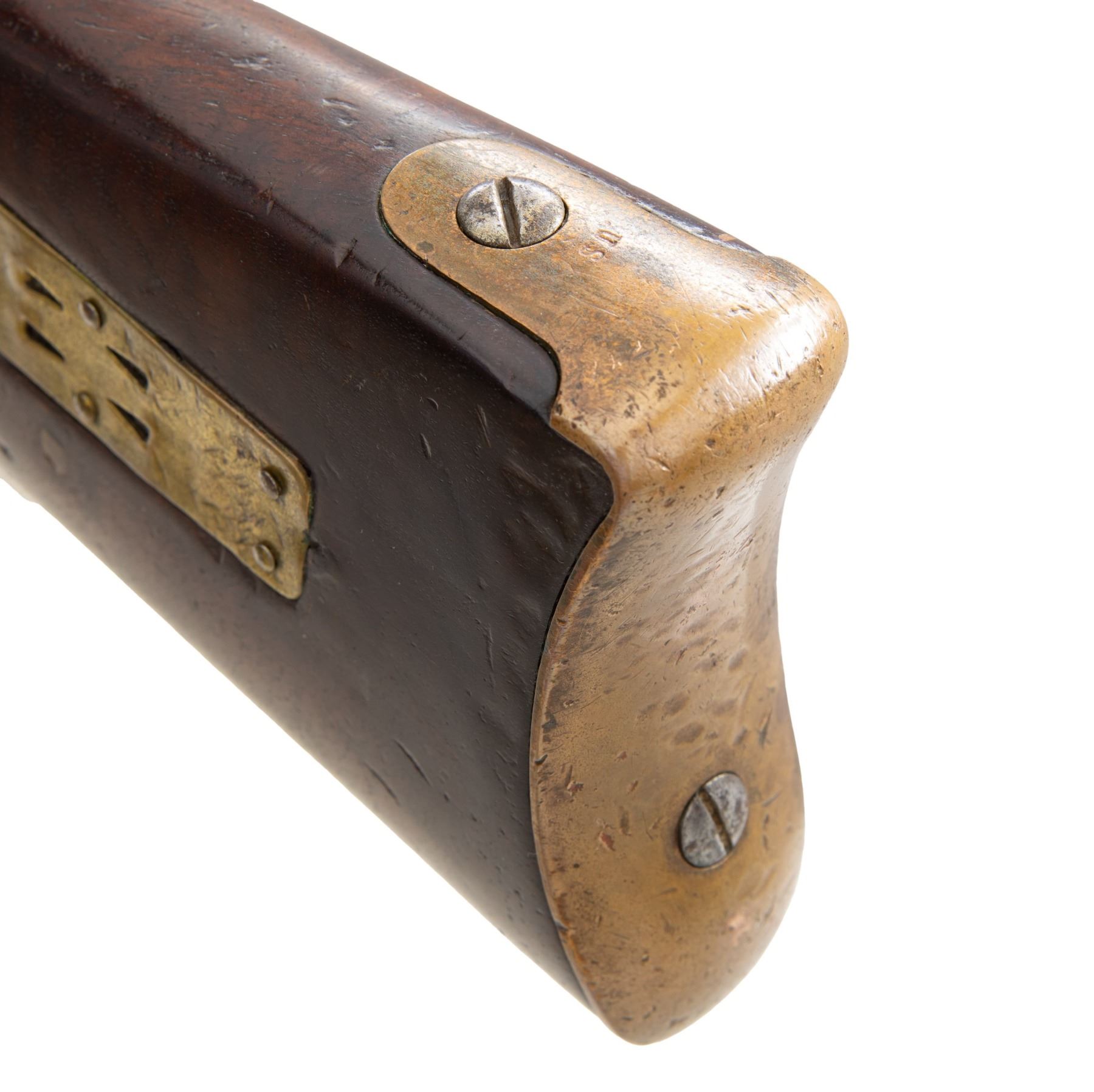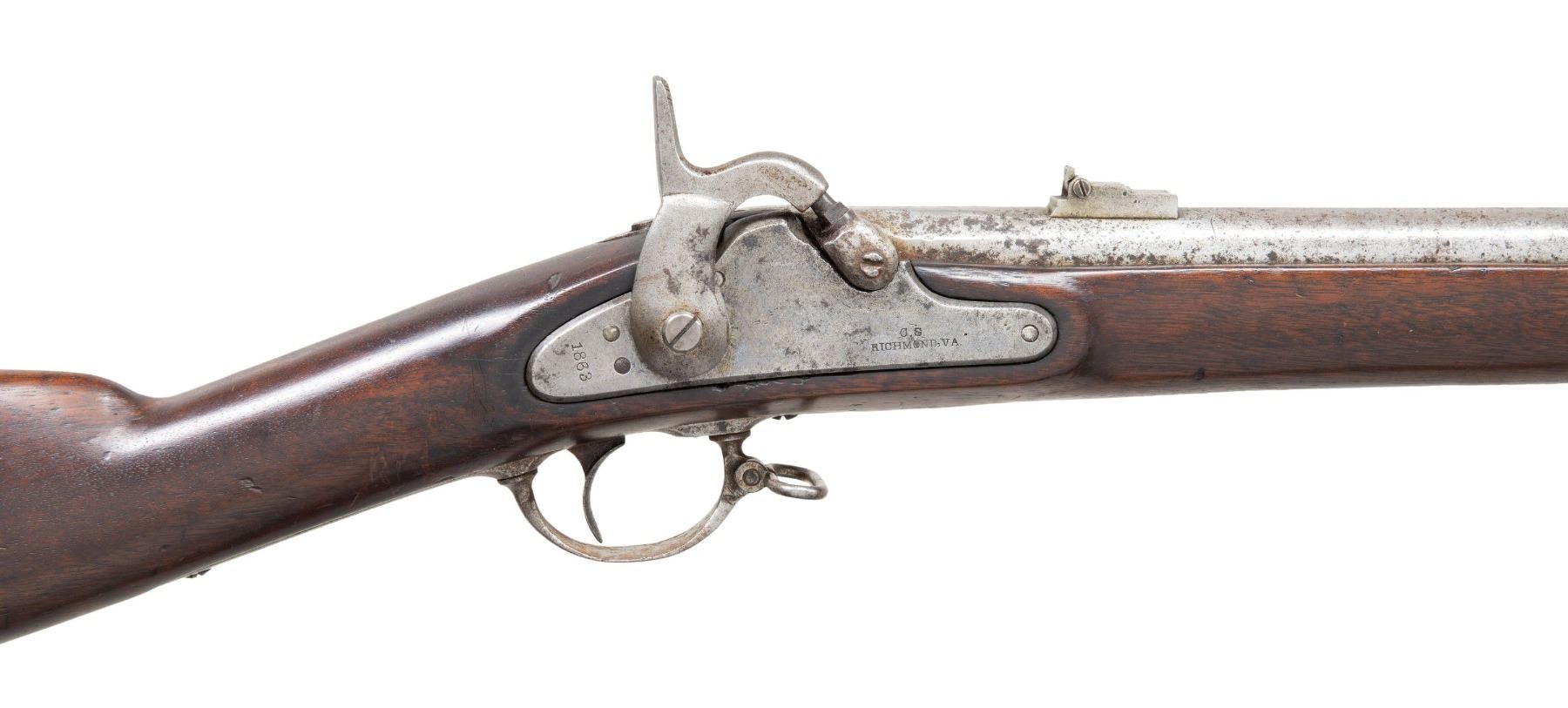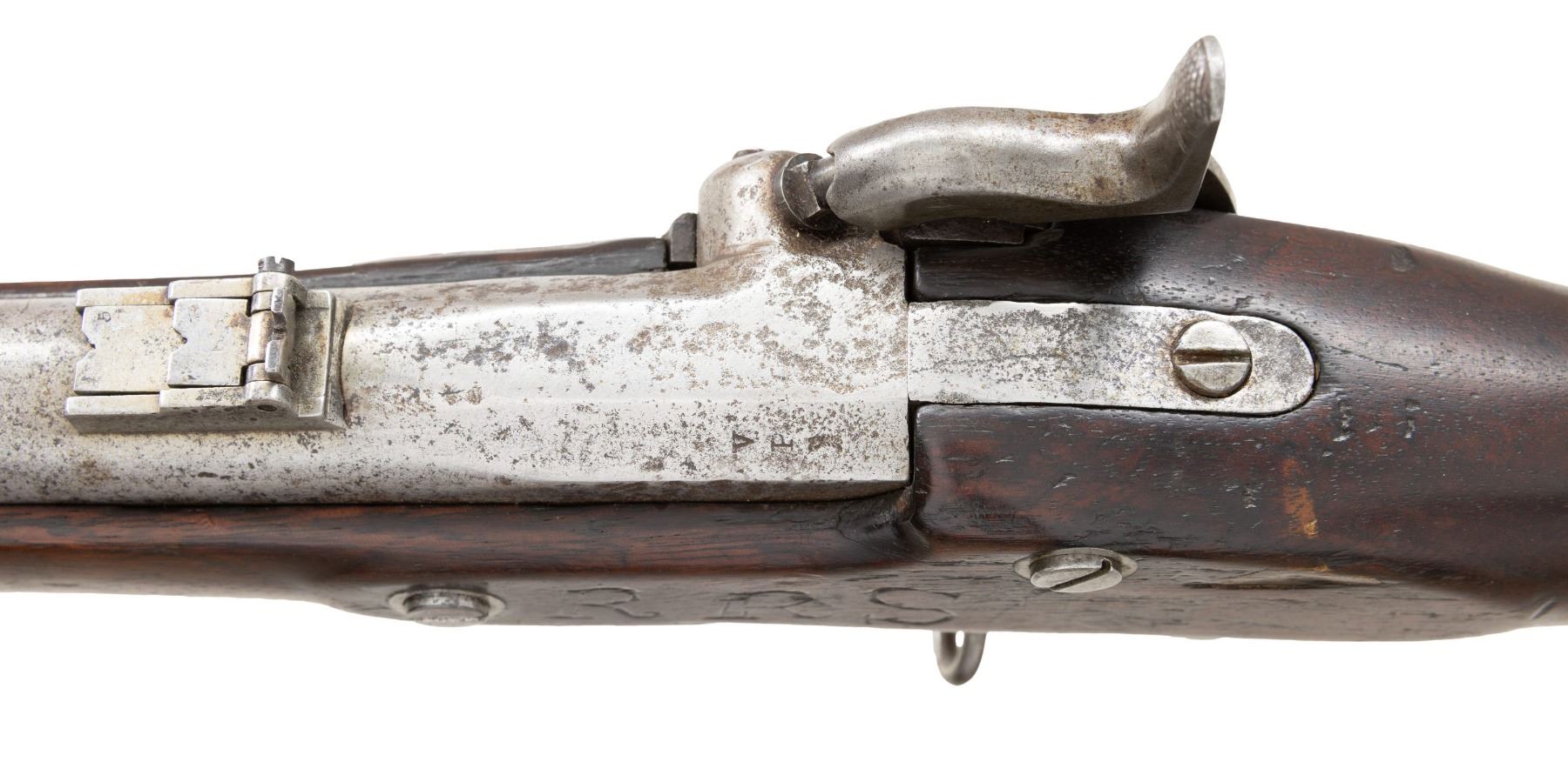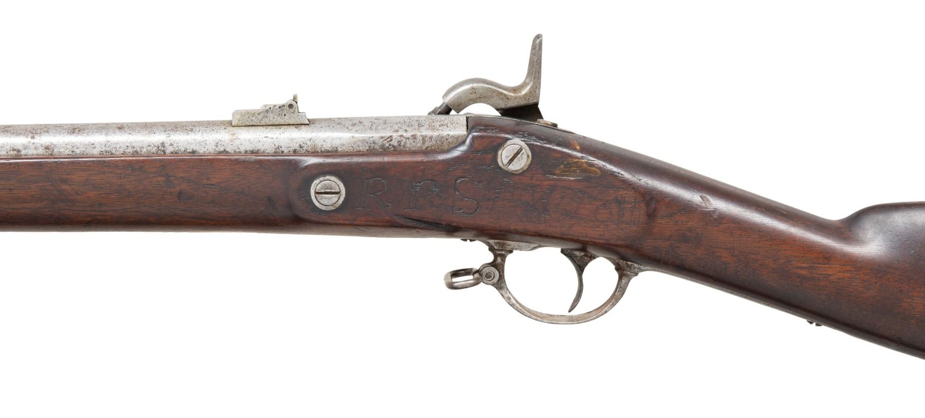 Cal. 58. NSN. This is a good original complete example of the standard production Richmond Armory rifle musket that saw lots of use but has survived in original complete condition. Standard configuration, 40" barrel, correct original rear leaf sight, correct fixed front sight, brass butt plate, brass nose cap, ramrod appears original to time of use though 1855 pattern with swell which are often found wartime replacements. "VP" & eagle head proof at breech are discernible including broken "P" characteristic of Richmond manufacture. Barrel date is not visible due to pitting from hard use. The lock is dated "1863" at tail & "C.S. / RICHMOND, VA" forward of hammer. All components appear of Richmond manufacture except for the rear band which appears Harpers Ferry. Captured Harpers Ferry finished parts were generally utilized on earliest production muskets, this example probably early 1863. This is among the most difficult Confederate arms to find unmolested. Soldier has personalized with initials "RRS" carved opposite lock and left side of butt has a US belt keeper inset and small US stamped on top of buttplate. CONDITION: good overall. Complete & original, metal cleaned with pitting. Stock is refinished, carved soldier's initials "RRS" still crisp. Mechanically functional, good worn rifled bore. PROVENANCE: Bob Alispones estate collection. (01-28684/JS). ANTIQUE. $5,000-7,000.