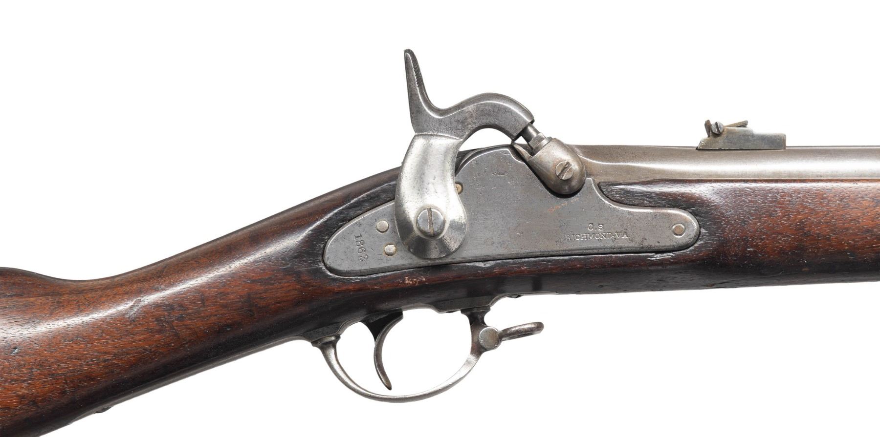 Cal. 58. NSN. Standard configuration Richmond Armory rifle, 40" barrel, correct style rear leaf sight, Richmond brass butt plate, brass nose cap, original swell 1855 style ramrod, "1863" barrel date & "VP" & eagle head proof are not Richmond, lock is dated "1863" at tail & "C.S. / RICHMOND, VA" forward of hammer. CONDITION: very good overall, strong mechanics, good rifled bore, stock has 2 federal cartouches, one over-stamped "68 VA". PROVENANCE: Bob Allispones estate collection. (01-28685/JS). ANTIQUE. $3,000-4,000.