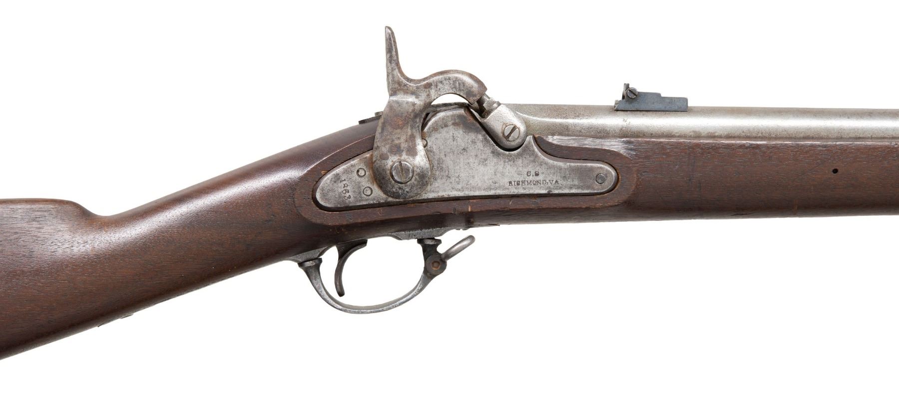 Cal. .58. NSN. Standard configuration Richmond Armory rifle, 40" barrel, correct style rear leaf sight, Richmond brass butt plate, brass nose cap, straight threaded ramrod, "1863" barrel date & "VP" & eagle head proof are not Richmond, original Richmond lock is dated "1863" at tail & "C.S. / RICHMOND, VA" forward of hammer. CONDITION: very good overall as assembled, strong mechanics, good rifled bore, stock has raised grain and sharp edges. PROVENANCE: Bob Allispones estate collection. (01-28686/JS). ANTIQUE. $3,000-4,000.
