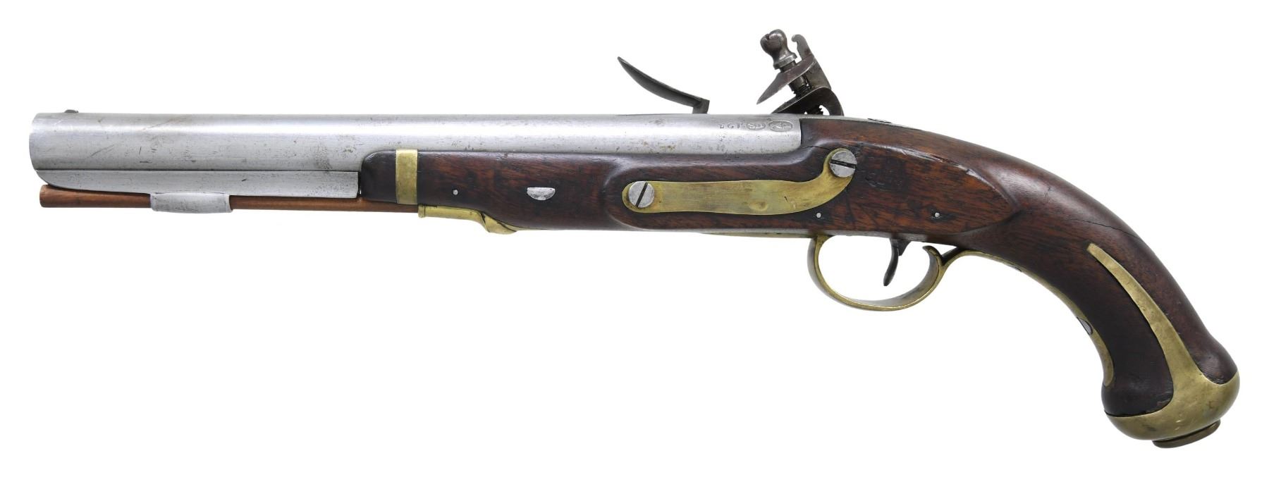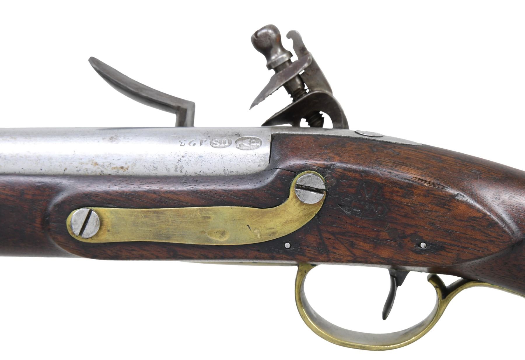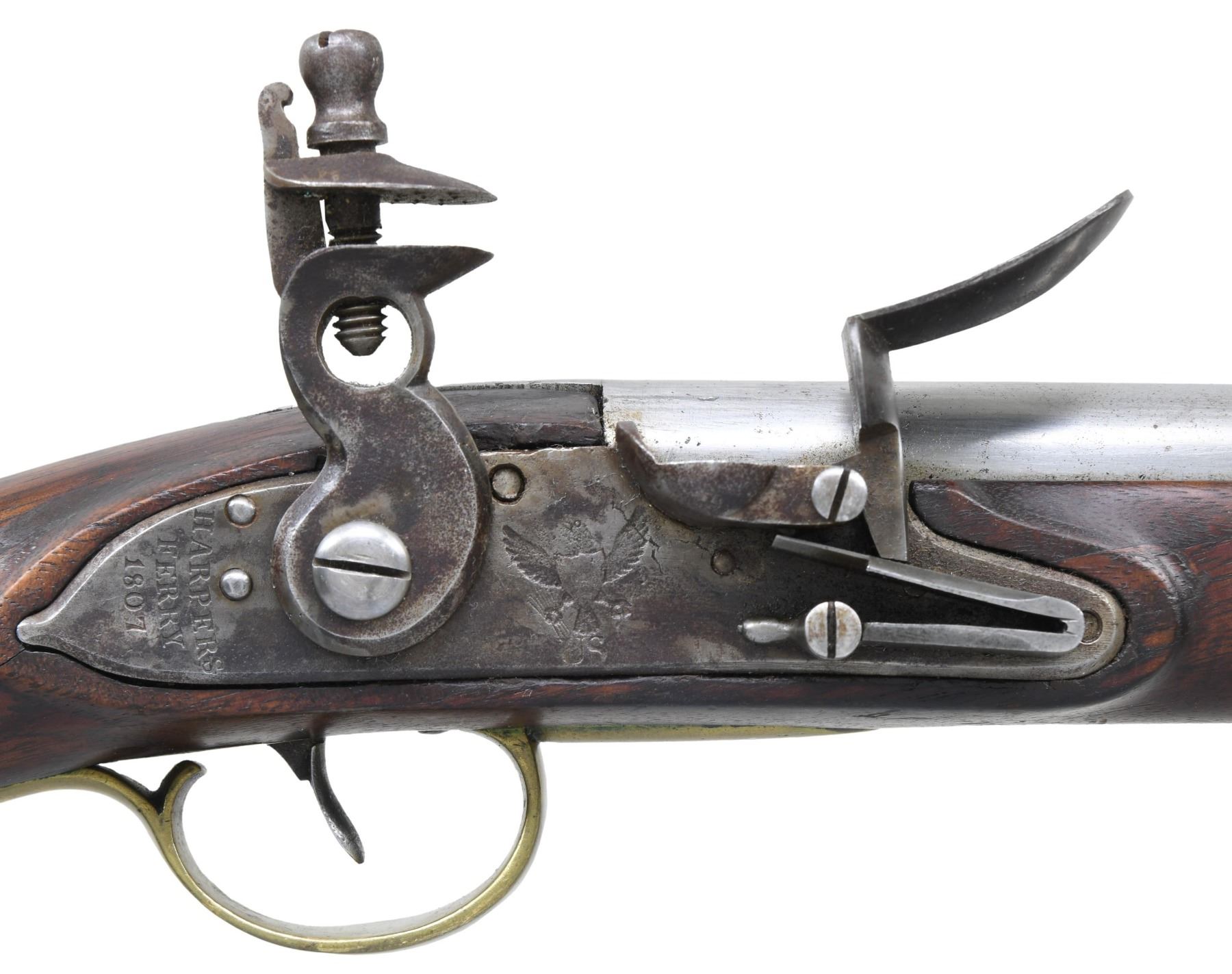 Cal. 54. S# 423. Always considered among the most beautiful and aesthetically pleasing of American martial pistols, the 1805 is the logo gun of the American Society of Arms Collectors. These guns were made in pairs between 1806 and 1808 with a total production of about 4,000 guns with each gun of a pair having same serial number. This gun is in the normal configuration of other guns in this pattern with 10" round barrel, breech marked with raised eagle over "P" in a sunken oval behind a raised "US" in a sunken oval behind stamped S# 423. Lock is marked "HARPERS / FERRY / 1807" in vertical arcs behind cock. Under the pan is a spread winged eagle facing toward the cock over "US". The wood opposite the lock is marked with script inspector initials "V" over "CW" (inspector Charles Williams). This a pleasing example from old Massachusetts collection. CONDITION: good to very good overall, good markings, barrel cleaned to bright. Well done reconversion from percussion back to flint, stock has well done crack repair at wrist, hairline forward of trigger guard. All original with exception of battery components from reconversion and new wood ramrod. Mechanics are sound, smooth clear bore. PROVENANCE: White's Auction, Attleboro, Mass, October 6, 2001, lot 212. (01-26599/JS). ANTIQUE. $4,000-6,000.