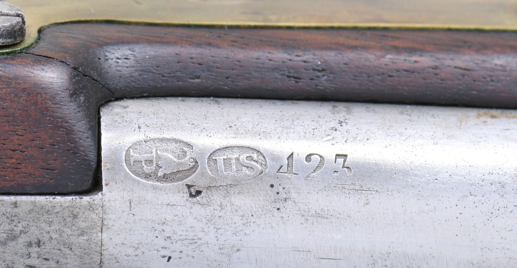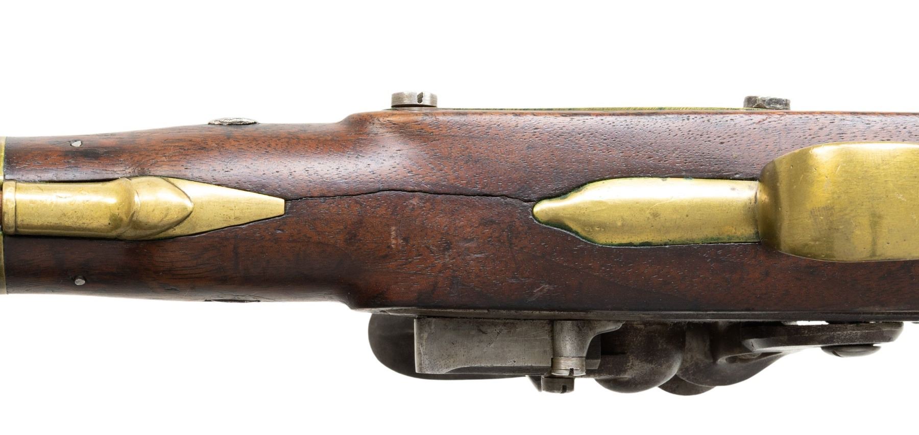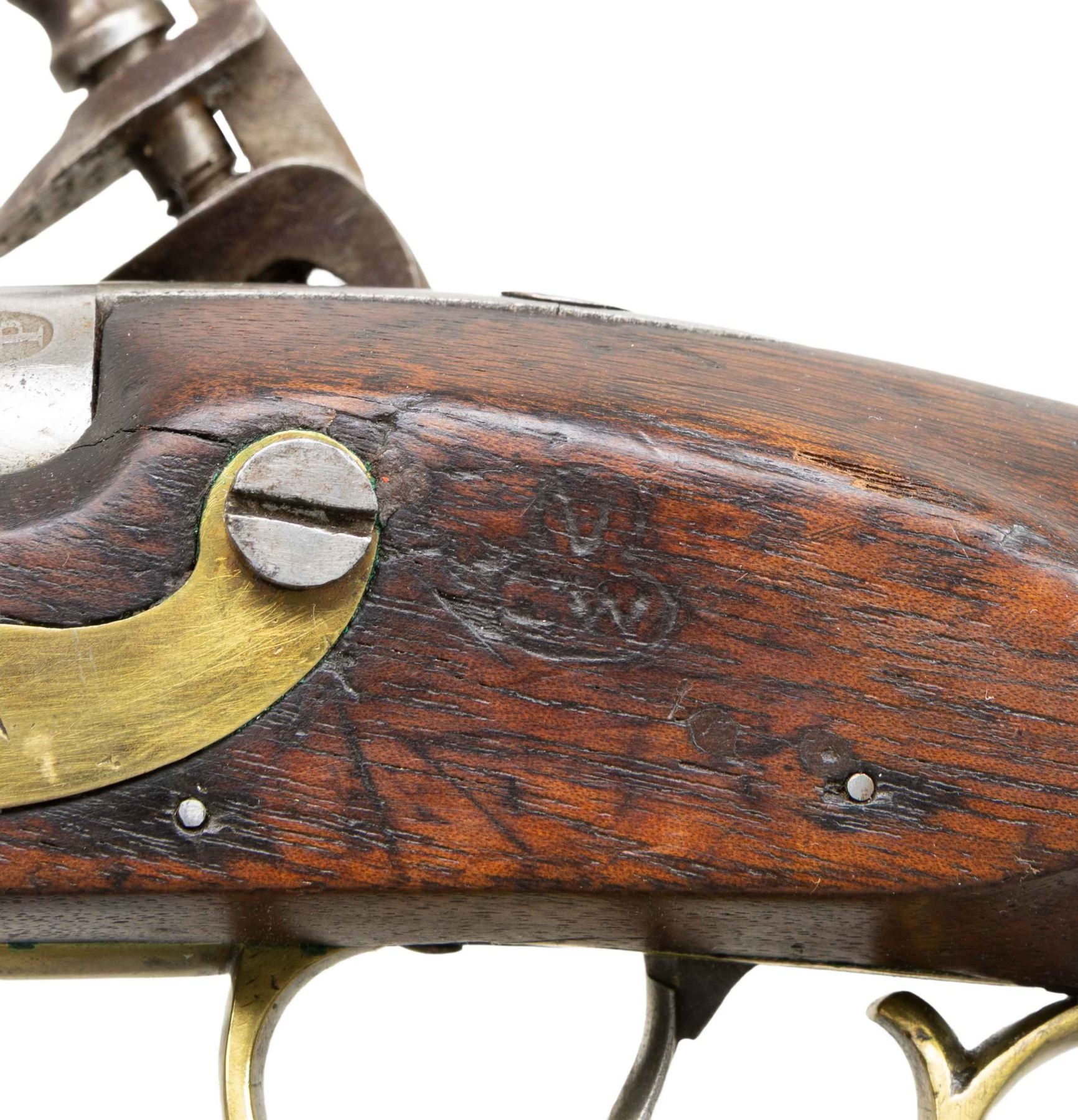 Cal. 54. S# 423. Always considered among the most beautiful and aesthetically pleasing of American martial pistols, the 1805 is the logo gun of the American Society of Arms Collectors. These guns were made in pairs between 1806 and 1808 with a total production of about 4,000 guns with each gun of a pair having same serial number. This gun is in the normal configuration of other guns in this pattern with 10" round barrel, breech marked with raised eagle over "P" in a sunken oval behind a raised "US" in a sunken oval behind stamped S# 423. Lock is marked "HARPERS / FERRY / 1807" in vertical arcs behind cock. Under the pan is a spread winged eagle facing toward the cock over "US". The wood opposite the lock is marked with script inspector initials "V" over "CW" (inspector Charles Williams). This a pleasing example from old Massachusetts collection. CONDITION: good to very good overall, good markings, barrel cleaned to bright. Well done reconversion from percussion back to flint, stock has well done crack repair at wrist, hairline forward of trigger guard. All original with exception of battery components from reconversion and new wood ramrod. Mechanics are sound, smooth clear bore. PROVENANCE: White's Auction, Attleboro, Mass, October 6, 2001, lot 212. (01-26599/JS). ANTIQUE. $4,000-6,000.