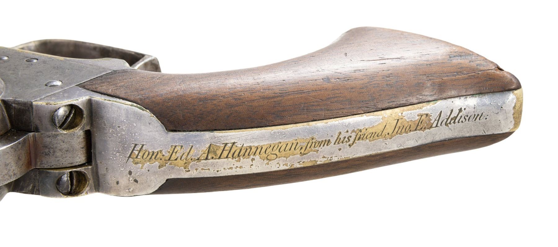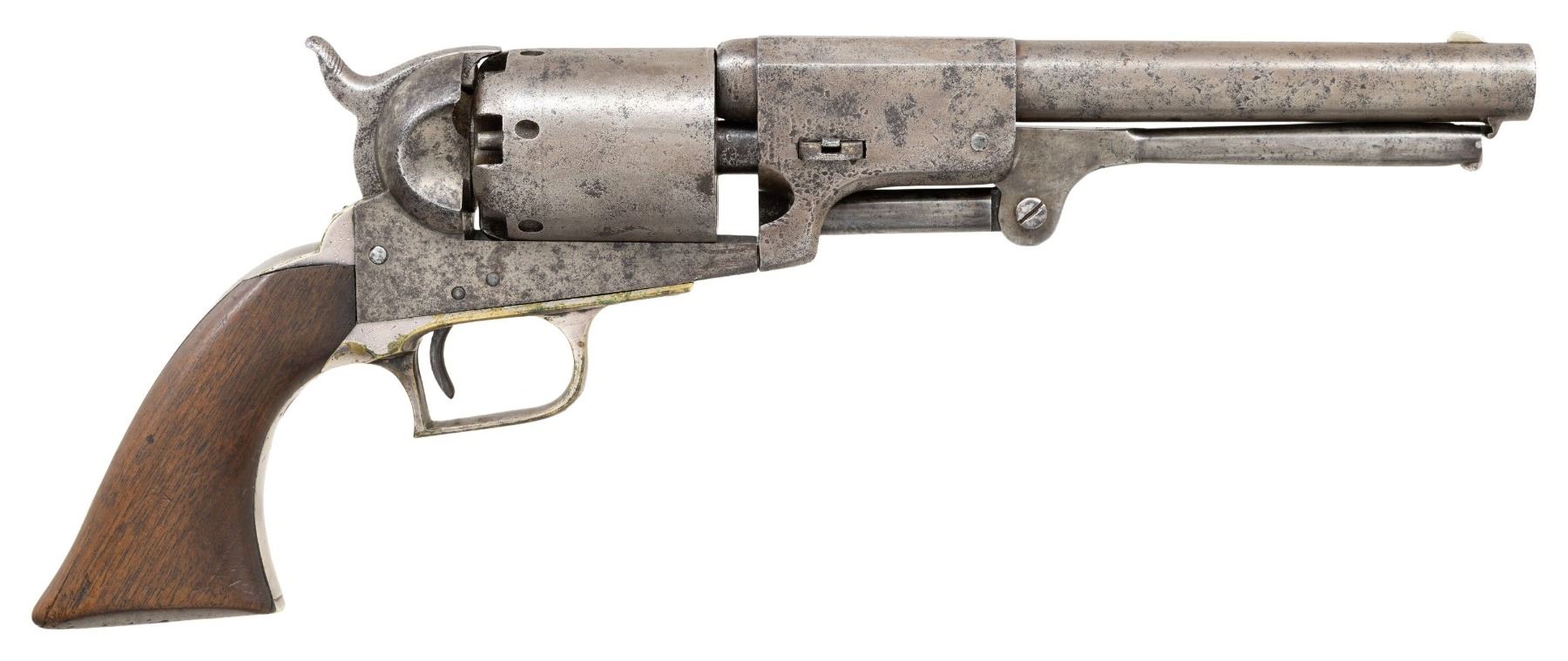 "TRANSITIONAL WALKER" REVOLVER. This very rare transitional Walker is one of 29 documented survivors found serial numbered between 1100-1340. Rarer than Walker Colts in percentage survival. Of the 240 transitional Walkers made, only 12% survive and many fakes are known. This revolver is impeccable and has long collection history. It is pictured and described in the 1974 "COLT ENGRAVING" described as "one of the earliest factory inscribed Colt Revolvers.." The inscription on backstrap reads "Hon. Ed A. Hannegan from his friend Jno. E. Addison". Revolver has tiny Whitneyville S#s used on civilian Walkers S# 1001-1099, grip frame has rounded shape of Walker with trigger guard tapering rear of frame, grips are thin & beveled like Walkers, same barrel address found on documented Walkers. This is a rare survivor with unique presentation & history made in 1848. Edward Allen Hannegan (1807-1859) was US Senator at time of presentation and had a colorful history, US representative and senator from Indiana was outspoken advocate for expansion of slavery into new US territories. He was beaten in bar room attack in late 1847 and revolver was given to him shortly after by Jno. E. Addison, a Washington attorney before Congress. UNATTACHED ACCESSORIES: copy of page from 1974 "Colt Engraving" by RL Wilson, copy of Dick Salzer article on this once called Fluck revolvers. Research and bio on the colorful Ed Hannegan. CONDITION: very good overall, original & matching other than replaced Colt loading assembly numbered 578 (renumbered horizontally over original vertical 578) Matching S#s observed on barrel, frame, cylinder, arbor, back strap & trigger guard. Metal overall mottled gray patina with pitting, grip frame retains about 80% silver plate, inscription, address, and S#s good overall. Cylinder has tiny trace of rolled scene and visible tiny S#. Mechanics are good, crisp rifled bore. PROVENANCE: Herb Glass Sr; Charles Shriner collection; Enrique Guerra collection 1994. (01-28034/JS). ANTIQUE. $40,000-60,000.