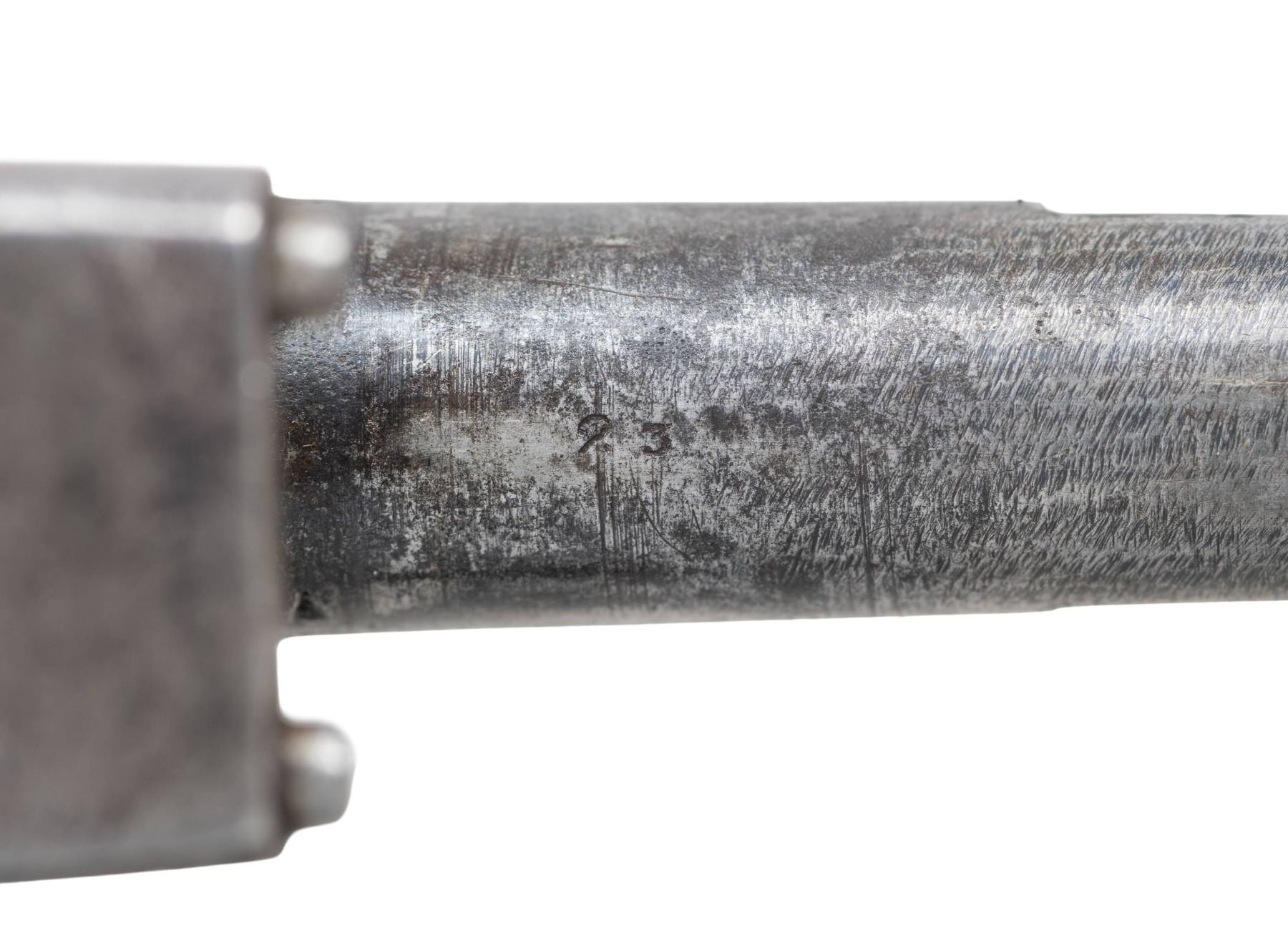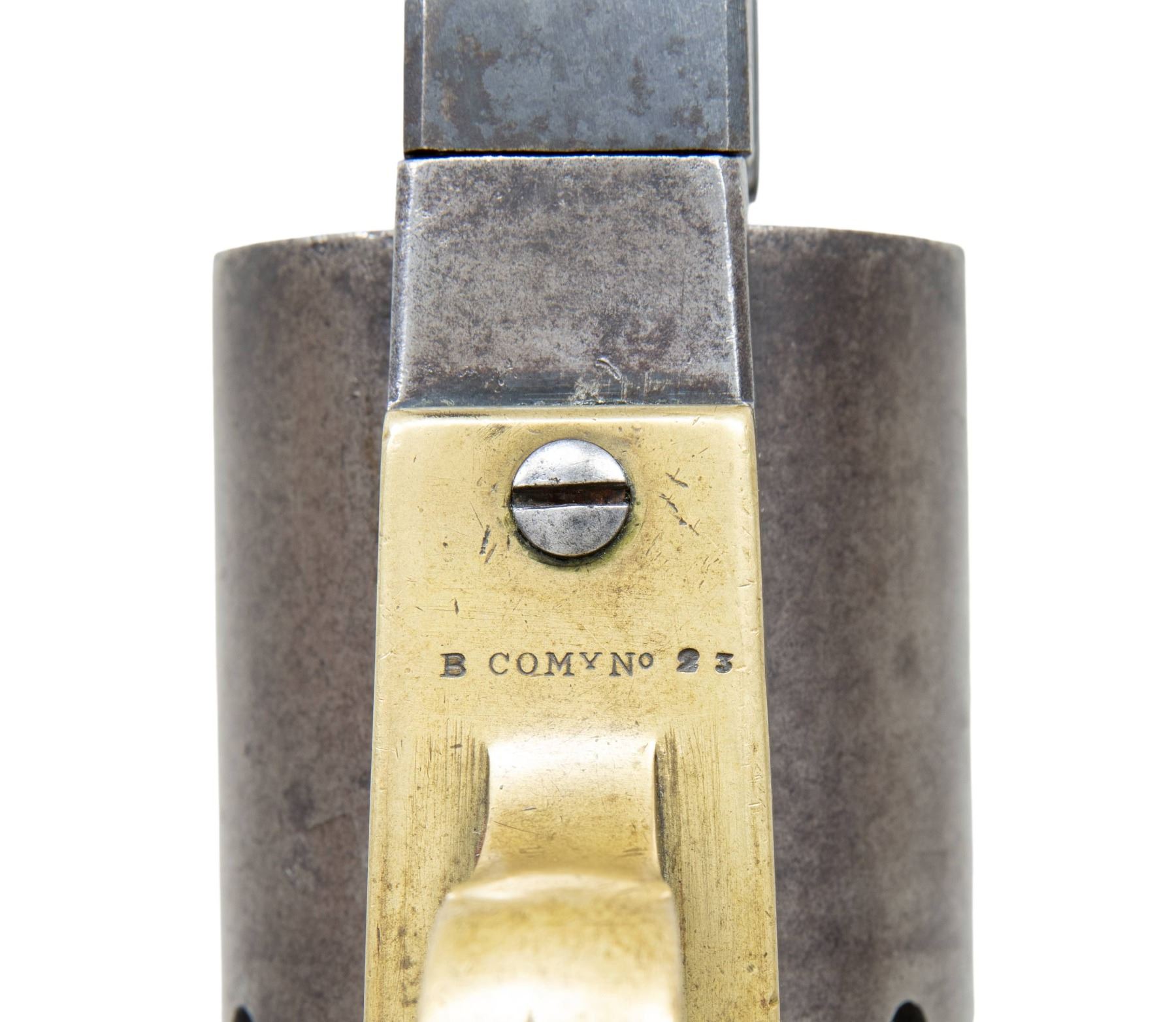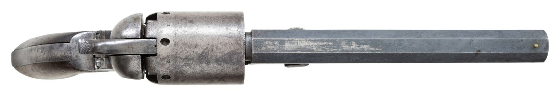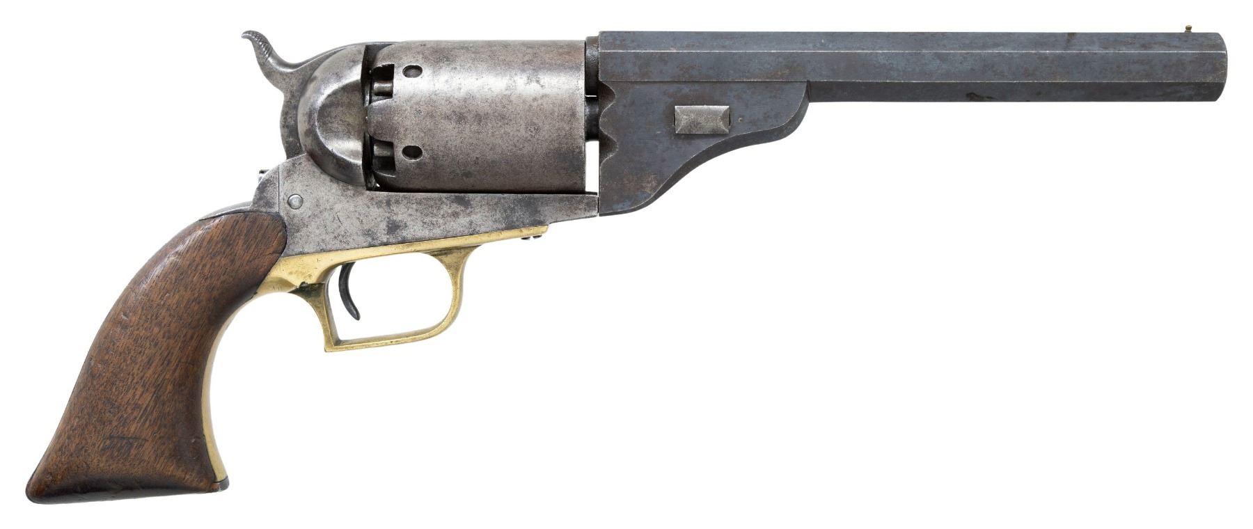 UNIQUE PERIOD REPLACEMENT PATERSON STYLE BARREL. # 23.Cal 44. S# B company 23. This unique Colt Walker has a period Paterson-style replaced barrel. This revolver has long collection history and is listed in the earliest Walker documented S# lists. It also has certificate from TGCA Parade of Walkers 2003. Revolver has British proofs on each cylinder chamber meaning it must have had a British proofed barrel at some point in its life after American army issue. The original Walker barrel must have failed and this Paterson-style barrel utilized. There are no British proofs on this barrel, so it must have been modified back in the US. One early owner of this revolver opined that possibly revolver ran the blockade before the Civil War with other obsolete arms and barrel failed and replacement fabricated by Confederate armory, which is possible. Whatever made this survivor in this configuration, it is an unique, wonderful & interesting example that is better than average condition for other surviving Walkers. UNATTACHED ACCESSORIES: research file including 2003 Parade of Walkers bound certificate, copy of TX Gun Collectors 2003 Bulletin where revolver is pictured, copy of Gun Report vol 49, No. 3, 2003 where revolver is pictured and described. Copy of February 2001 Gun Report ad of Bob Everhart offering it for sale with excellent accurate description. 2006 auction catalog & letter of authenticity by John Gangle and description misidentifying cylinder proofs as Belgium. Copy of Quick's 1953 updated serial number list of Walkers, showing this revolver in original list as owned by John C. Harvey, West Falmouth, Mass. Copy of photos of the Walker protype revolver made by Blunt & Syms with similar style barrel. CONDITION: very good overall, matching "B company 23" serial numbers on frame, cylinder, and grip strap. "23" is observed stamped on cylinder pin and grips. No cylinder scene present but serial number is good as noted, pressure ridge is discernible. In addition to London cylinder proofs, 5 safety pins were added to original single pin when made. Frame & cylinder have smooth gray iron patina. Barrel retains much of its original dull blue finish, unmarked non-spring wedge fits well. Brass triggerguard has smooth light mustard patina, well struck serial. Grips have discernible inspector cartouches in outline on both sides, well fit, worn edges, chips on both inside toes. Mechanics are fine, fine rifled bore. PROVENANCE: John C. Harvey collection 1952-Quick's list; Herbert Greene collection; Raymond Greene; Butterfield & Butterfield Auction 1998; Bob Everhart, Gun Report February 2001; Bobby Smith collection; Little John Auction Service/Auction Productions, lot 90, Nov. 26, 2006; The Esteemed Norm Greenberg Collection. (01-27603/JS). ANTIQUE. $50,000-100,000.