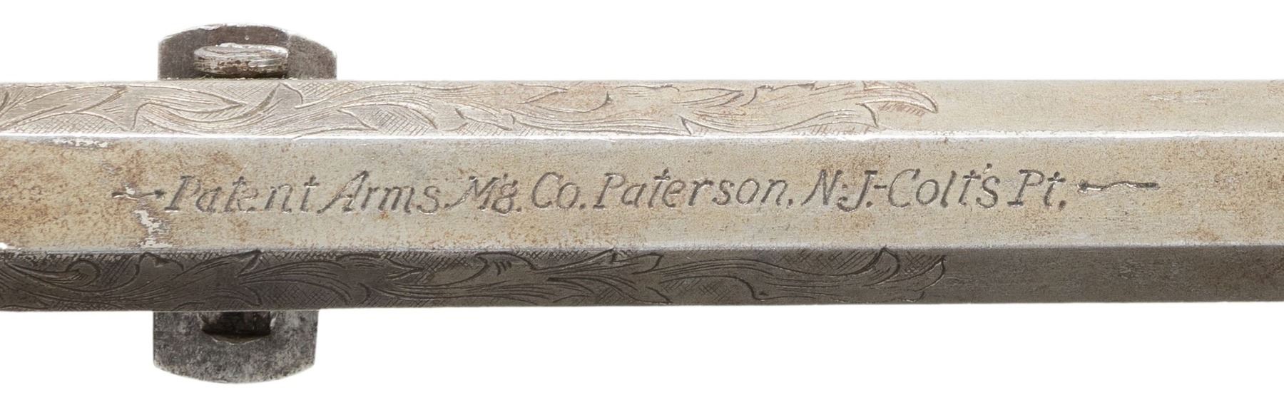 GRIPS. Cal. 31. S# 14. 5.5" octagonal barrel, address "Patent Arms Mg. Co. Paterson NJ-Colt's Pt", 5-shot cylinder with "COLT" centaur rolled scene. Matching S# 14 observed on cylinder, arbor, and frame. Unlike original Paterson design, no rotating cylinder ring. Thin scroll engraved, carved flared grips made with wood block. Revolver is accompanied by unmarked brass cylindrical Paterson style powder flask. CONDITION: good to very good overall, appears original & matching with refitting and filing at frame to barrel face, wedge is numbered 333 and too small, folding trigger appears to be old restoration. Revolver cocks fine, but cylinder advances short of next nipple, smooth clear bore. Accompanying flask is very good with functional plunger. PROVENANCE: The Esteemed Norm Greenberg Collection. (01-27659/JS). ANTIQUE. $2,000-4,000.