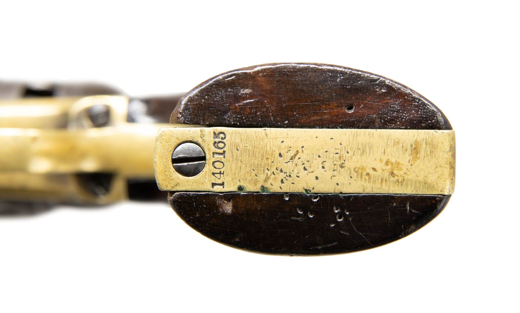 REVOLVER. Cal. 31. S# 140165. Standard configuration, 3" barrel without loading assembly, 2-line New York City address with brackets, small brass cone front sight, 5 shot cylinder with stagecoach holdup rolled scene, "COLTS PATENT" stamped on frame. Silver plated brass trigger guard & backstrap, varnished walnut grips. Manufactured 1858. CONDITION: very good overall, all original & matching, no finish, metal is overall gray/plum, mostly discerned cylinder scene, mechanics functional, good rifled bore with pitting. PROVENANCE: Estate Collection of John "Jack" Dhooghe. (01-28253/JS). ANTIQUE. $1,200-1,800.