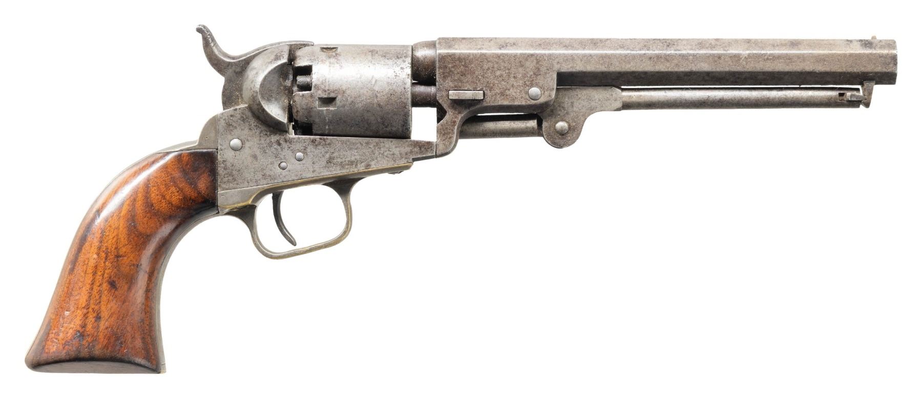 Cal. 31. S# 39682. Attractive 6" Colt pocket revolver was made in 1852. Standard configuration with two-line New York City address with brackets, small "COLTS PATENT" on left side of frame, mounted with varnished walnut grips. CONDITION: very good overall, all matching serial numbers, good "stagecoach robbery" rolled cylinder, all 5 functional safety pins, good discernible markings throughout. Grips have chipped toe on left side. Mechanics are crisp, with good rifled bore. PROVENANCE: Estate Collection of Nicholas Apergis. (01-27534/JS). ANTIQUE. $800-1,200.