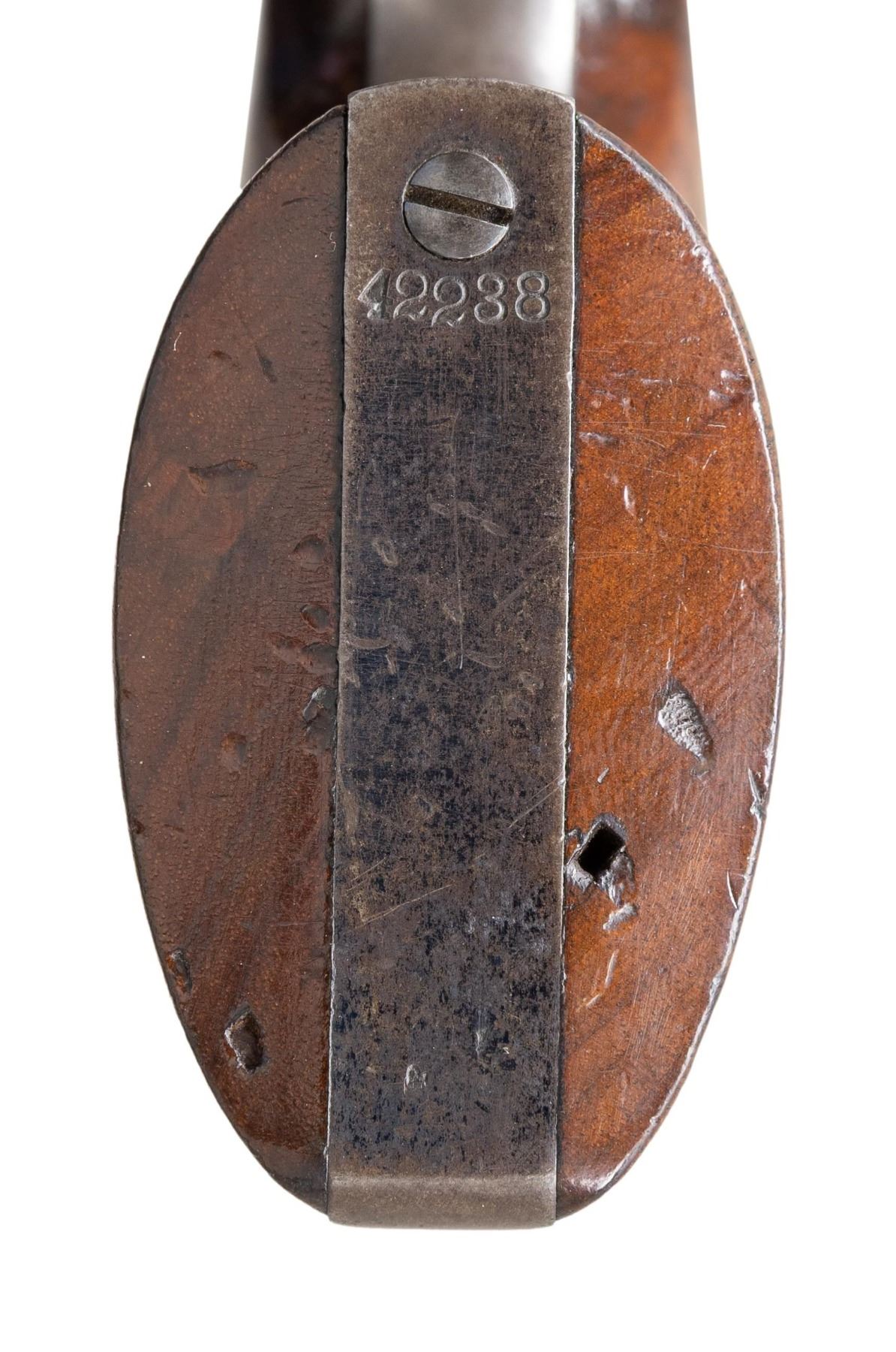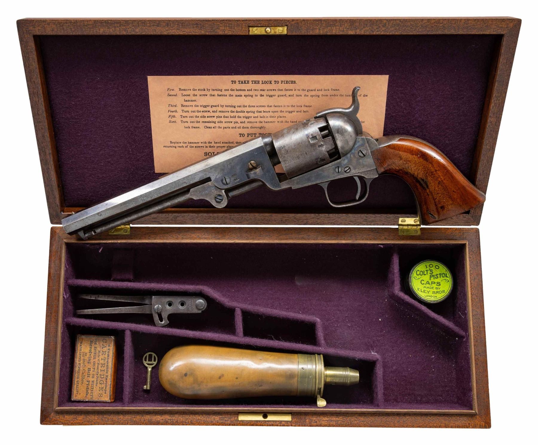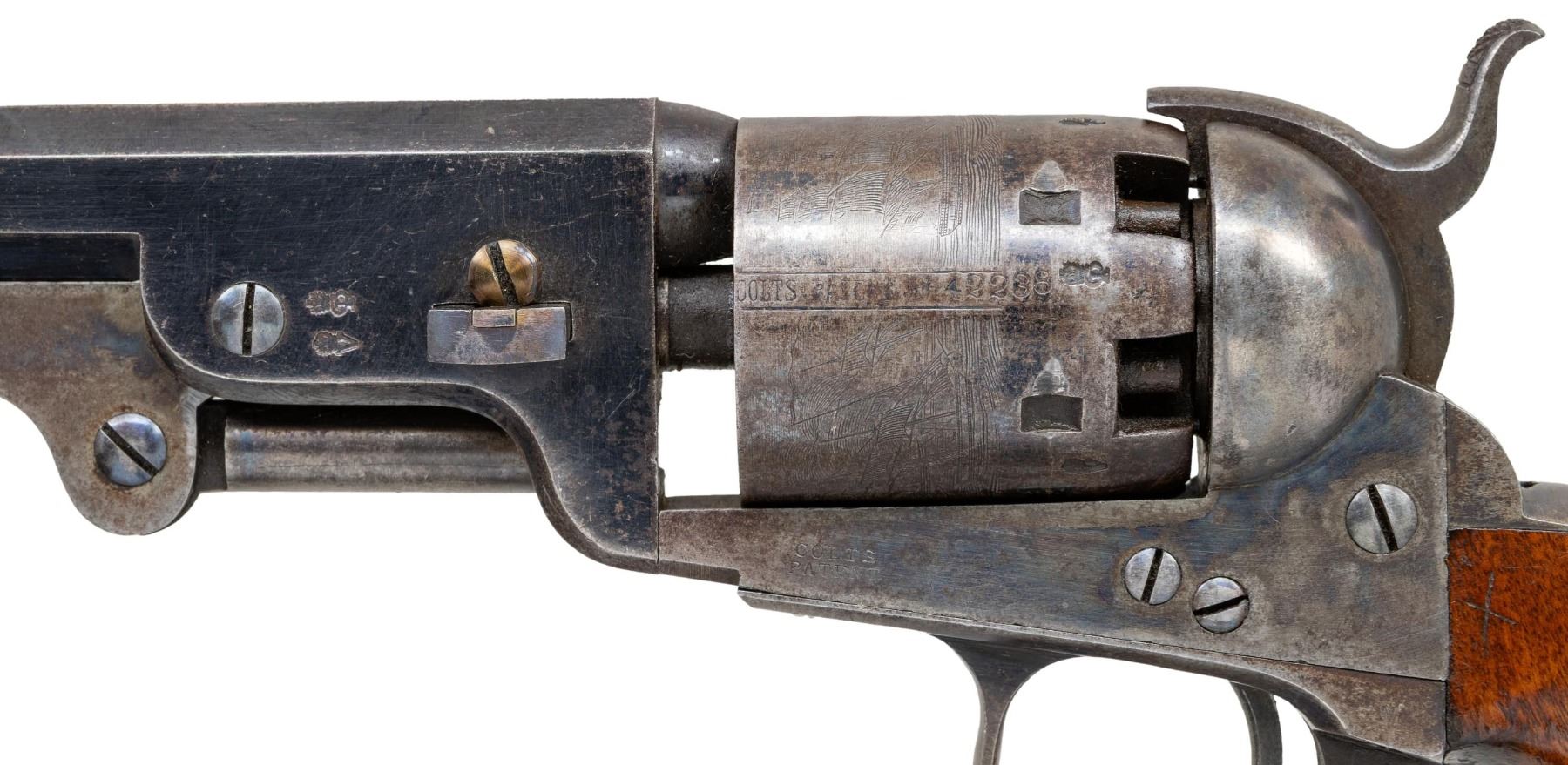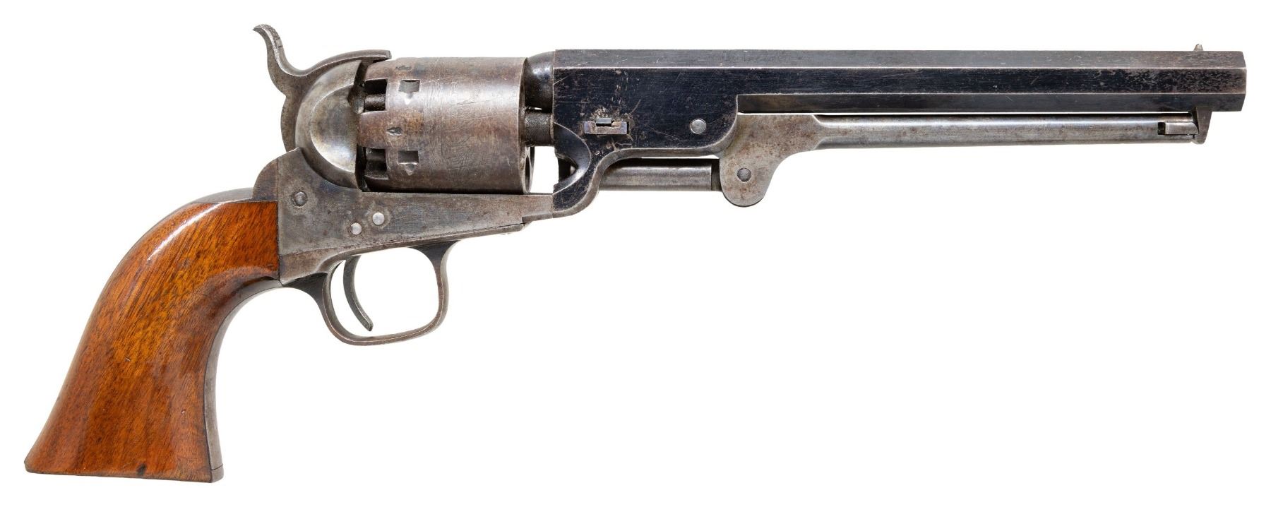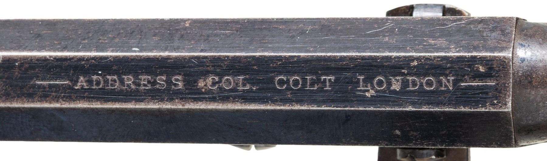 REVOLVER. Cal. 36. S# 42238. Standard configuration, steel back strap & trigger guard, 7.5" octagonal barrel marked "ADDRESS COL. COLT LONDON" with dashes, small brass cone shaped bead sight, 6-shot cylinder with rolled naval battle scene, varnished walnut grips. Revolver is blued and case hardened, British proofs on frame and each cylinder chamber. Manufactured 1856, most likely shipped to US in 1860-1861 prior to the Civil War. UNATTACHED ACCESSORIES: reproduction Colt casing, Colt 2-cavity mold, Dixson bag flask, cap tin with reproduction label. CONDITION: revolver is fine, retaining about 90% bright factory blue, cylinder has good cylinder scene with traces of blue. Frame, loading assembly, and hammer retain thin muted case colors, grips retain 90% original bright factory varnish with several scuffs. Crisp mechanics, very good rifled bore. PROVENANCE: The Esteemed Norm Greenberg Collection. (01-27642/JS). ANTIQUE. $3,000-4,000.
