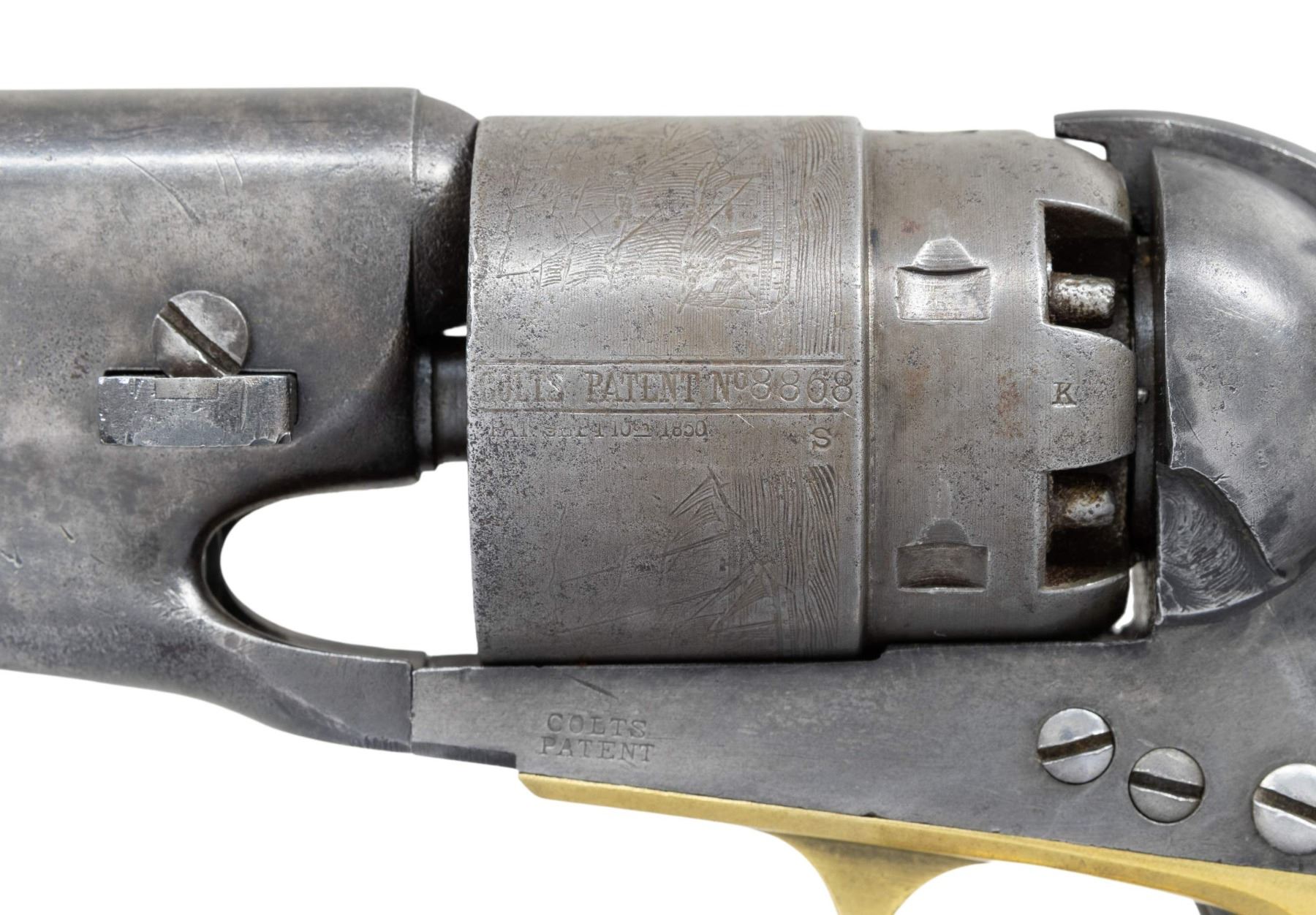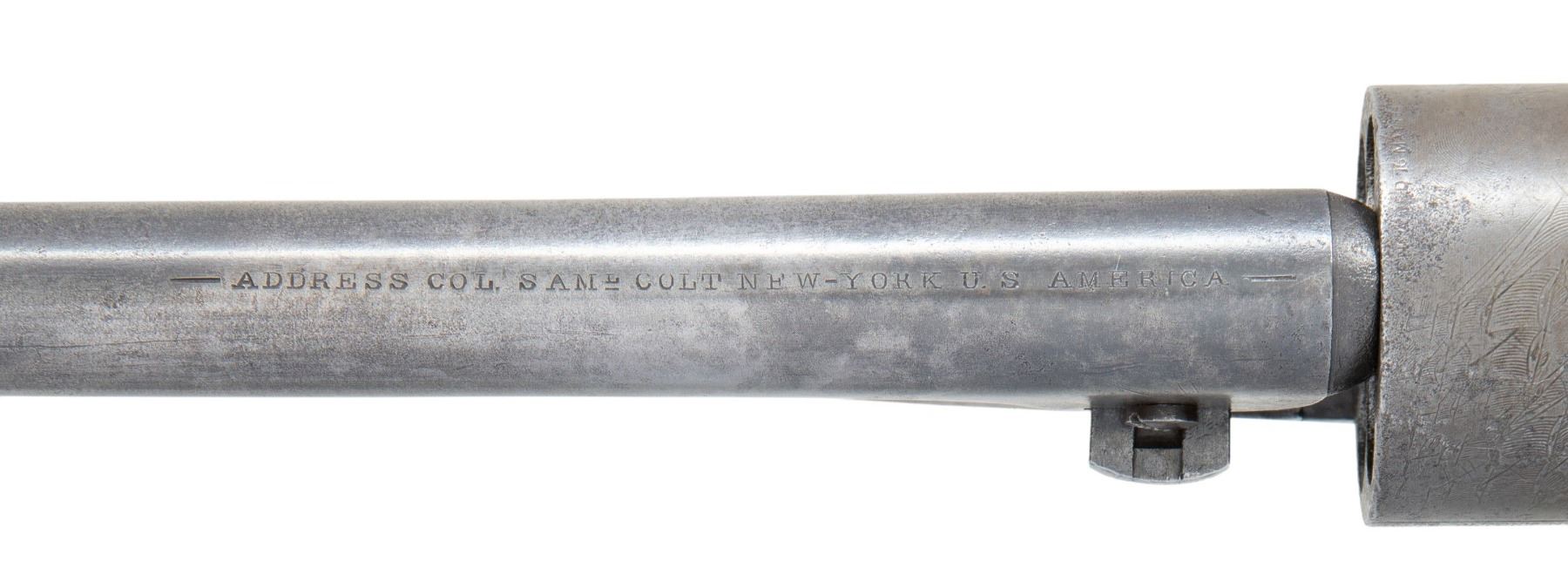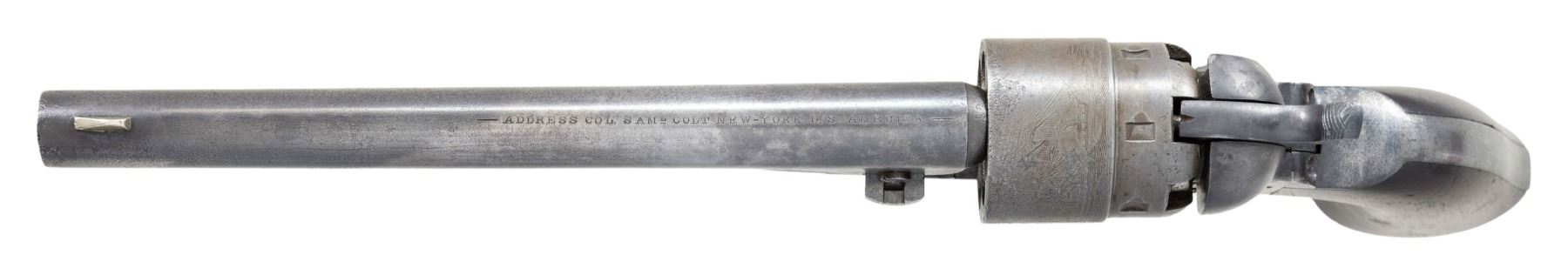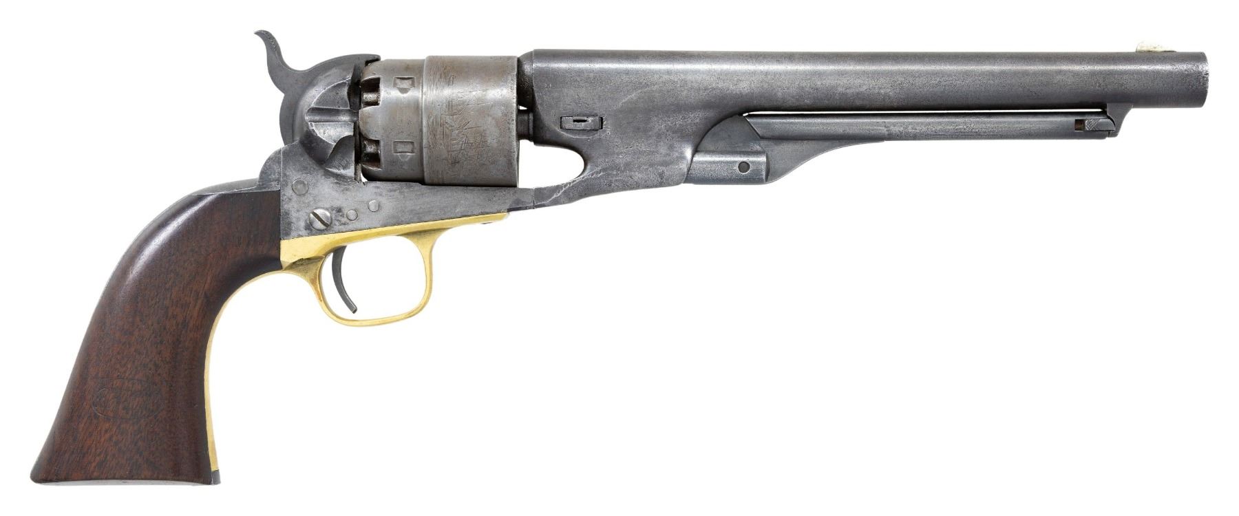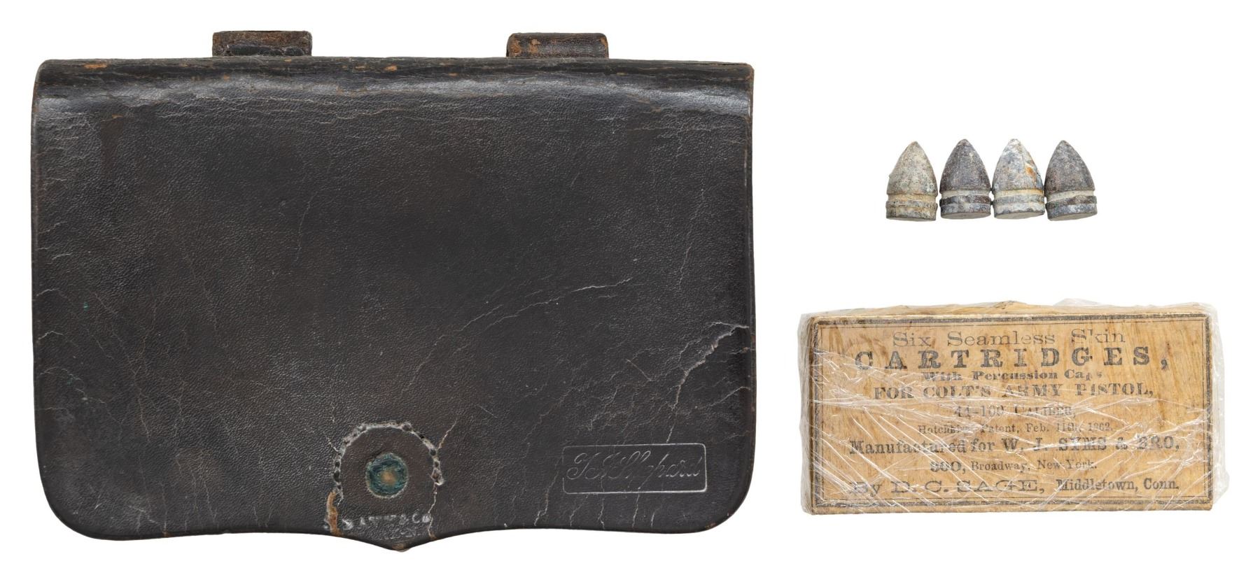REVOLVER. Cal. 44. S# 8868. The Colt 1860 army revolver had just been introduced at the beginning of the Civil War and over 100,000 were bought by the US government for use by cavalry, and no doubt the most popular sidearm of the day. This revolver was part of first 500 inspected for the army made in mid-1861, issued with shoulder stock. Revolver has 4-screw frame, notched steel backstrap, and milled recoil shields so stock could be attached. Standard configuration, 8" round barrel with rolled address "--ADDRESS COL. SAML COLT NEW-YORK U.S. AMERICA--", frame stamped on left "COLTS/PATENT", brass trigger guard. Cylinder has good rolled Texas Navy battle scene, "ENGAGED 16 MAY 1843." and "COLT'S PATENT No./PAT. SEPT 10th 1850". Good discernible inspection cartouches on grips "RHKW" [Robert HK Whiteley] & "GGS" [GG Saunders], and sub-inspection initials observed barrel "S", cylinder "S" and "K", back strap "K", trigger guard "S", and bottom of grips "K". Charles Pate in his 1860 Army revolver text sites a June 1, 1861 letter from Capt. R.H.K. Whiteley in charge of inspection of these early Colt New Model Army (NMA) revolvers to sub-inspector A.D. King stating that G.G. Saunders would be assisting. This is scarce survivor having sub-inspection and inspection cartouches of all 3 principals involved in Colts 1st army contract of NMA revolvers. Pate notes only 7 revolvers in his database at time of his books release in 2012 with Capt. R.H.K. Whiteley's inspection. This is a fine survivor of first issued New Model Army revolver with very good markings. UNATTACHED ACCESSORIES: Sealed pack of D.C. Sage cartridges for Colt's Army Pistol along with four excavated .44 cal. bullets dug in 1958 at East Cavalry Field, Gettysburg by our consignor. Period J. Davy & Co., Newark, NJ leather cartridge box marked on flap "T J Shepard". CONDITION: very good overall, all matching & complete, crisp markings, no finish but sharp cylinder scene and 5 of 6 complete safety pins, iron cleaned with overall mottled gray patina, brass has smooth yellow patina, good discernible inspection cartouches, mechanics crisp, sharp rifled bore. Cartridge box good overall with appropriate age craquelure. Stitching is tight. (01-28144/JS). ANTIQUE. $2,000-4,000.