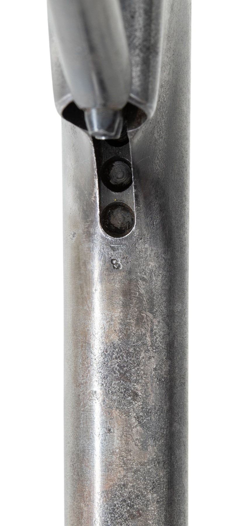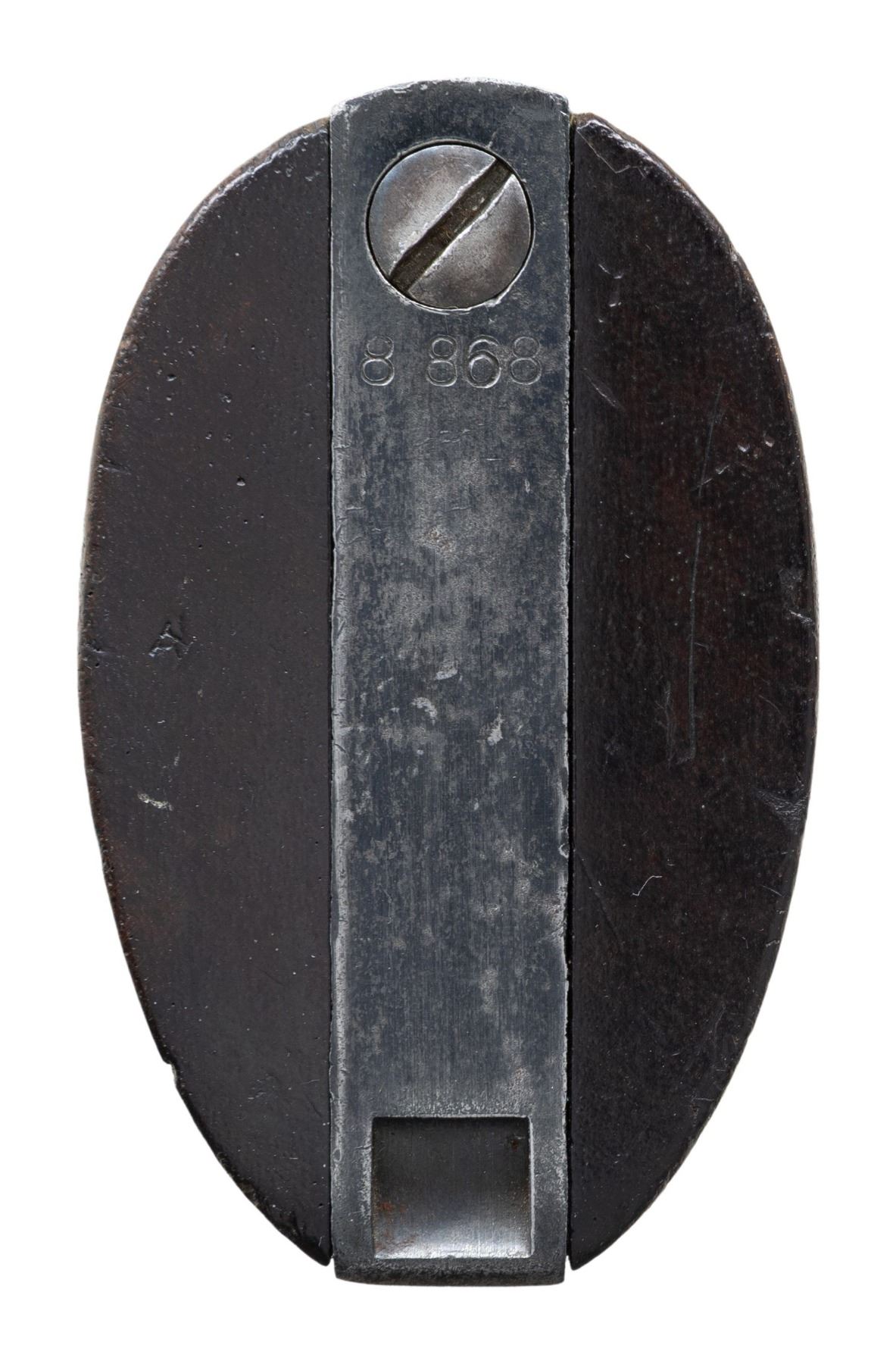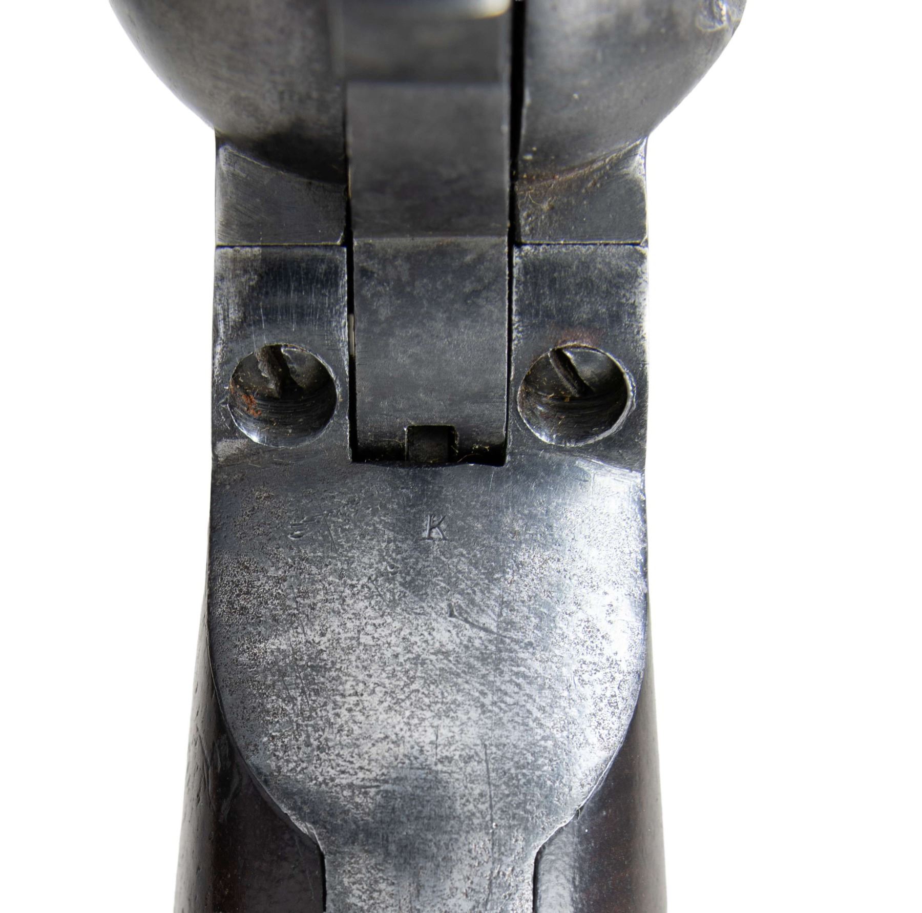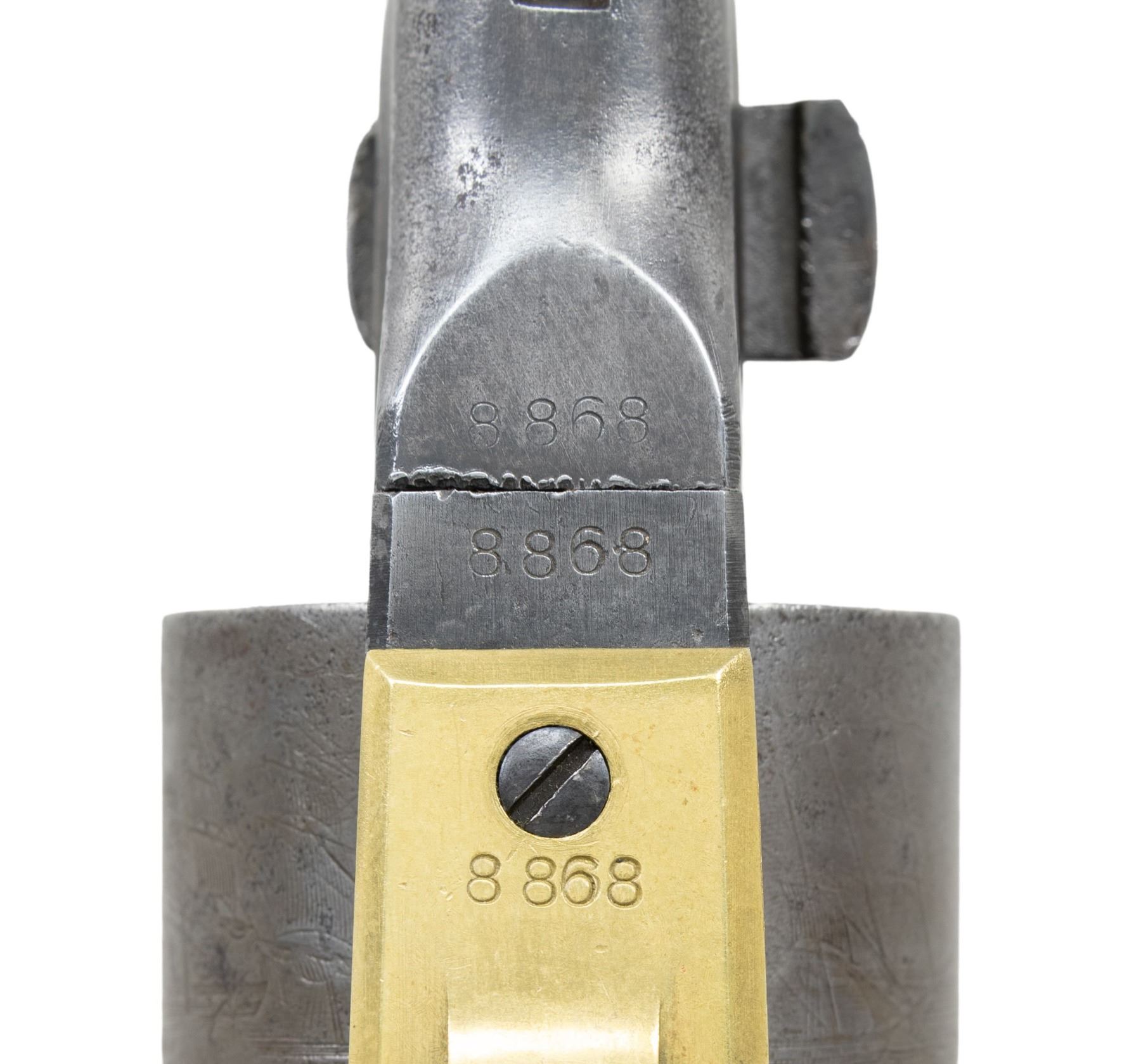 REVOLVER. Cal. 44. S# 8868. The Colt 1860 army revolver had just been introduced at the beginning of the Civil War and over 100,000 were bought by the US government for use by cavalry, and no doubt the most popular sidearm of the day. This revolver was part of first 500 inspected for the army made in mid-1861, issued with shoulder stock. Revolver has 4-screw frame, notched steel backstrap, and milled recoil shields so stock could be attached. Standard configuration, 8" round barrel with rolled address "--ADDRESS COL. SAML COLT NEW-YORK U.S. AMERICA--", frame stamped on left "COLTS/PATENT", brass trigger guard. Cylinder has good rolled Texas Navy battle scene, "ENGAGED 16 MAY 1843." and "COLT'S PATENT No./PAT. SEPT 10th 1850". Good discernible inspection cartouches on grips "RHKW" [Robert HK Whiteley] & "GGS" [GG Saunders], and sub-inspection initials observed barrel "S", cylinder "S" and "K", back strap "K", trigger guard "S", and bottom of grips "K". Charles Pate in his 1860 Army revolver text sites a June 1, 1861 letter from Capt. R.H.K. Whiteley in charge of inspection of these early Colt New Model Army (NMA) revolvers to sub-inspector A.D. King stating that G.G. Saunders would be assisting. This is scarce survivor having sub-inspection and inspection cartouches of all 3 principals involved in Colts 1st army contract of NMA revolvers. Pate notes only 7 revolvers in his database at time of his books release in 2012 with Capt. R.H.K. Whiteley's inspection. This is a fine survivor of first issued New Model Army revolver with very good markings. UNATTACHED ACCESSORIES: Sealed pack of D.C. Sage cartridges for Colt's Army Pistol along with four excavated .44 cal. bullets dug in 1958 at East Cavalry Field, Gettysburg by our consignor. Period J. Davy & Co., Newark, NJ leather cartridge box marked on flap "T J Shepard". CONDITION: very good overall, all matching & complete, crisp markings, no finish but sharp cylinder scene and 5 of 6 complete safety pins, iron cleaned with overall mottled gray patina, brass has smooth yellow patina, good discernible inspection cartouches, mechanics crisp, sharp rifled bore. Cartridge box good overall with appropriate age craquelure. Stitching is tight. (01-28144/JS). ANTIQUE. $2,000-4,000.