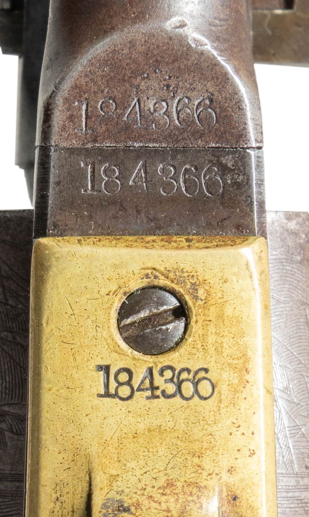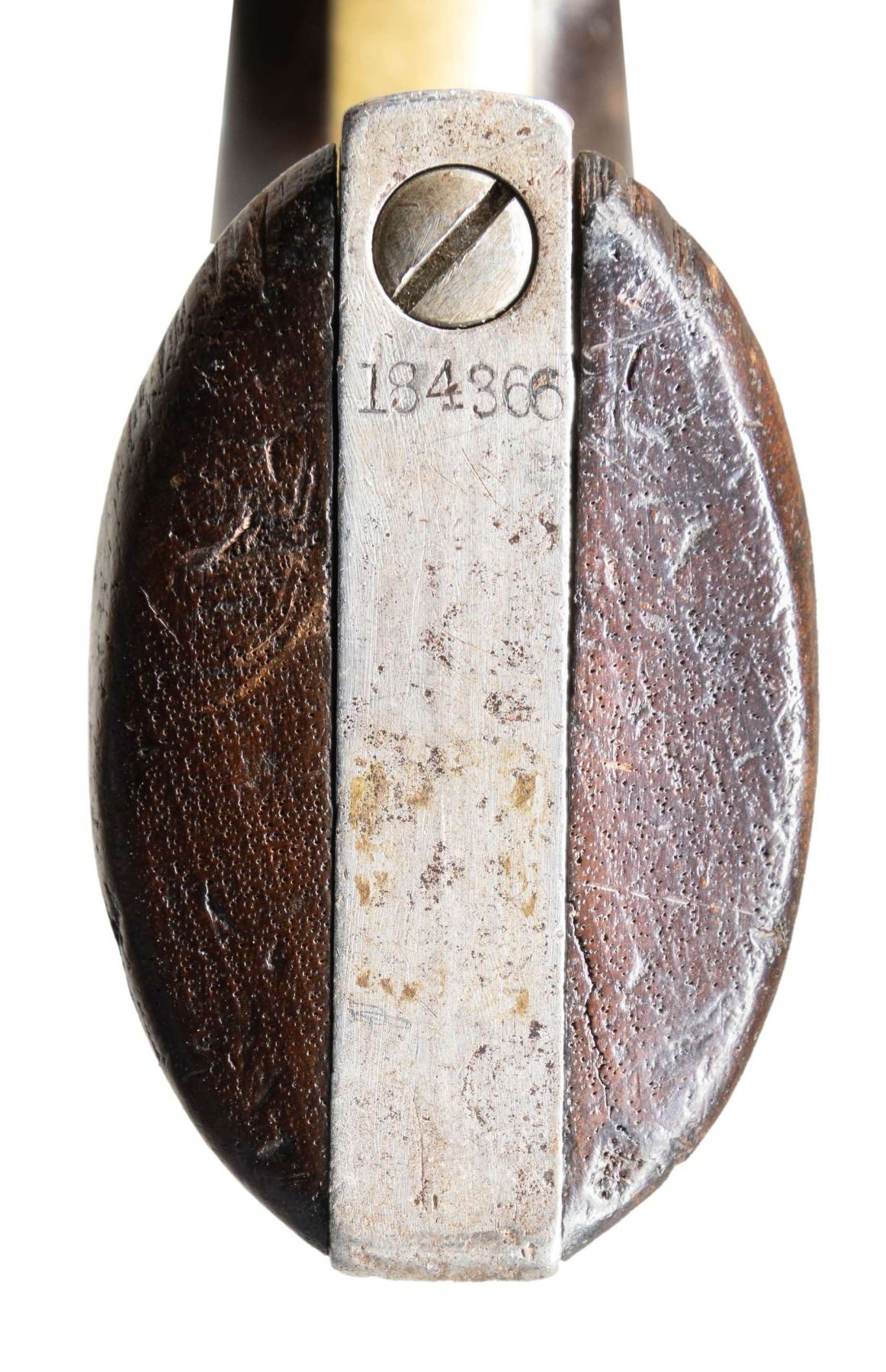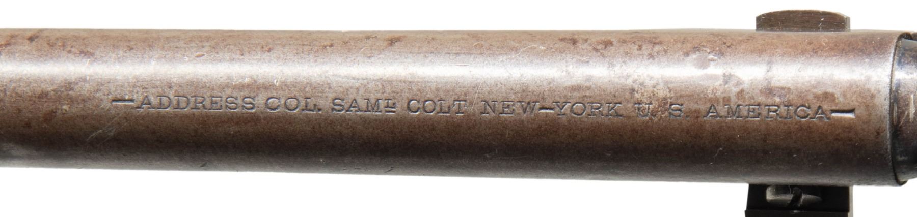 Cal. 44. S# 184366. Revolver is in standard configuration, 8" barrel with one line New York US America address, manufactured 1869-1870 based on serial number. Colt was altering revolvers in this serial range to cartridge, percussion revolvers in this range are scarcer than cartridge alterations. CONDITION: good overall, good markings, wedge and nipples are replaced, traces of finish in protected areas, scattering pitting, good rolled naval battle scene, grips well fit with moderate to heavy edge wear. Mechanics fine, good rifled bore. PROVENANCE: The Esteemed Norm Greenberg Collection. (01-27669/JS). ANTIQUE. $1,000-1,500.
