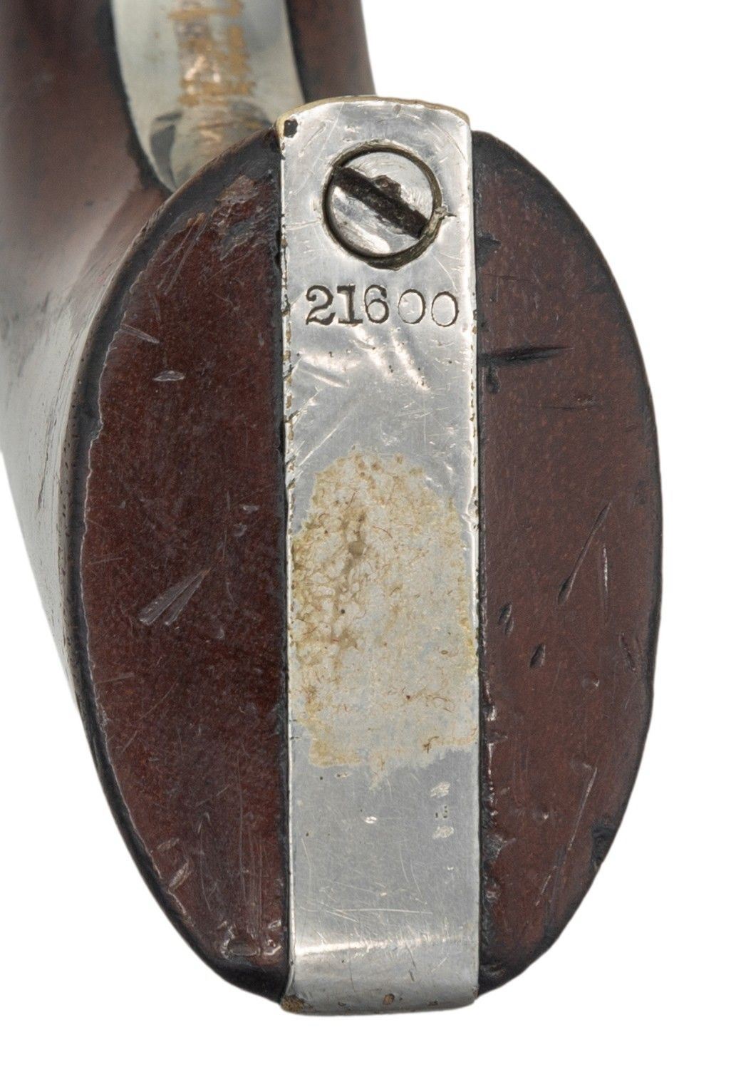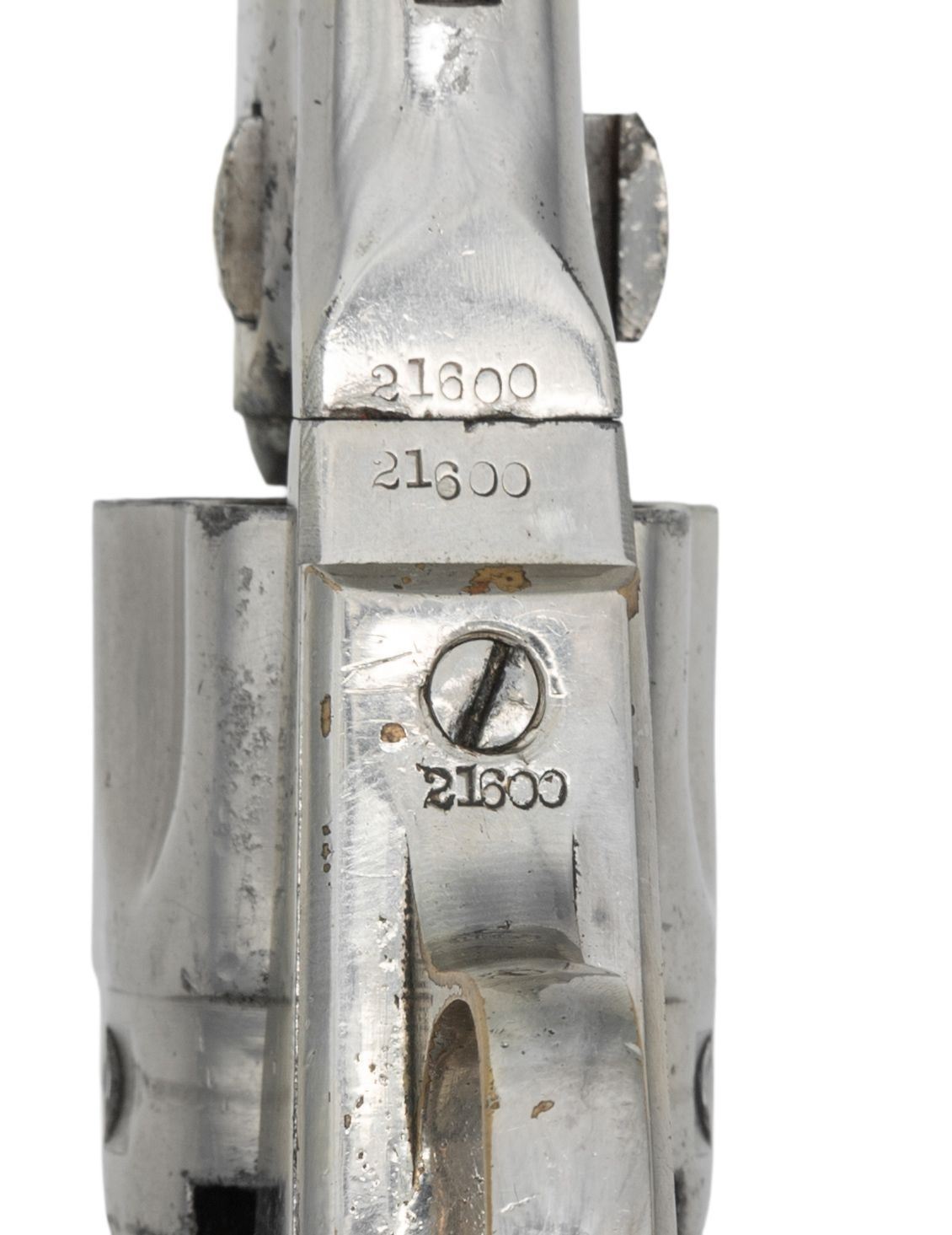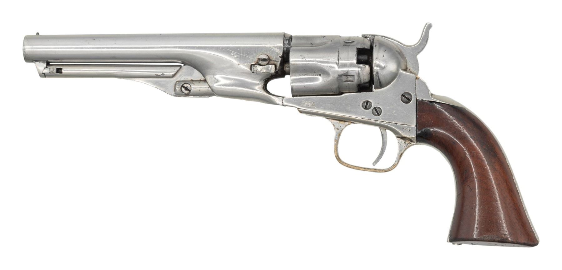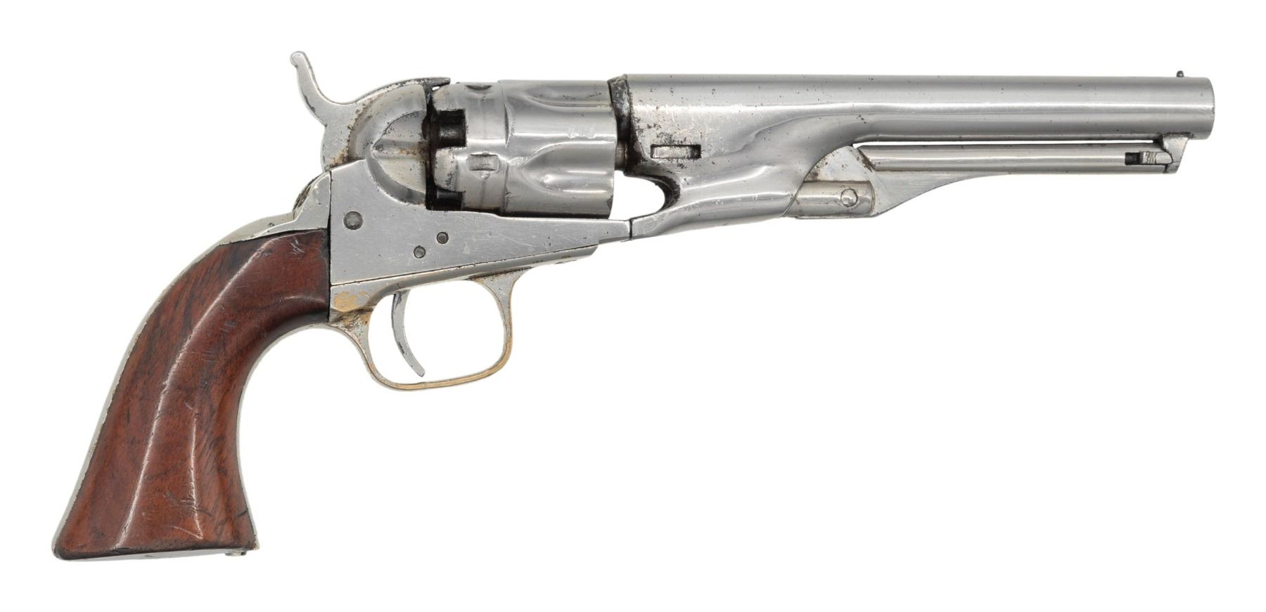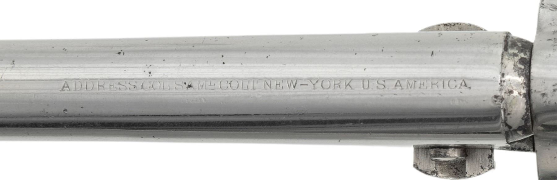 Cal. 36. S# 21600. Standard configuration made during Civil War in 1863, nickel. 5.5" round barrel with 1-line NEW YORK US AMERICA address, small "COLT'S / PATENT" right side of frame, fluted 5-shot cylinder with patent stamp in one flute. Brass trigger guard and backstrap hold varnished walnut grips. Revolver is housed in reproduction Colt-style casing compartmented for eagle powder flask, 2-cavity "COLTS PATENT" marked mold, UMC cap tin, and loose balls. CONDITION: very good overall, all matching and complete, retains over most of an old nickel finish. Grips retained 90% of their bright original factory varnish. Mechanics need attention, hammer cocks, but cylinder does not rotate, good rifled bore. Reproduction casing is fine, original eagle flask is very good and scarce maker marked "Frary, Benhan & Co", mold is good. PROVENANCE: The Esteemed Norm Greenberg Collection. (01-27662/JS). ANTIQUE. $800-1,200.