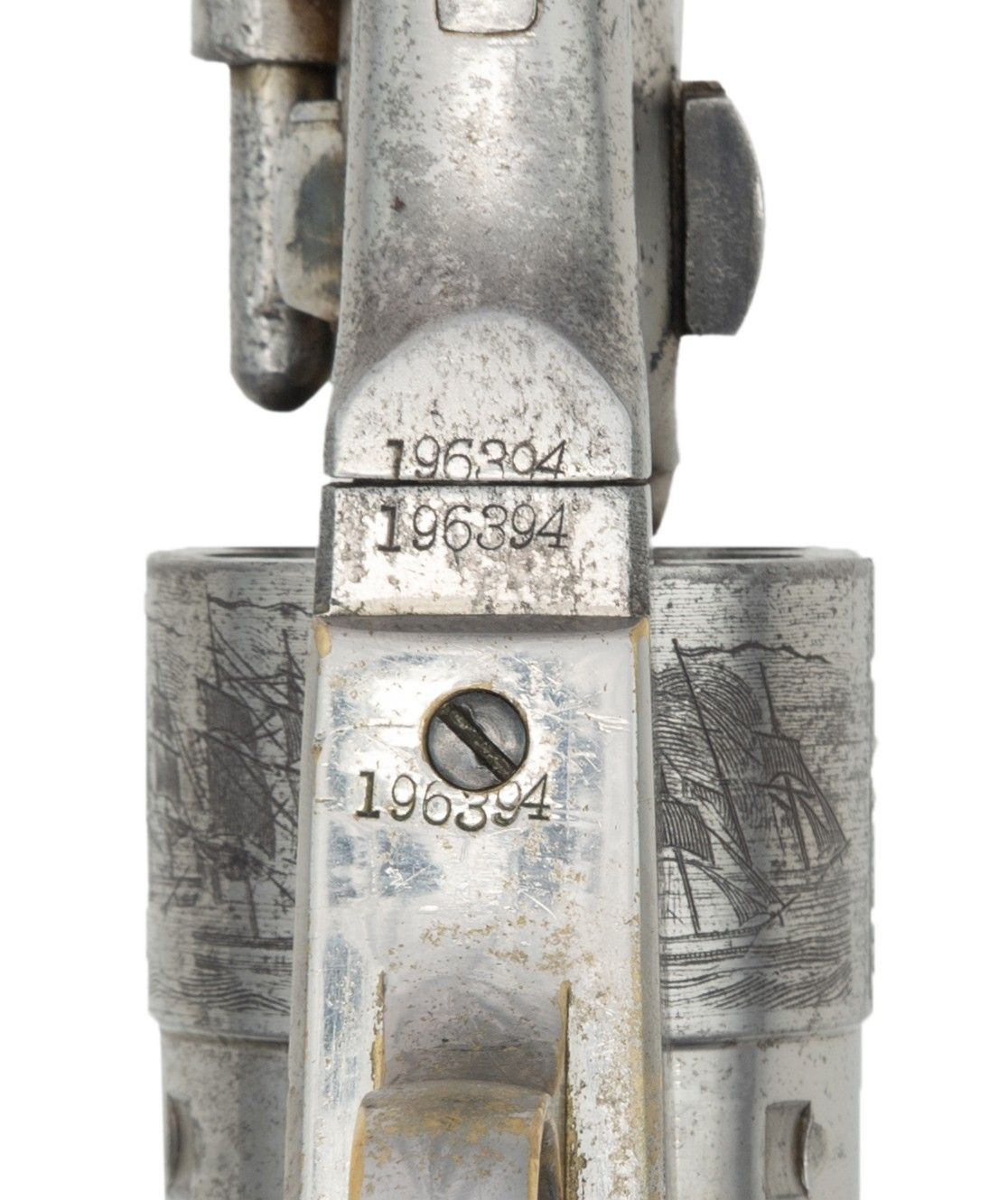 ARMY REVOLVER. Cal. 44CF. S# 196394. Standard configuration, 8" barrel, 1-line New York address, nickel, ejector mounted on right side, 6-shot rebated cylinder with naval battle scene, conversion ring, loading gate with external spring, 2-line patent with dashes on left side of frame, varnished walnut grips. Manufactured mid 1870s simultaneous with first single actions. These are the first of cowboy era revolvers. CONDITION: fine overall, retaining about 90% original factory nickel, good marking, fine mechanics, crisp shiny bore. (01-28165/JS). ANTIQUE. $5,000-7,000.