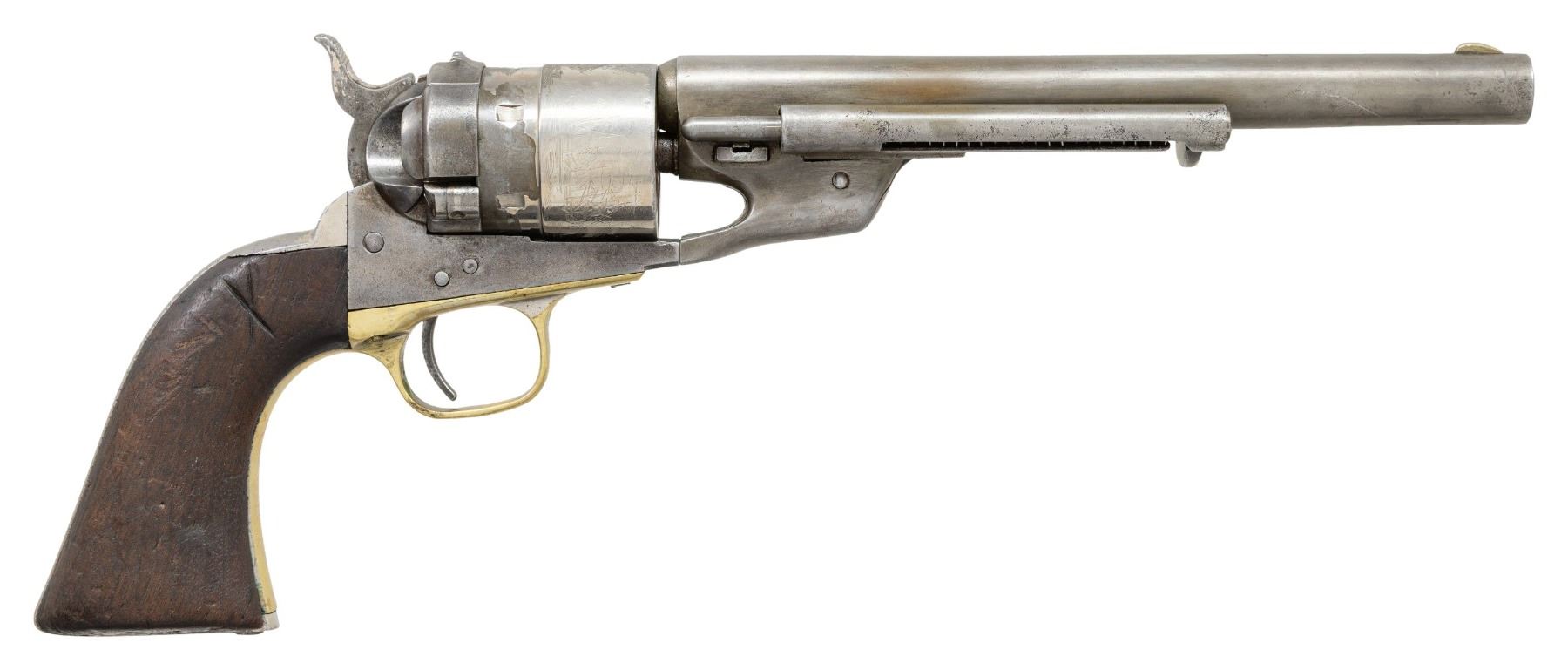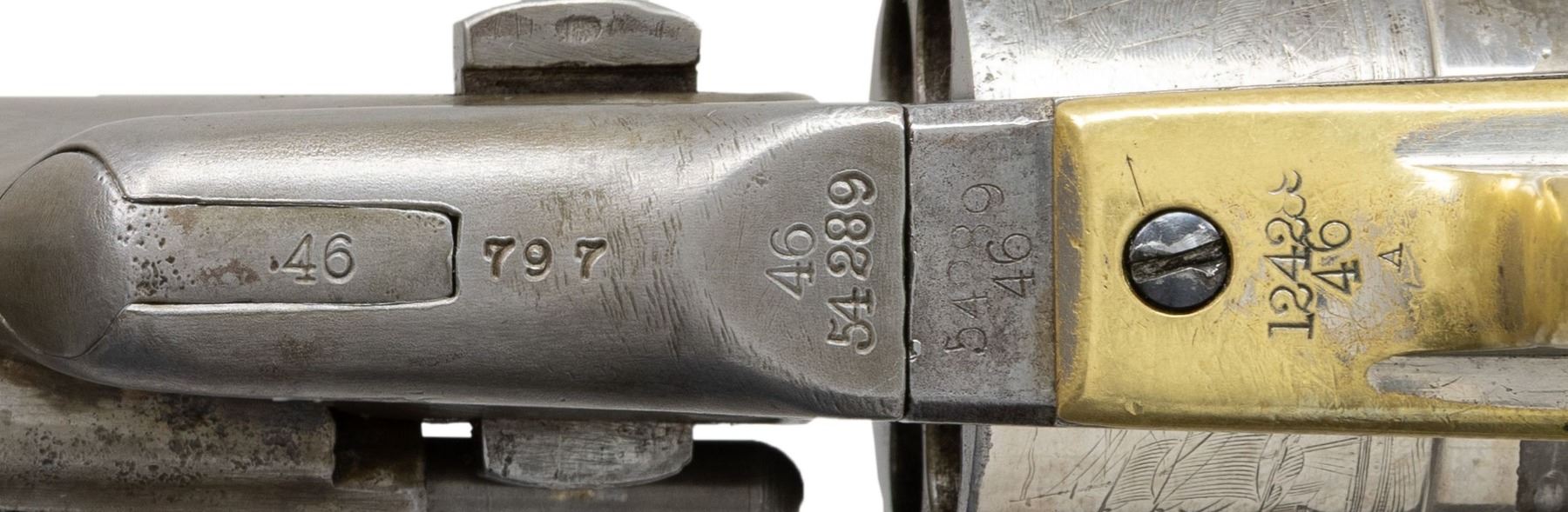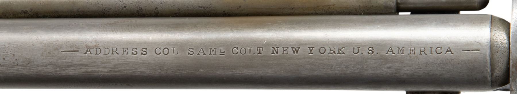 Cal. 44CF. S# 54289. This revolver has added fake "U.S." and assembly numbers to pass off as scarce US martial alteration, mixed S#s 124289 on trigger guard. 7 7/8" barrel, cut from 8". CONDITION: good as altered and restored, address and barrel S# are re-engraved, S# on iron backstrap is re-engraved also, grips well worn, no finish other than nickel on cylinder, mechanics functional, good shiny rifled bore. (01-28188/JS). ANTIQUE. $1,000-1,500.