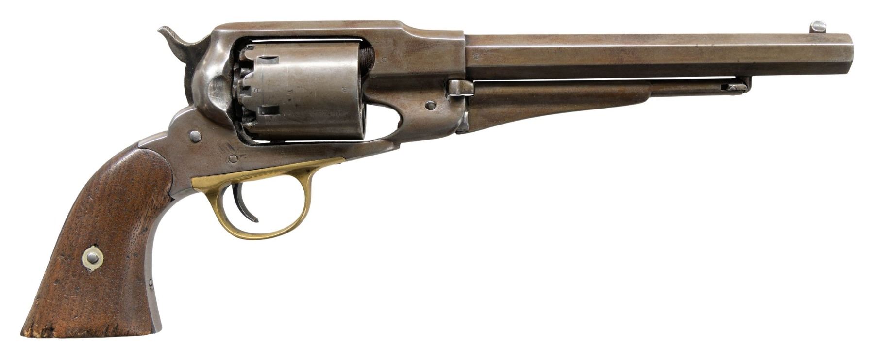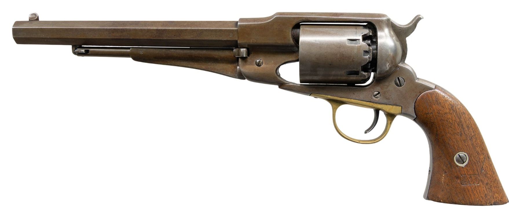 REVOLVER. Cal. 44. S# 92303. Standard configuration, 8" octagon barrel, 3-line address, solid steel frame and integral grip strap, brass trigger guard, 2-piece walnut grips with inspection cartouche. CONDITION: very good overall, crisp markings, inspection initials on most parts and good cartouche on left grip. Mechanics crisp, crisp shiny rifled bore. (01-27899/JS). ANTIQUE. $1,200-1,500.
