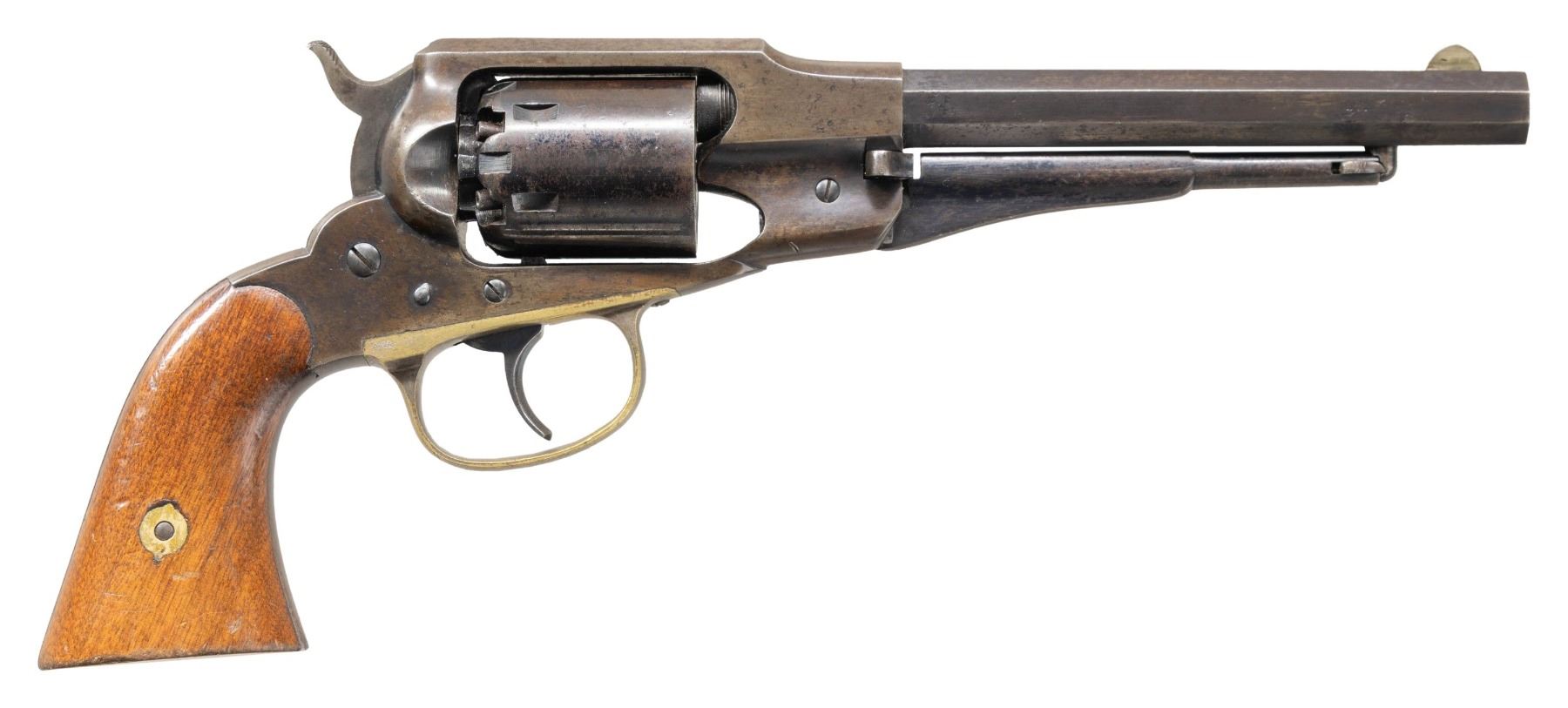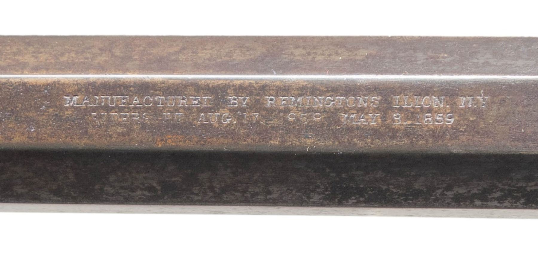 NAVY REVOLVER. Cal. 36. S# 3203. This revolver made right after the Civil War & is difficult to find in original percussion, as most were factory converted to 38 caliber cartridge. This fine example is in standard configuration, 6.5" octagonal barrel with 2-line marking "MANUFACTURED BY REMINGTON'S, ILION, N.Y. / RIDER'S PT. AUG. 17, 1858, MAY 3, 1859", German silver round blade front sight, blue & case colored finish, varnished walnut grips. CONDITION: fine overall, barrel & cylinder retain much of their original bright blue with flaking, frame has traces of blue and overall toned patina, hammer retains some muted case colors, trigger has about half its original fire blue. Grips are well fit retaining about 90% original factory varnish. Mechanics are fine, bright crisp rifled bore. (01-28523/JS). ANTIQUE. $1,000-2,000.
