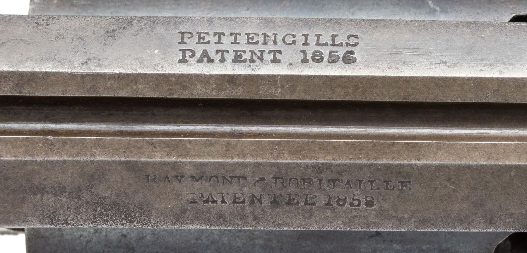 Cal. 44. S# 1755. This unique solid frame hammerless double action revolver was made in small quantities 1862-1863. Several hundred were issued to Michigan cavalry units. Standard configuration. Top of frame marked "PETTENGILLS / PATENT 1858" & "RAYMOND & ROBITAILLE / PATENTED 1858", 7.5" octagonal barrel, bottom of frame stamped "PATENTED / NOV 4, 1862", flared wood grips. CONDITION: very good to fine overall, retaining about 10% original finish, balance silver/gray, grips sound. PROVENANCE: Estate Collection of John "Jack" Dhooghe. (01-28251/JS). ANTIQUE. $3,000-4,000.