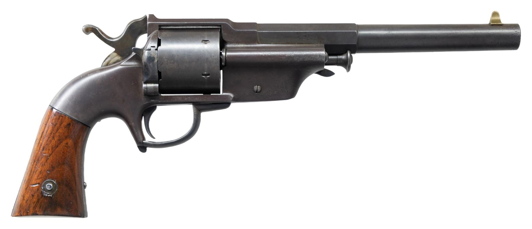 ARMY REVOLVER. Cal. 44. S# 307. Large frame, 13.5" overall, 7.5" half octagon to round barrel, 6-shot cylinder with notches for cartridge lips at rear wall, made 1861-1862 and there are thought to be no more than 250 made, production ended due to patent infringement lawsuit brought by Smith & Wesson. Very similar to center hammer percussion army, that were purchased by US government in the Civil War and produced after this rare model. CONDITION: very good overall, thin blue retained on barrel, overall plum patina, crisp markings, grips retain most of their high polish varnish, mechanically fine, bright shiny rifled bore. PROVENANCE: The Esteemed Norm Greenberg Collection. (01-27636/JS). ANTIQUE. $2,000-3,000.