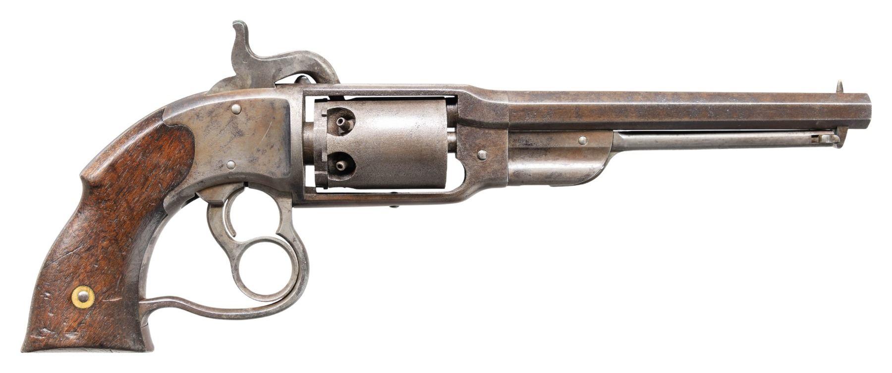 REVOLVER. Cal. 36. NSN. Bbl 7 1/8" oct with brass cone front sight. Top strap has 3-line address marking with January 16, 1859 and May 1860 patent dates. 6-shot rnd cyl. Distinctive action is known as 'figure 8' because of the ring shape lever and heart shape trigger guard. 2-pc walnut grips. Estimated quantity of 20,000 mfg 1861-mid 1860s. UNATTACHED ACCESSORIES: collector made modern case with glass lid and green felt fitted interior. Case contains powder flask, 1 cavity bullet mold, nipple wrench, cap tin, modern box of 6 paper Navy size pistol cartridges. Also includes modern stag handle cleaning rod and nipple pick. CONDITION: metal has gray appearance with scattered pitting. Grips have dark worn appearance with small dents and marks at toe and heel. Functioning action. Lightly pitted bore has intact rifling. (01-28544/DS). ANTIQUE. $1,500-2,000.