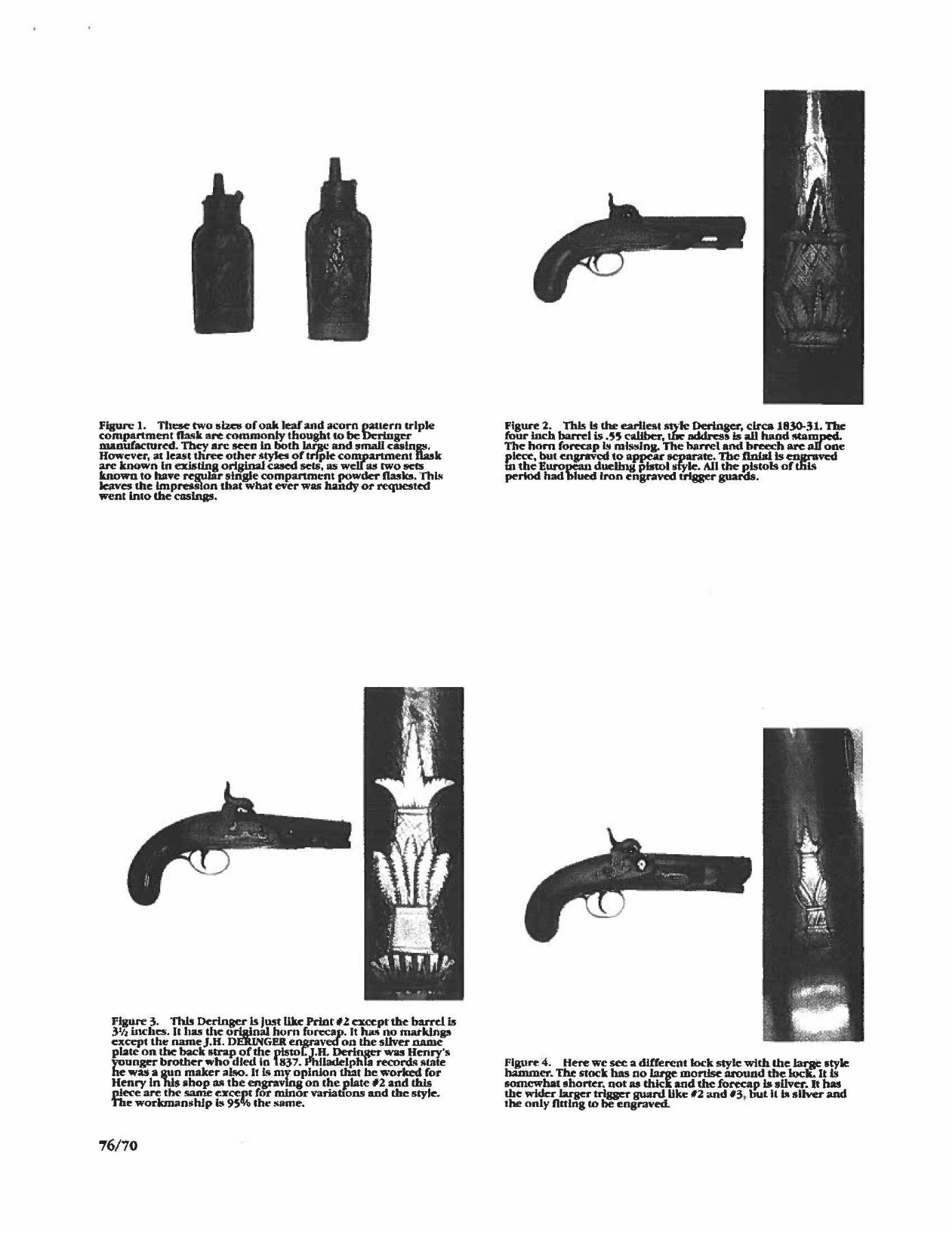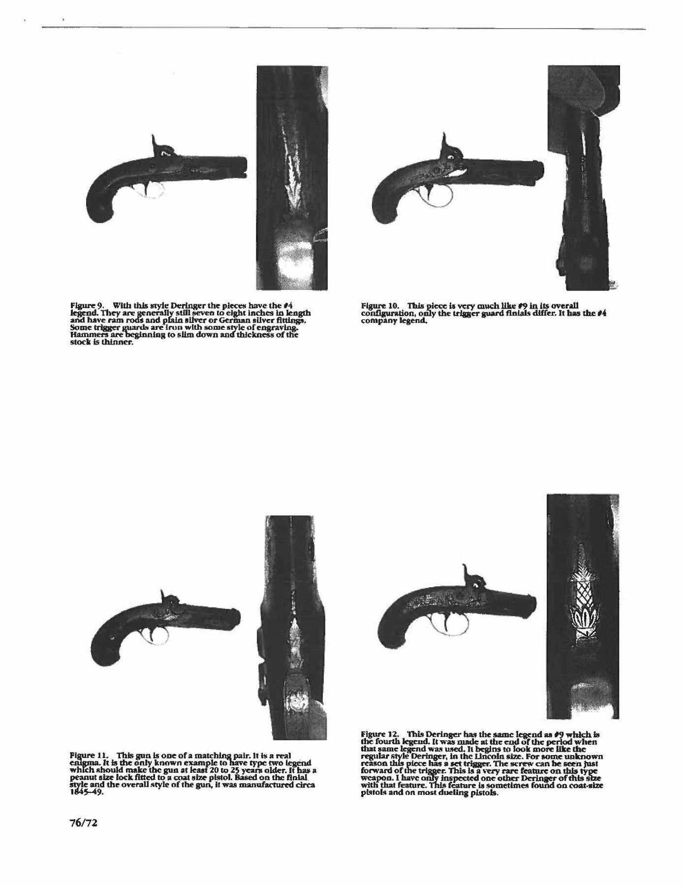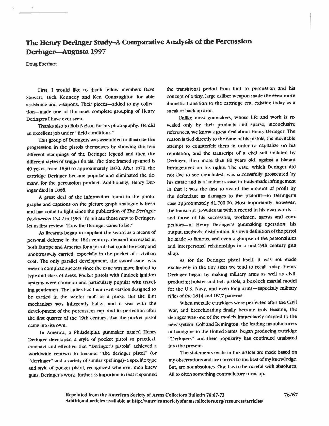Cal. 45. NSN. 5.5" overall, 1 7/8" barrel, breech and back action lock stamped "DERINGER / PHILADEL'A", German silver mounted, checkered walnut stock. This pistol is pictured in 1997 Doug Eberhart "THE HENRY DERINGER STUDY-A COMPARATIVE ANALYSIS OF THE PERCUSSION DERINGER", figure 15. UNATTACHED ACCESSORIES: copy of 1997 ASAC article by Doug Eberhart, "THE HENRY DERINGER STUDY" showing this pistol. CONDITION: good to very good overall, iron patina, mechanics fine, good 7-groove rifled bore. PROVENANCE: Doug Eberhart collection; The Esteemed Norm Greenberg Collection. (01-27609/JS). ANTIQUE. $800-1,200.