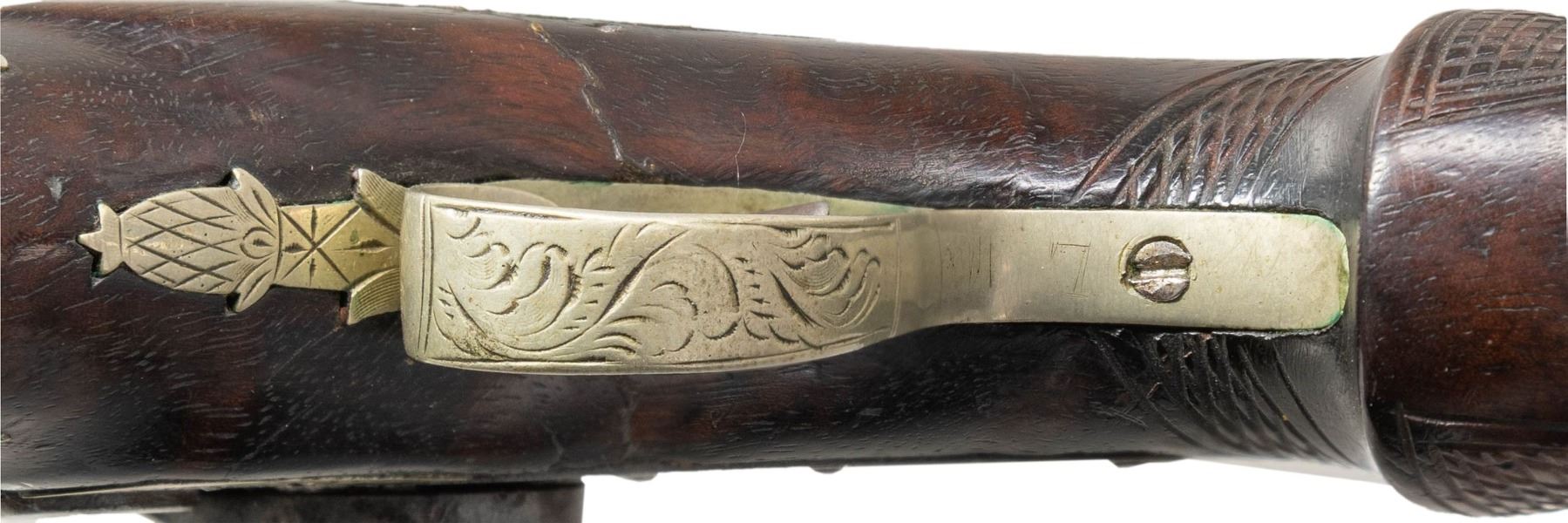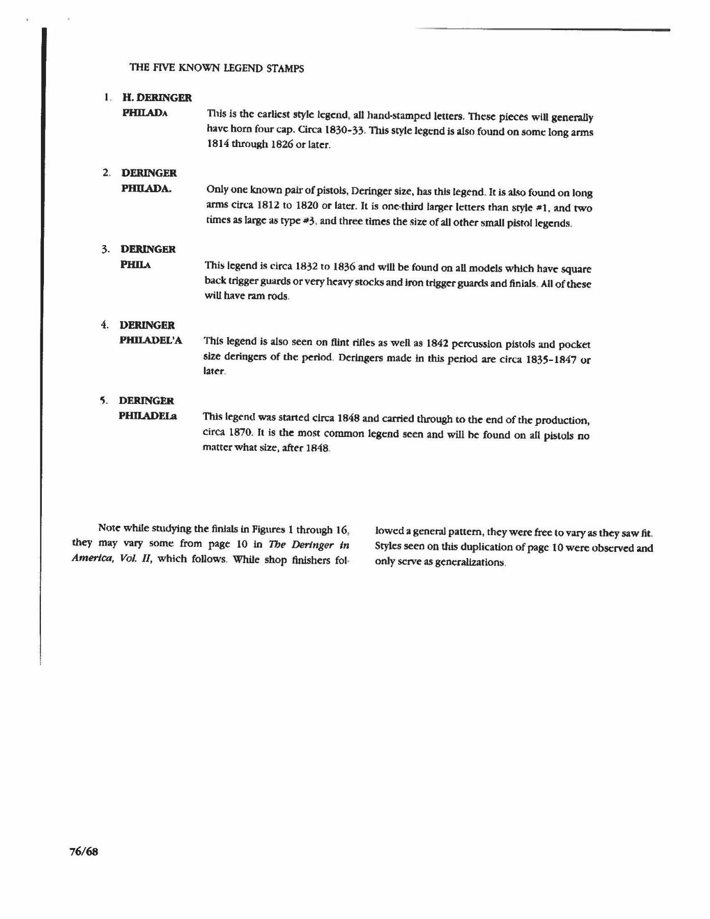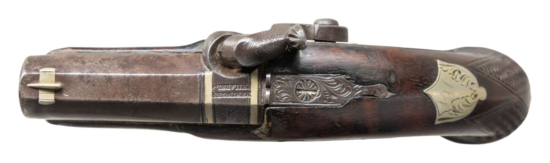 Cal. 45. NSN. 5.5" overall, 1 7/8" barrel, breech and back action lock stamped "DERINGER / PHILADEL'A", German silver mounted, checkered walnut stock. This pistol is pictured in 1997 Doug Eberhart "THE HENRY DERINGER STUDY-A COMPARATIVE ANALYSIS OF THE PERCUSSION DERINGER", figure 15. UNATTACHED ACCESSORIES: copy of 1997 ASAC article by Doug Eberhart, "THE HENRY DERINGER STUDY" showing this pistol. CONDITION: good to very good overall, iron patina, mechanics fine, good 7-groove rifled bore. PROVENANCE: Doug Eberhart collection; The Esteemed Norm Greenberg Collection. (01-27609/JS). ANTIQUE. $800-1,200.
